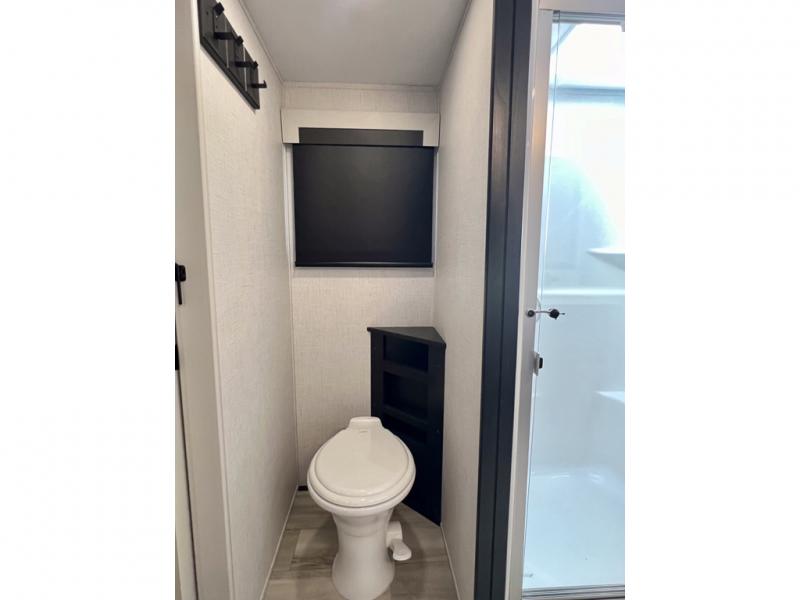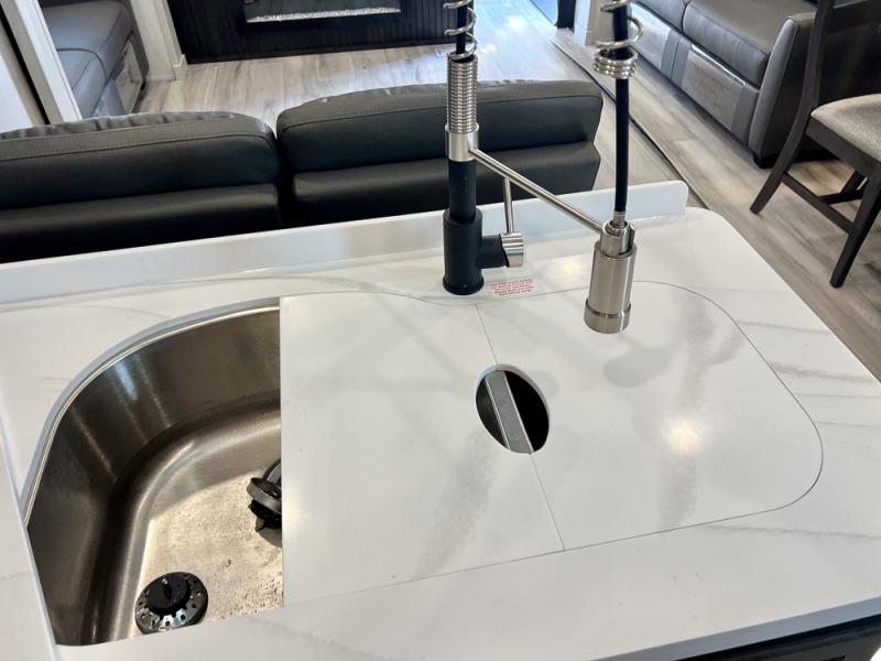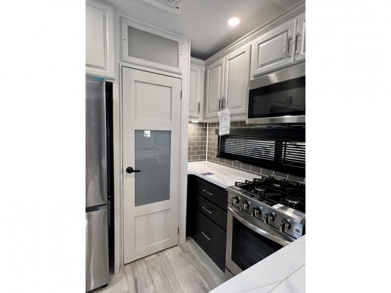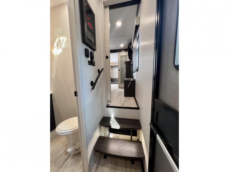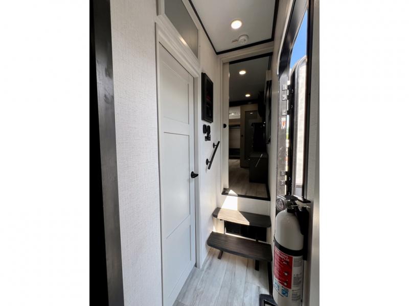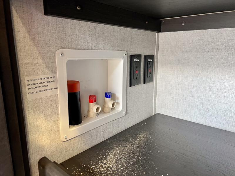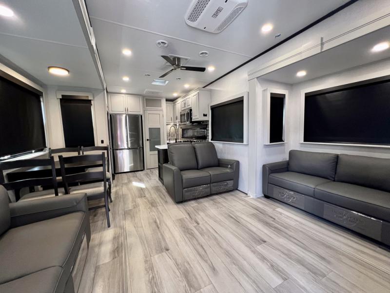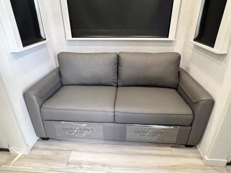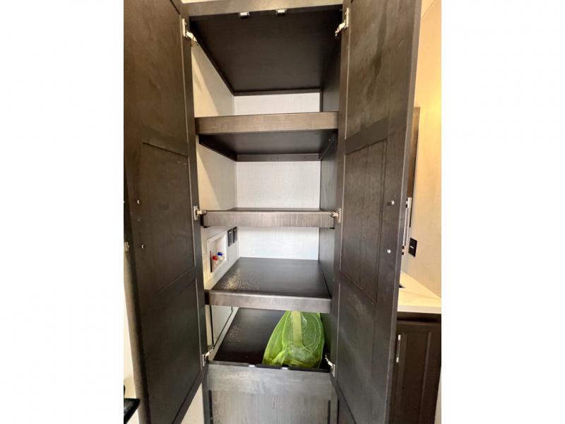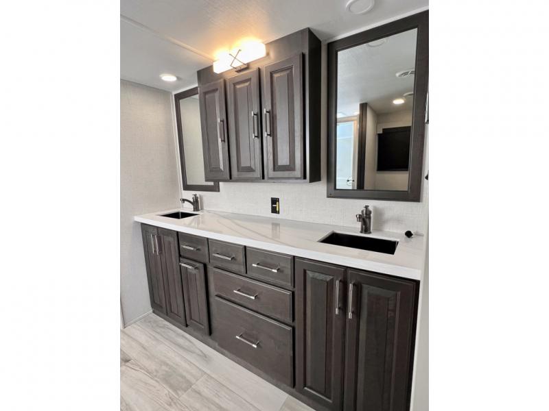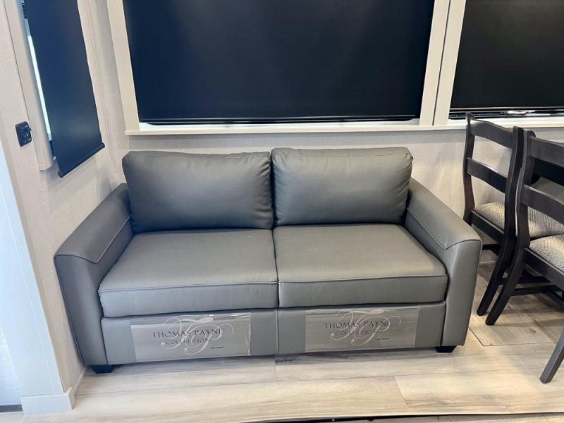 With a bath and a half, it's a clean decision to take this fifth wheel with you on your next camping trip! One of the dual entry doors leads directly into the rear kitchen which has a large pantry and an 18 cu. ft. residential refrigerator to store your food items. The free standing dinette and tri-fold sofa sleeper slide and opposing tri-fold sofa sleeper slide opens up the middle living area for more interior space. The half bathroom is conveniently located straight in through the main entry and features washer and dryer prep for clean clothes throughout your entire trip. The master suite not only has a king bed slide with storage underneath and a bench next to a dresser, but also access into the front full bathroom which has a dual sink vanity, a shower with a seat, and a toilet with privacy walls!
