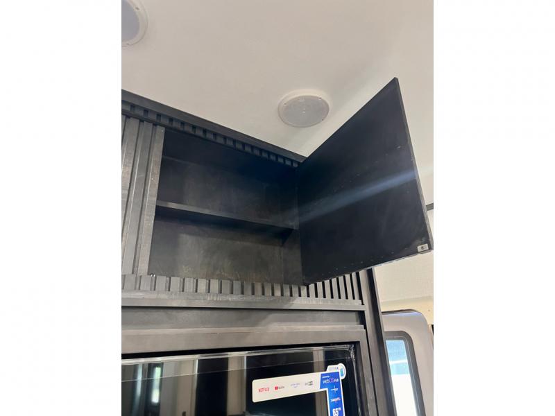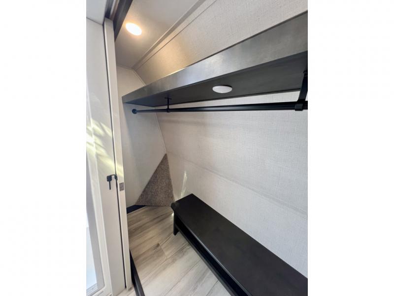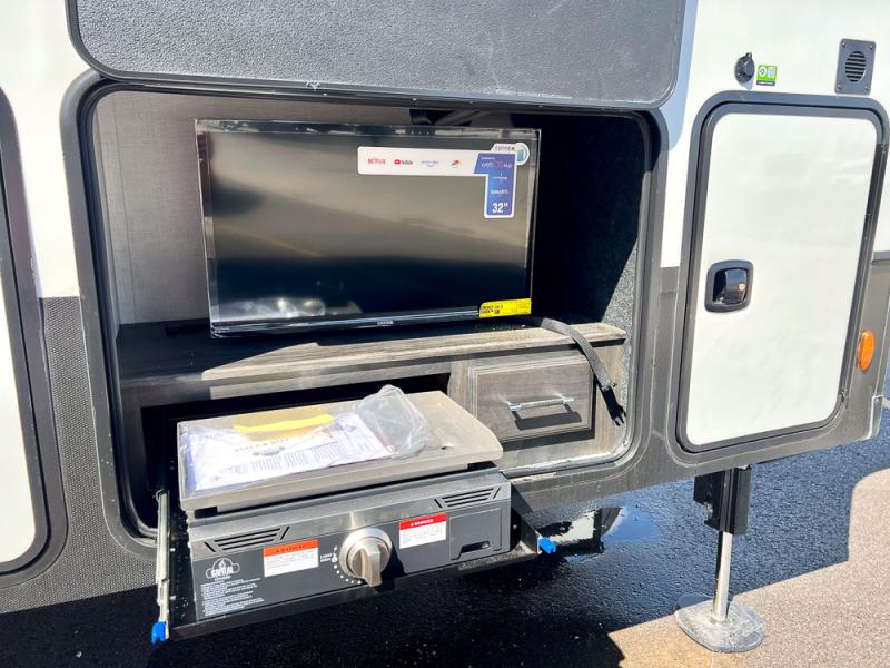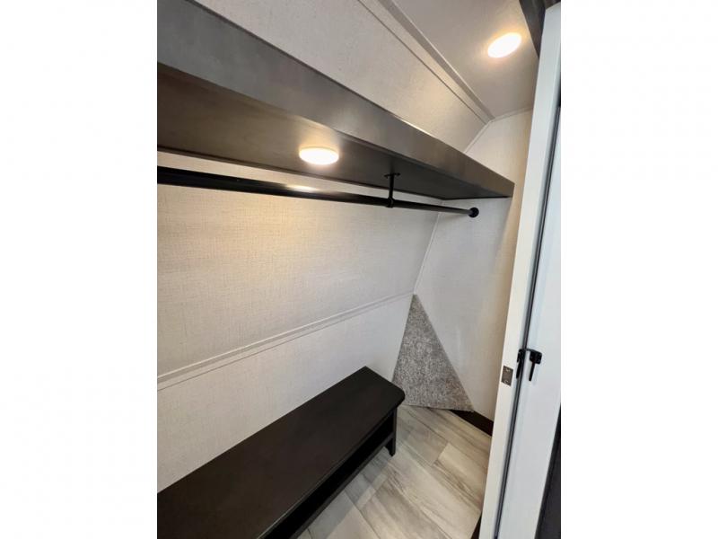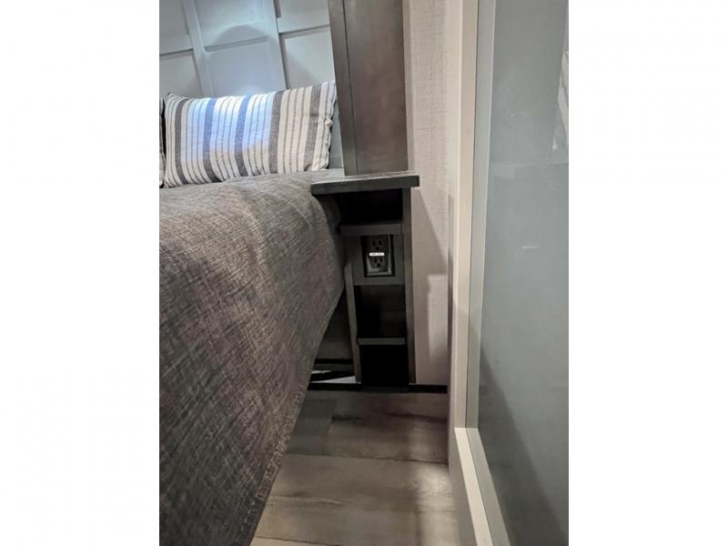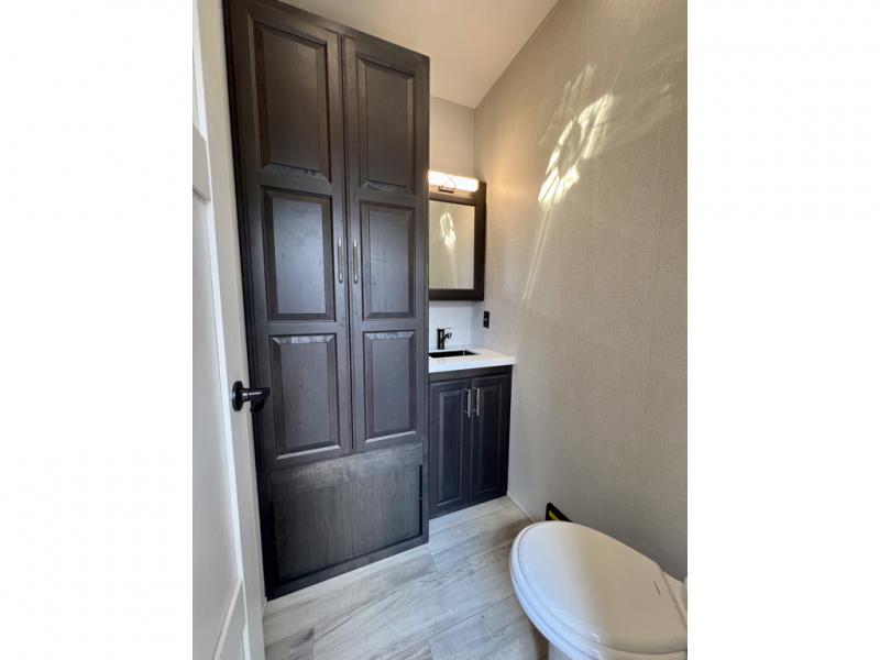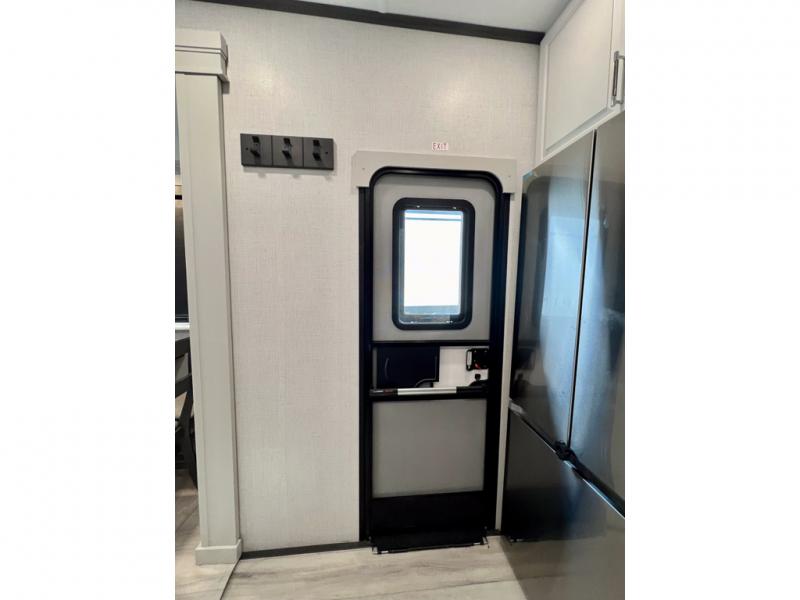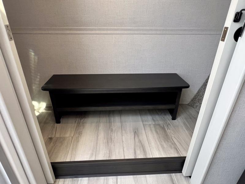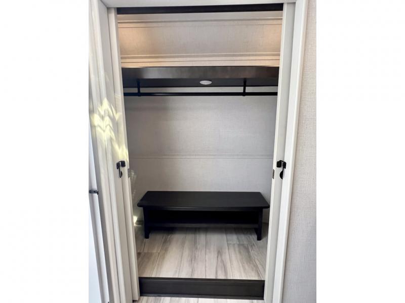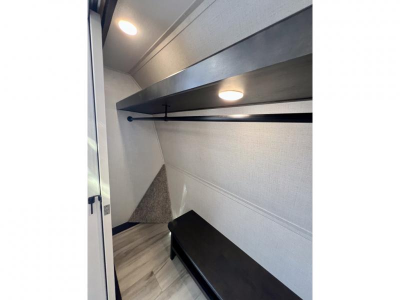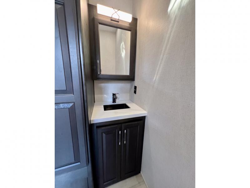 With a bath and a half, it's a clean decision to take this fifth wheel with you on your next camping trip! One of the dual entry doors leads directly into the rear kitchen which has a large pantry and an 18 cu. ft. residential refrigerator to store your food items. The free standing dinette and tri-fold sofa sleeper slide and opposing tri-fold sofa sleeper slide opens up the middle living area for more interior space. The half bathroom is conveniently located straight in through the main entry and features washer and dryer prep for clean clothes throughout your entire trip. The master suite not only has a king bed slide with storage underneath and a bench next to a dresser, but also access into the front full bathroom which has a dual sink vanity, a shower with a seat, and a toilet with privacy walls!