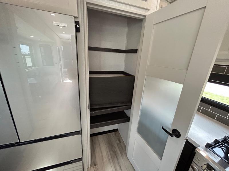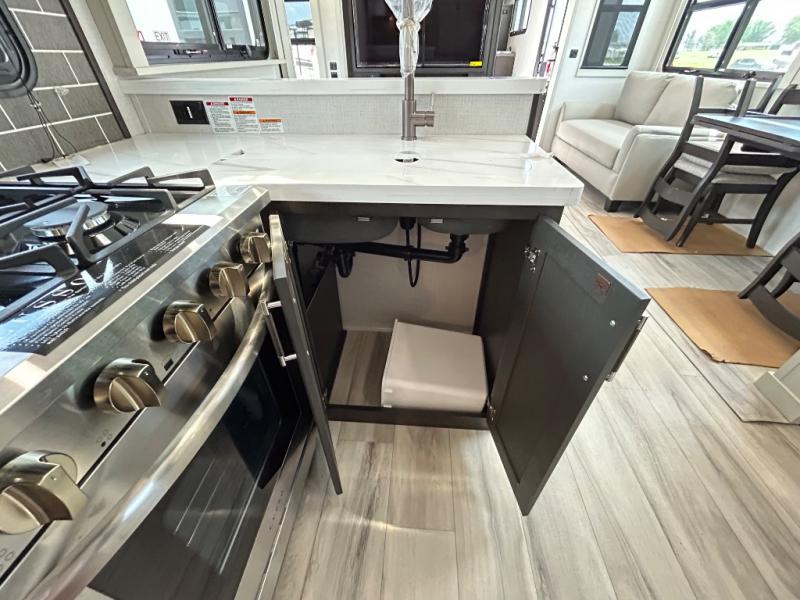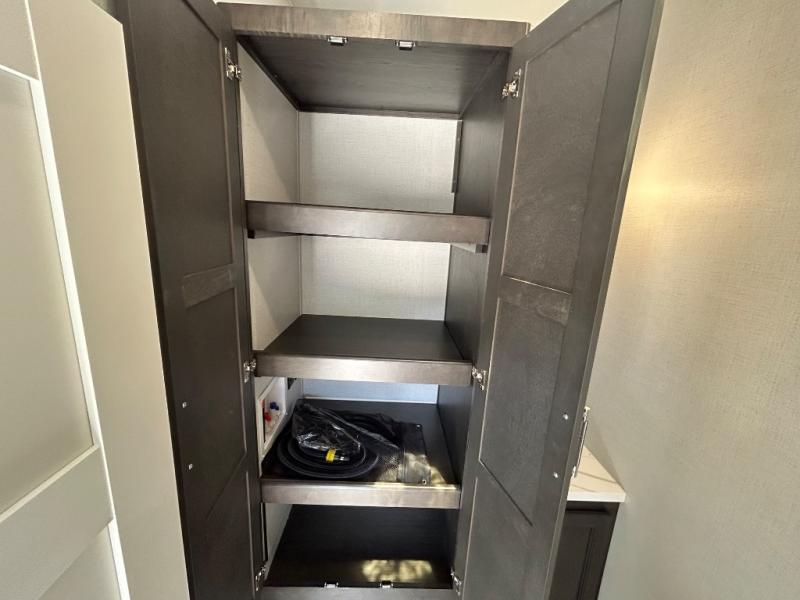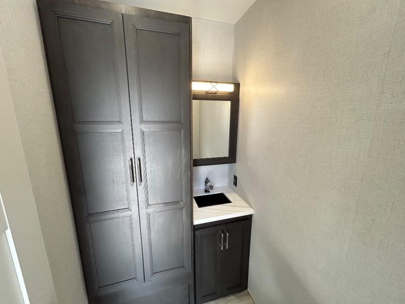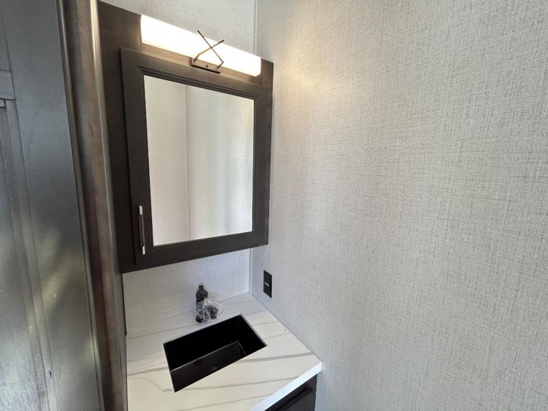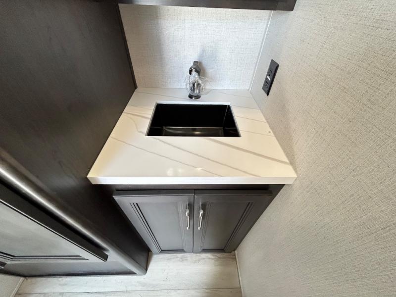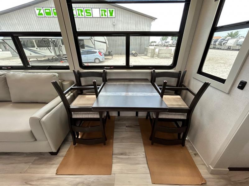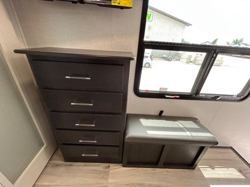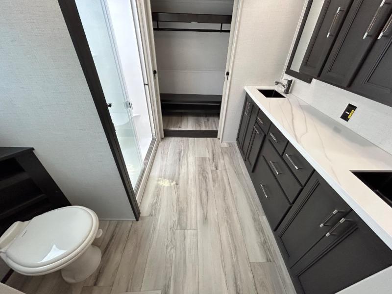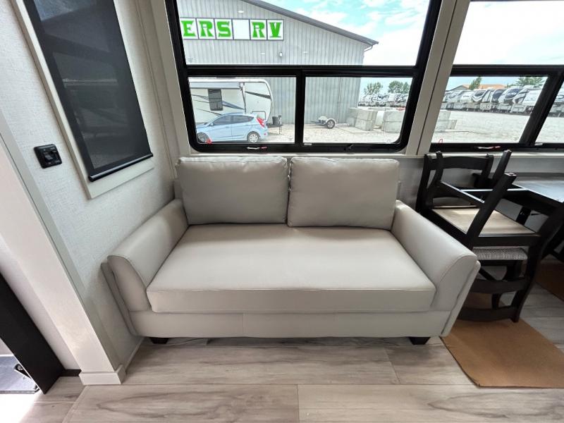 With a bath and a half, it's a clean decision to take this fifth wheel with you on your next camping trip! One of the dual entry doors leads directly into the rear kitchen which has a large pantry and an 18 cu. ft. residential refrigerator to store your food items. The free standing dinette and tri-fold sofa sleeper slide and opposing tri-fold sofa sleeper slide opens up the middle living area for more interior space. The half bathroom is conveniently located straight in through the main entry and features washer and dryer prep for clean clothes throughout your entire trip. The master suite not only has a king bed slide with storage underneath and a bench next to a dresser, but also access into the front full bathroom which has a dual sink vanity, a shower with a seat, and a toilet with privacy walls!