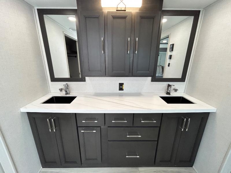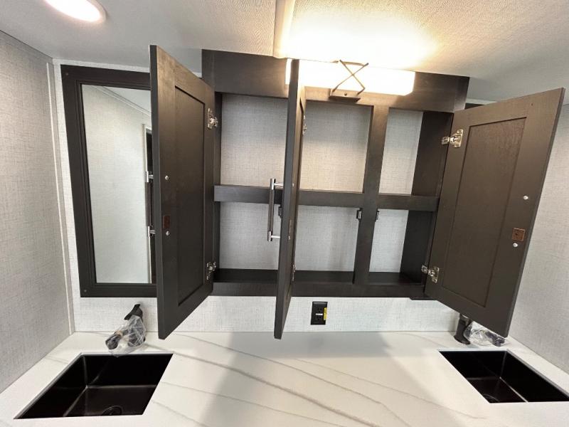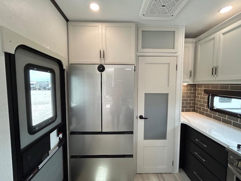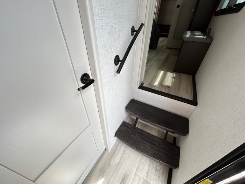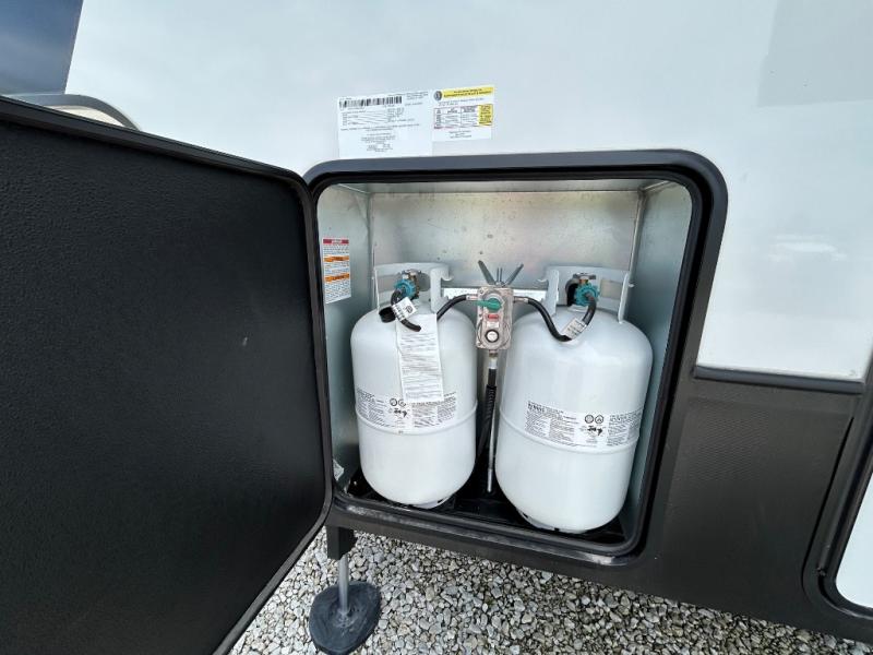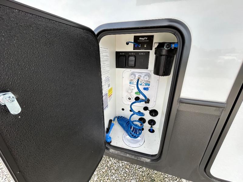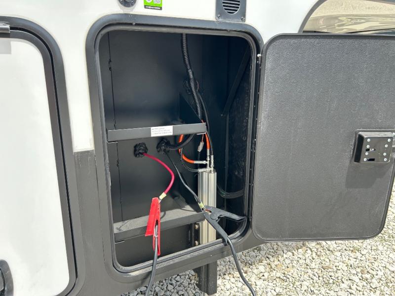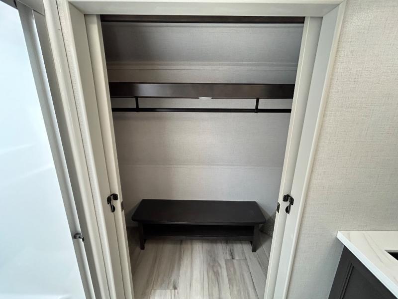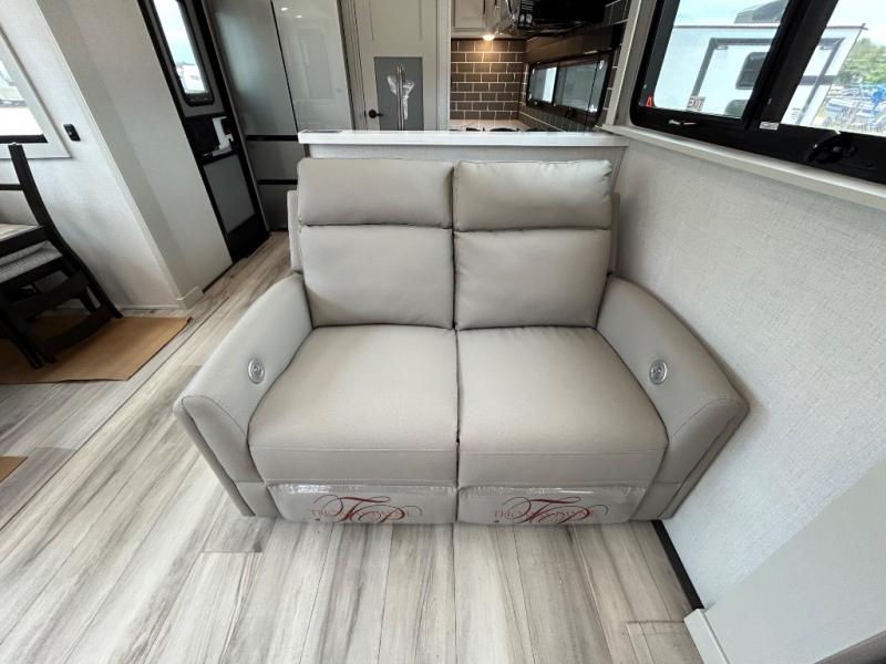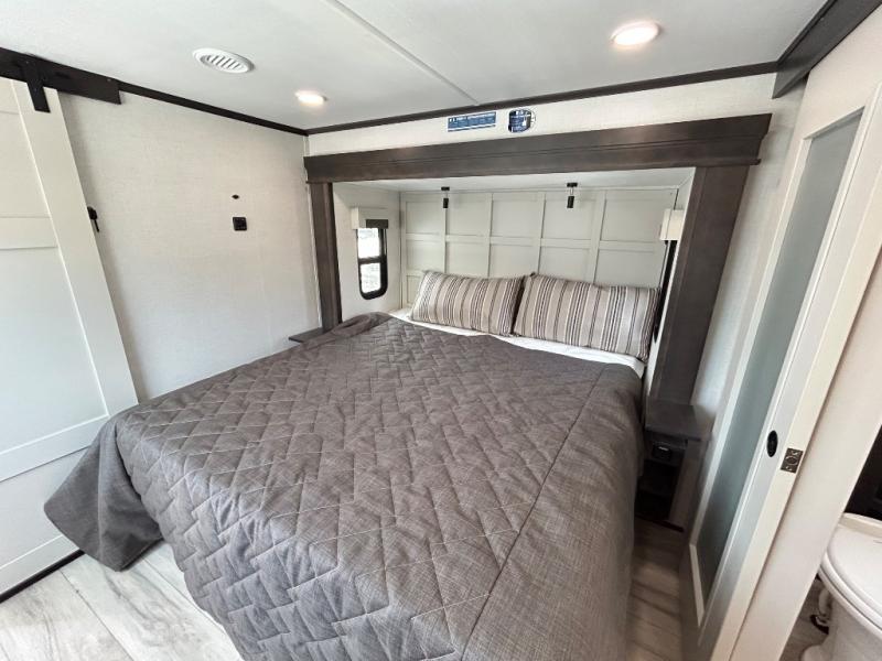 With a bath and a half, it's a clean decision to take this fifth wheel with you on your next camping trip! One of the dual entry doors leads directly into the rear kitchen which has a large pantry and an 18 cu. ft. residential refrigerator to store your food items. The free standing dinette and tri-fold sofa sleeper slide and opposing tri-fold sofa sleeper slide opens up the middle living area for more interior space. The half bathroom is conveniently located straight in through the main entry and features washer and dryer prep for clean clothes throughout your entire trip. The master suite not only has a king bed slide with storage underneath and a bench next to a dresser, but also access into the front full bathroom which has a dual sink vanity, a shower with a seat, and a toilet with privacy walls!