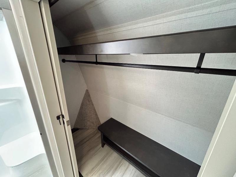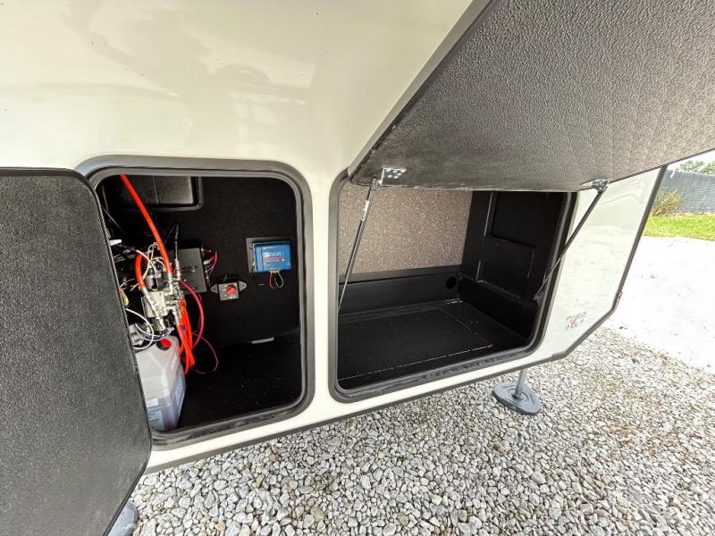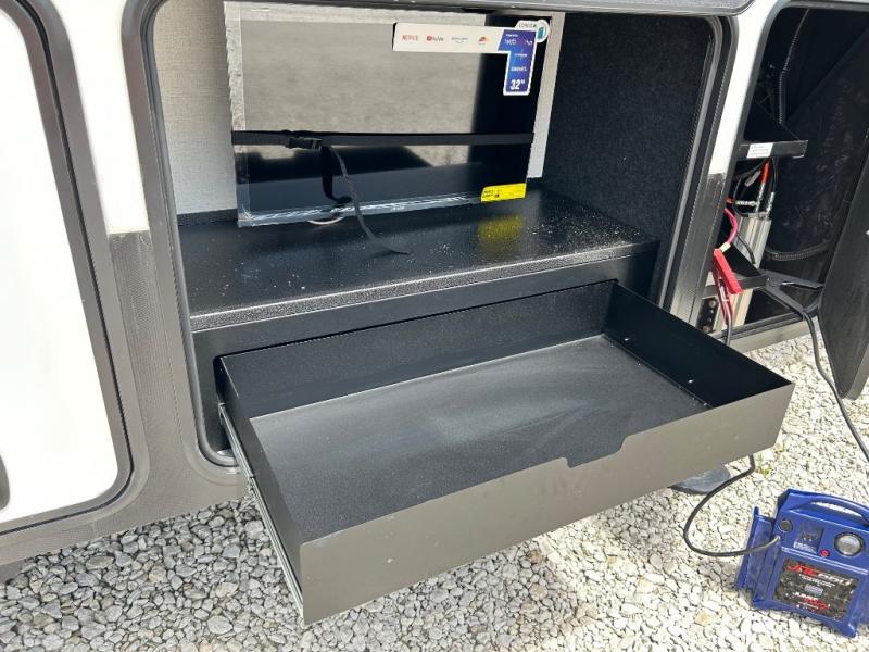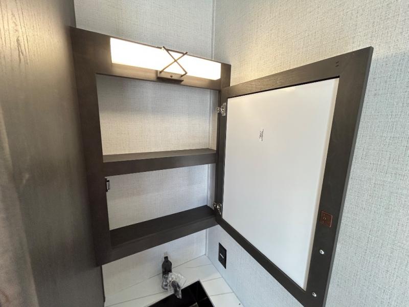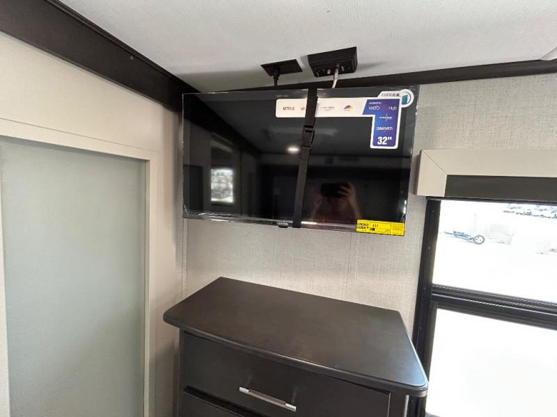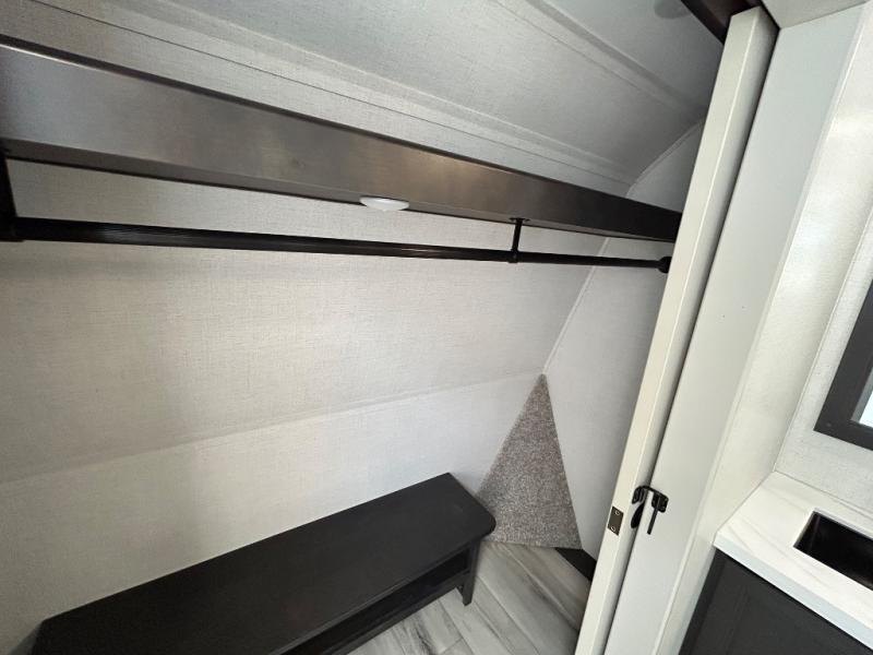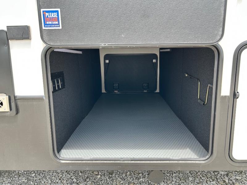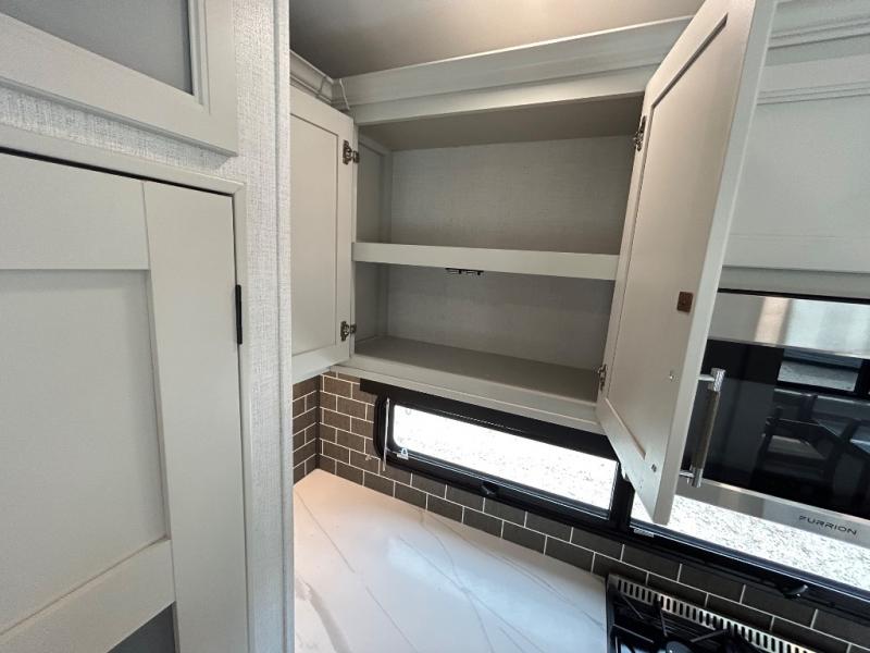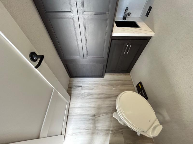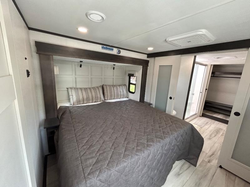With a bath and a half, it's a clean decision to take this fifth wheel with you on your next camping trip! One of the dual entry doors leads directly into the rear kitchen which has a large pantry and an 18 cu. ft. residential refrigerator to store your food items. The free standing dinette and tri-fold sofa sleeper slide and opposing tri-fold sofa sleeper slide opens up the middle living area for more interior space. The half bathroom is conveniently located straight in through the main entry and features washer and dryer prep for clean clothes throughout your entire trip. The master suite not only has a king bed slide with storage underneath and a bench next to a dresser, but also access into the front full bathroom which has a dual sink vanity, a shower with a seat, and a toilet with privacy walls!