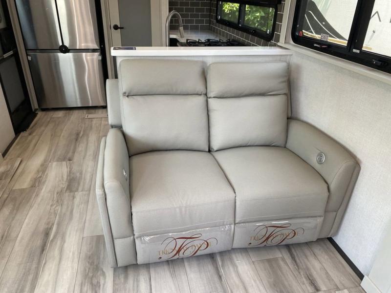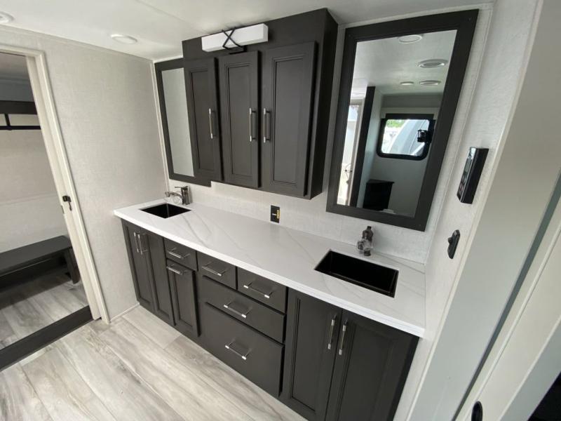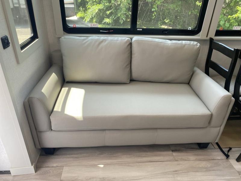 With a bath and a half, it's a clean decision to take this fifth wheel with you on your next camping trip! One of the dual entry doors leads directly into the rear kitchen which has a large pantry and an 18 cu. ft. residential refrigerator to store your food items. The free standing dinette and tri-fold sofa sleeper slide and opposing tri-fold sofa sleeper slide opens up the middle living area for more interior space. The half bathroom is conveniently located straight in through the main entry and features washer and dryer prep for clean clothes throughout your entire trip. The master suite not only has a king bed slide with storage underneath and a bench next to a dresser, but also access into the front full bathroom which has a dual sink vanity, a shower with a seat, and a toilet with privacy walls!