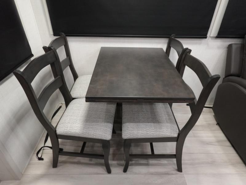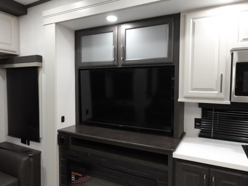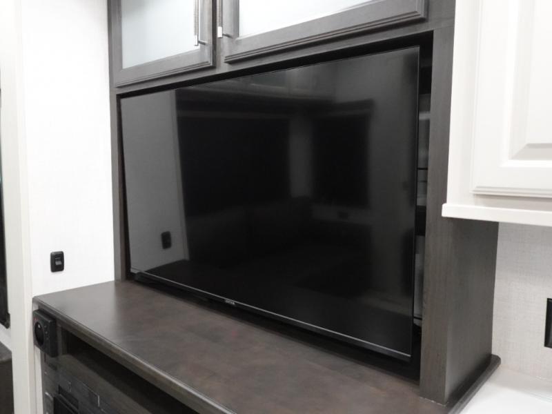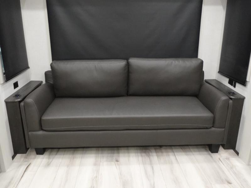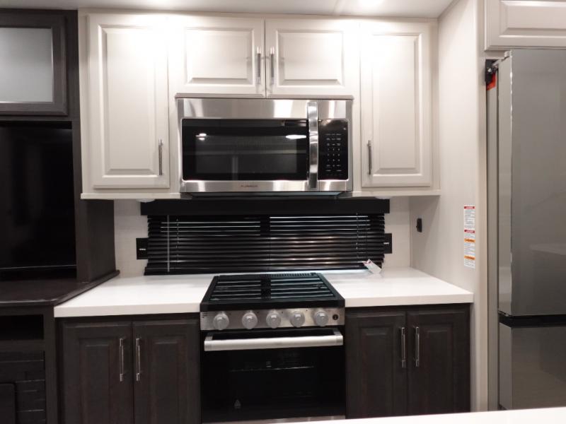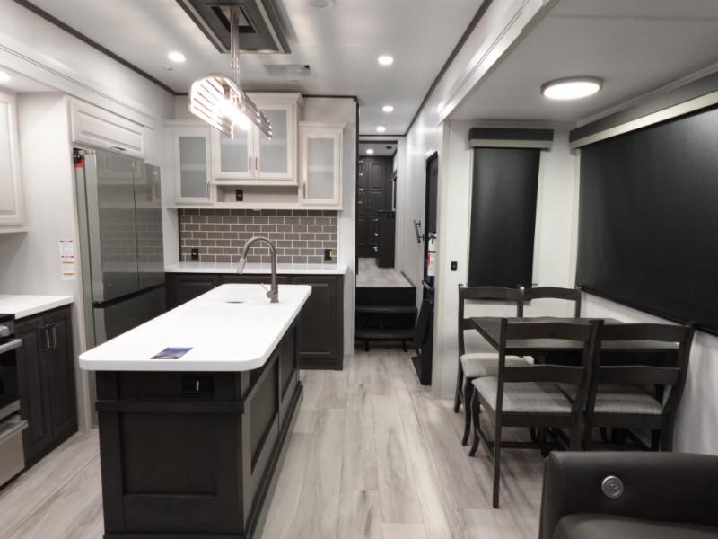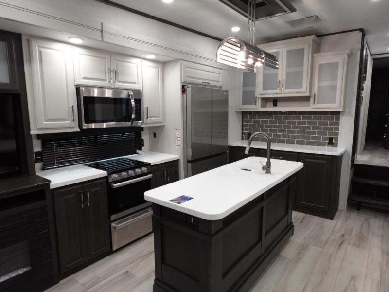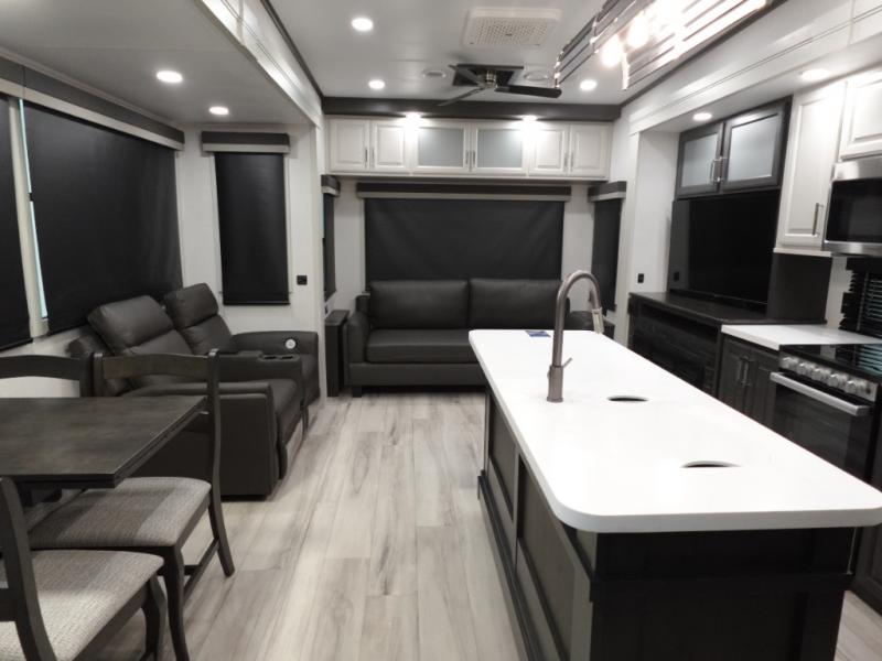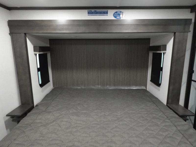 For the couple that loves to travel, you will truly enjoy this spacious fifth wheel featuring triple slides with dual opposing in the main combined kitchen and living area. Here you can entertain friends, even overnight, thanks to the hide-a-bed sofa sleeper. A free standing dinette and four chairs makes dining feel like home, and you will love the spacious kitchen for cooking with a large center island including prep space next to the double sink. A side hutch offers space for dishes, or place for other small appliances to be left out. The master bedroom is just beyond the spacious bath on your left up the steps and behind a space saving sliding barn style door. You will sleep comfortably on the king bed that slides out to provide even more floor space for getting dressed. The bath provides a large shower and vanity with dual sinks so two can easily get ready at once!