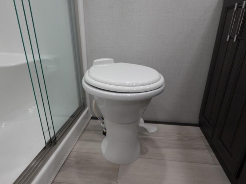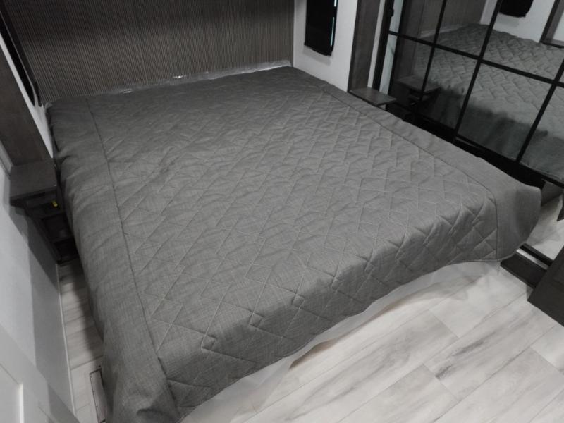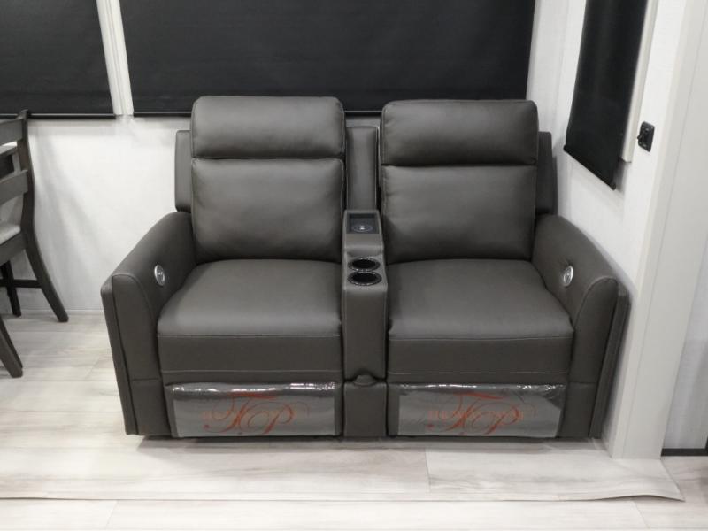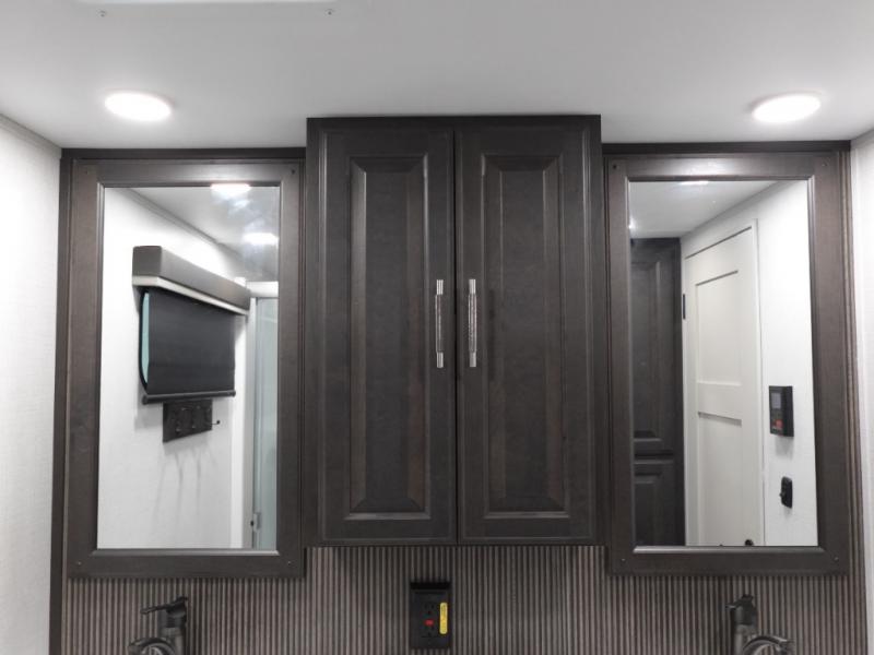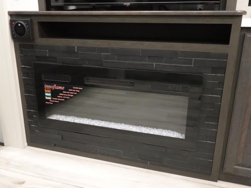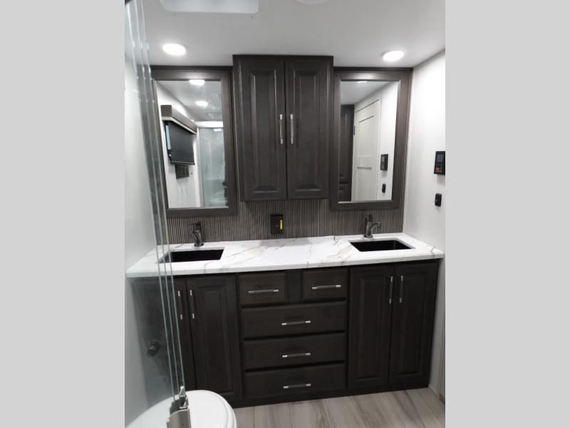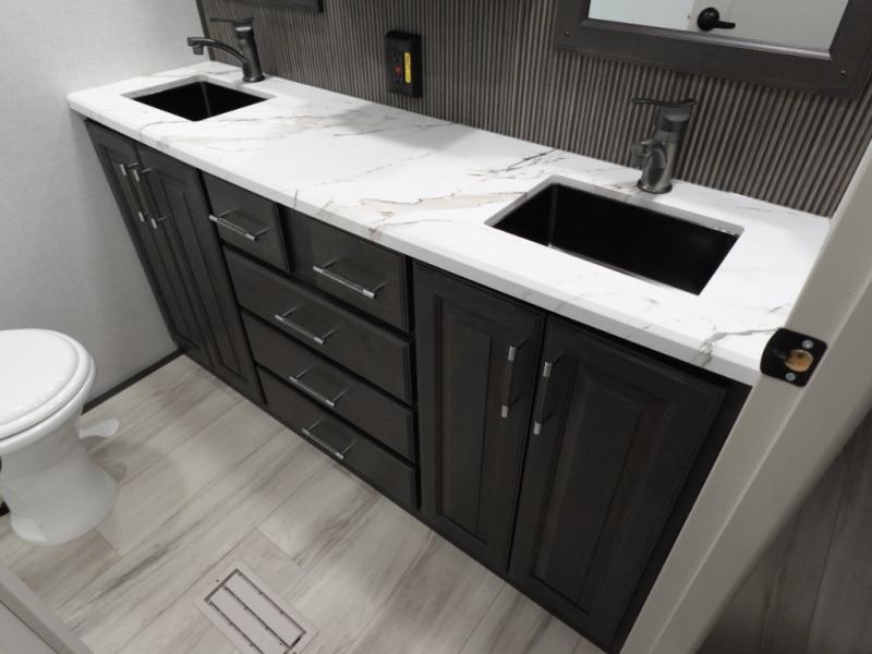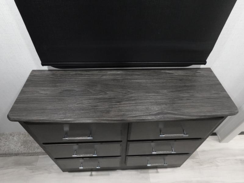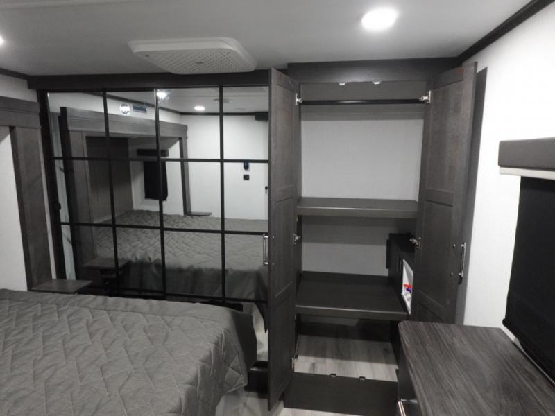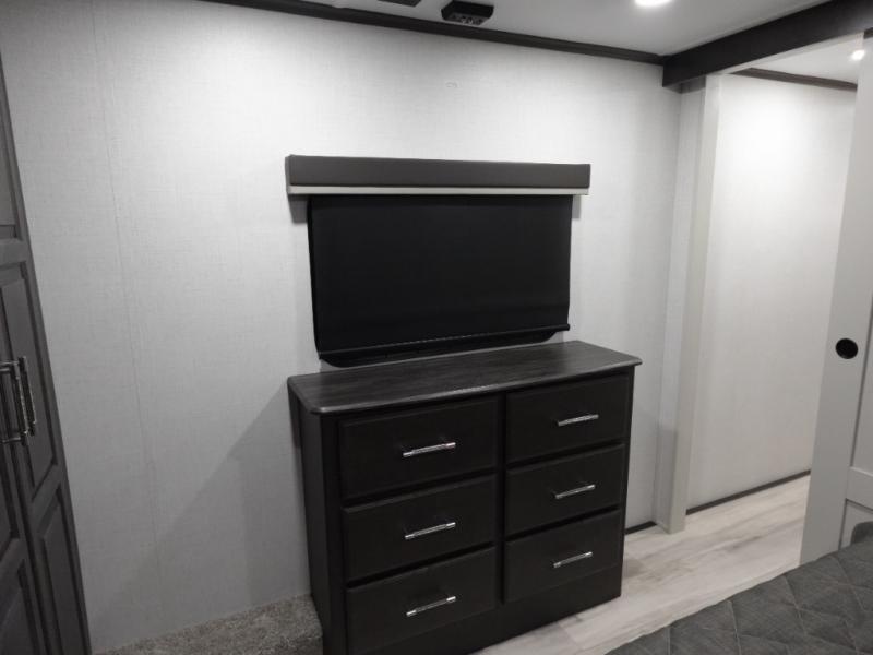 For the couple that loves to travel, you will truly enjoy this spacious fifth wheel featuring triple slides with dual opposing in the main combined kitchen and living area. Here you can entertain friends, even overnight, thanks to the hide-a-bed sofa sleeper. A free standing dinette and four chairs makes dining feel like home, and you will love the spacious kitchen for cooking with a large center island including prep space next to the double sink. A side hutch offers space for dishes, or place for other small appliances to be left out. The master bedroom is just beyond the spacious bath on your left up the steps and behind a space saving sliding barn style door. You will sleep comfortably on the king bed that slides out to provide even more floor space for getting dressed. The bath provides a large shower and vanity with dual sinks so two can easily get ready at once!