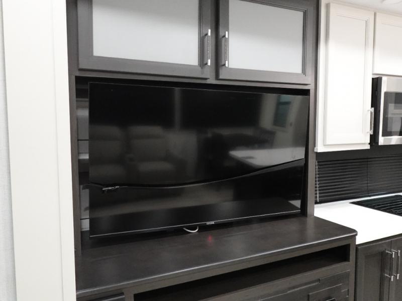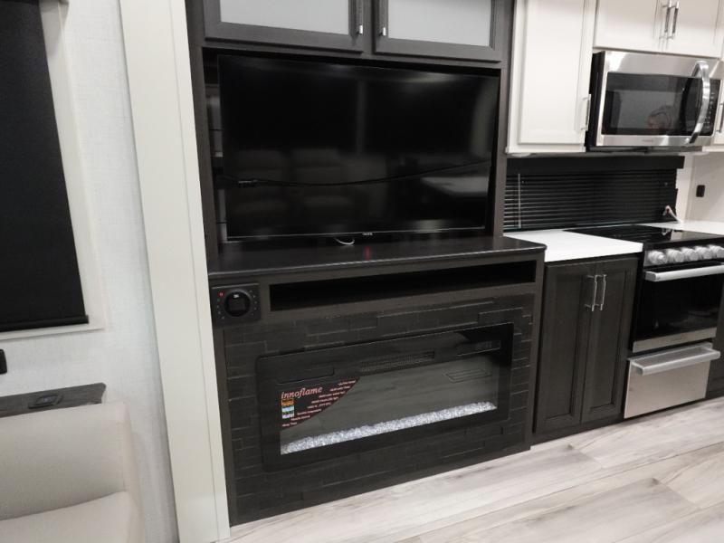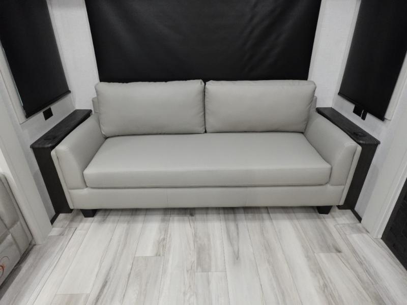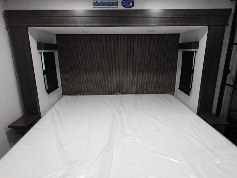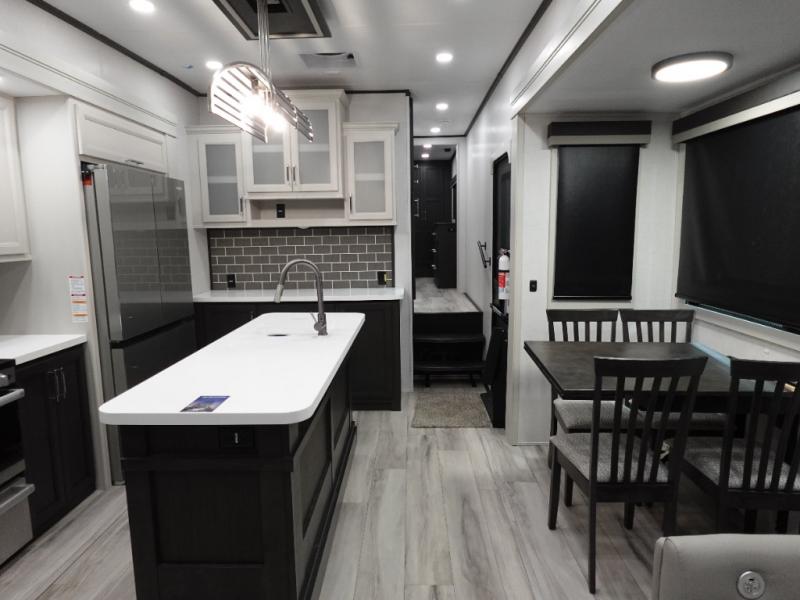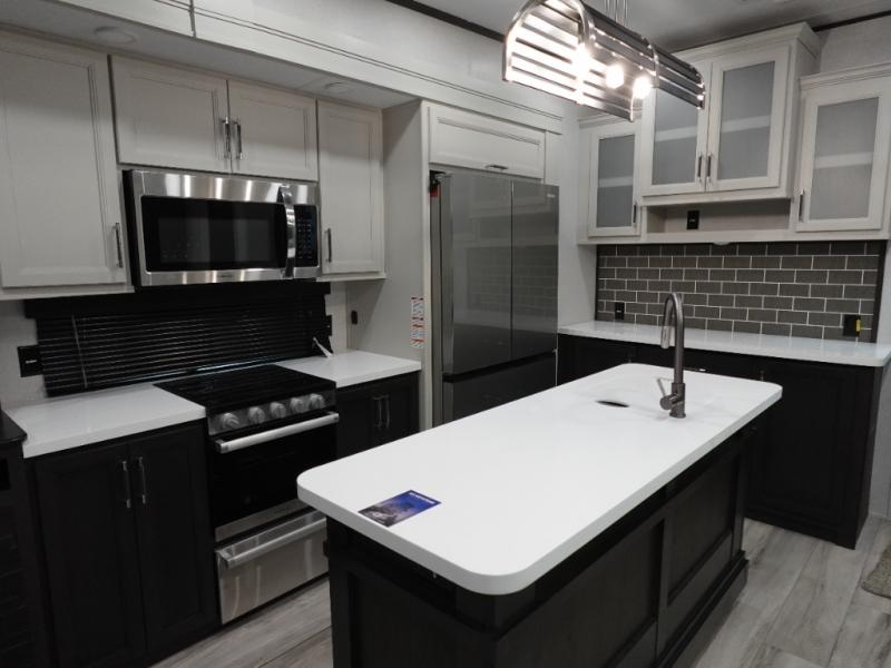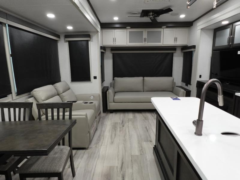 For the couple that loves to travel, you will truly enjoy this spacious fifth wheel featuring triple slides with dual opposing in the main combined kitchen and living area. Here you can entertain friends, even overnight, thanks to the hide-a-bed sofa sleeper. A free standing dinette and four chairs makes dining feel like home, and you will love the spacious kitchen for cooking with a large center island including prep space next to the double sink. A side hutch offers space for dishes, or place for other small appliances to be left out. The master bedroom is just beyond the spacious bath on your left up the steps and behind a space saving sliding barn style door. You will sleep comfortably on the king bed that slides out to provide even more floor space for getting dressed, and there is also a prepped area for adding a stackable washer and dryer if you choose. The bath provides a large shower and vanity with dual sinks so two can easily get ready at once!