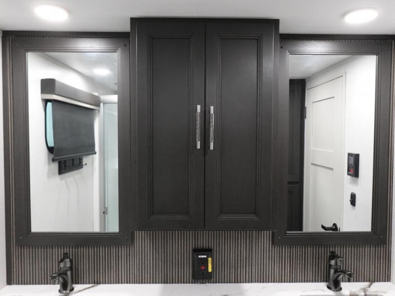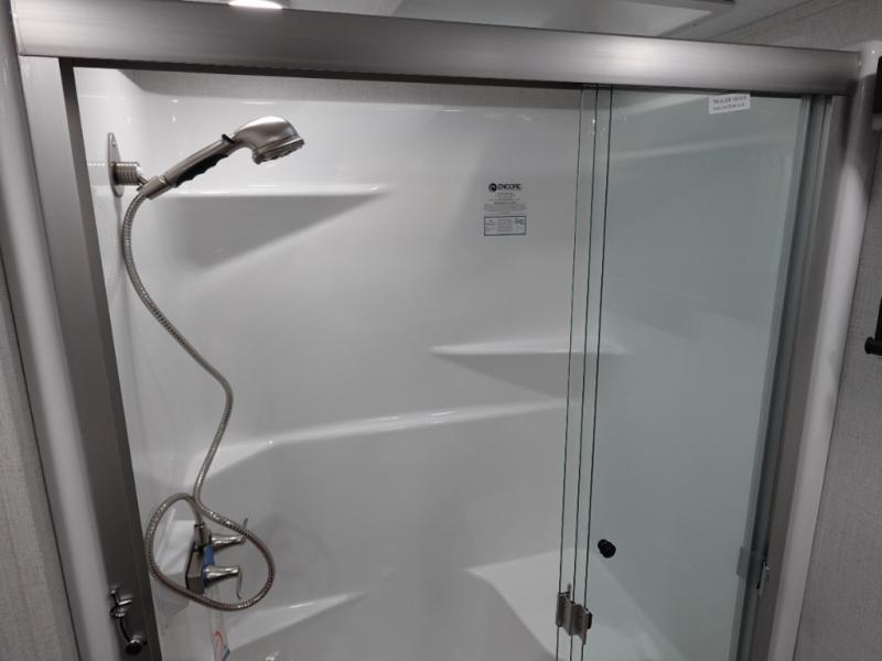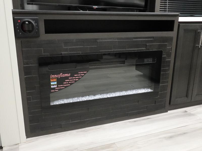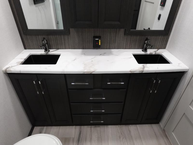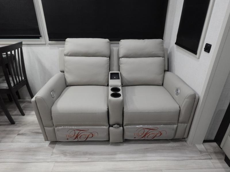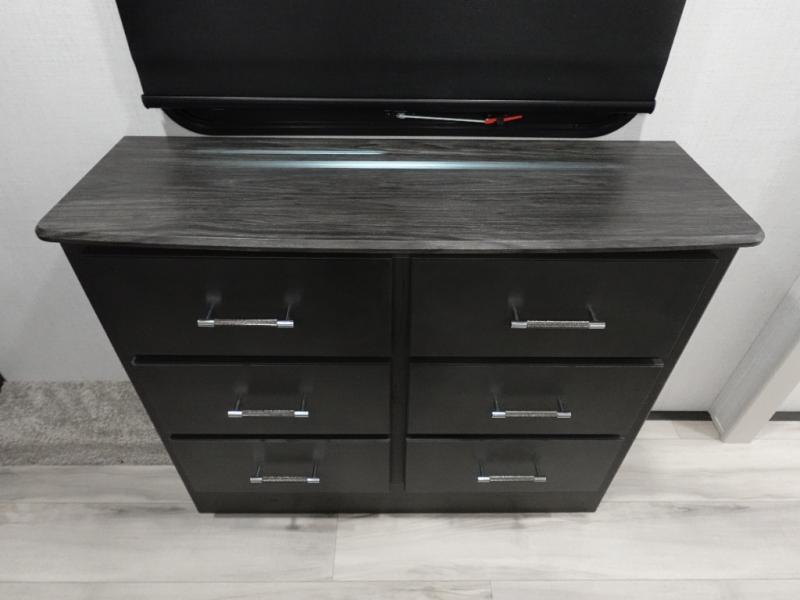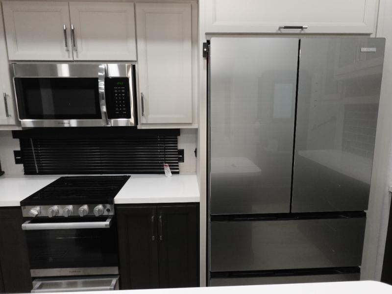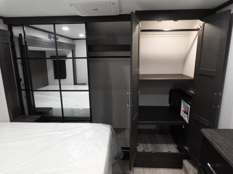 For the couple that loves to travel, you will truly enjoy this spacious fifth wheel featuring triple slides with dual opposing in the main combined kitchen and living area. Here you can entertain friends, even overnight, thanks to the hide-a-bed sofa sleeper. A free standing dinette and four chairs makes dining feel like home, and you will love the spacious kitchen for cooking with a large center island including prep space next to the double sink. A side hutch offers space for dishes, or place for other small appliances to be left out. The master bedroom is just beyond the spacious bath on your left up the steps and behind a space saving sliding barn style door. You will sleep comfortably on the king bed that slides out to provide even more floor space for getting dressed, and there is also a prepped area for adding a stackable washer and dryer if you choose. The bath provides a large shower and vanity with dual sinks so two can easily get ready at once!