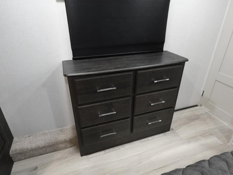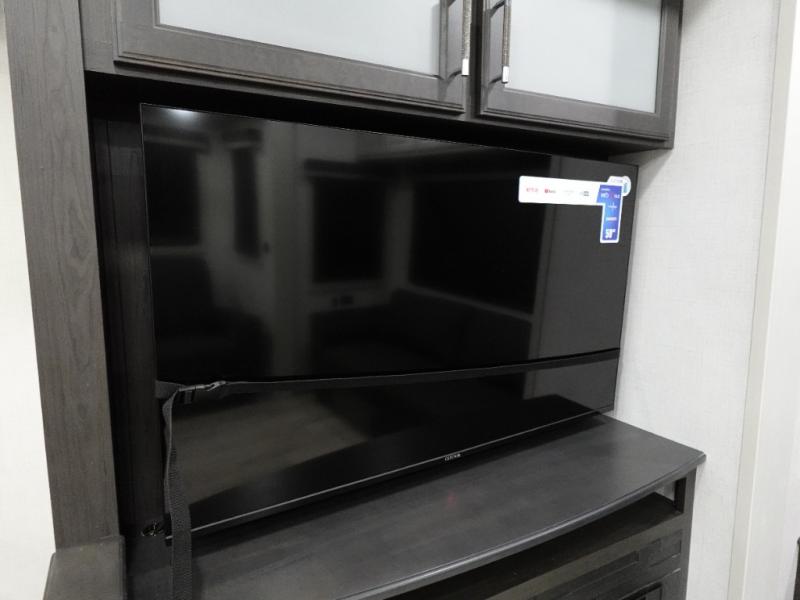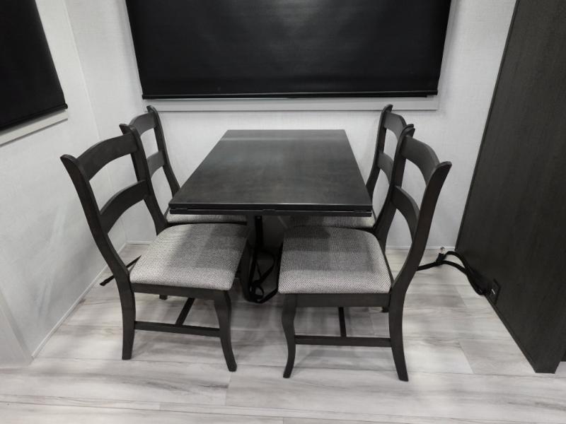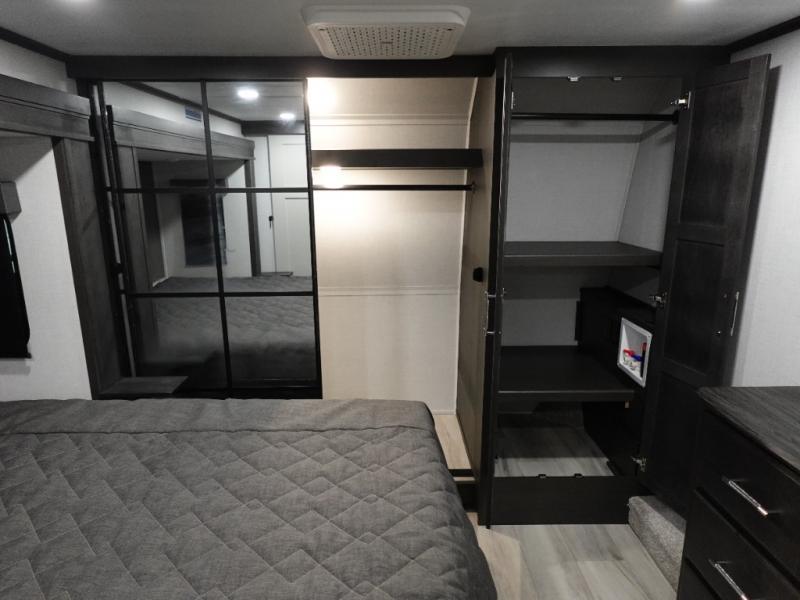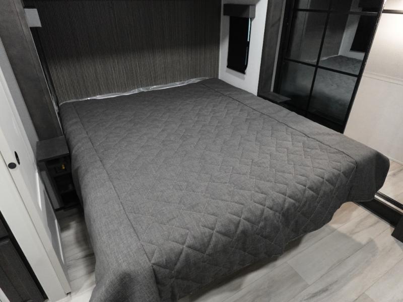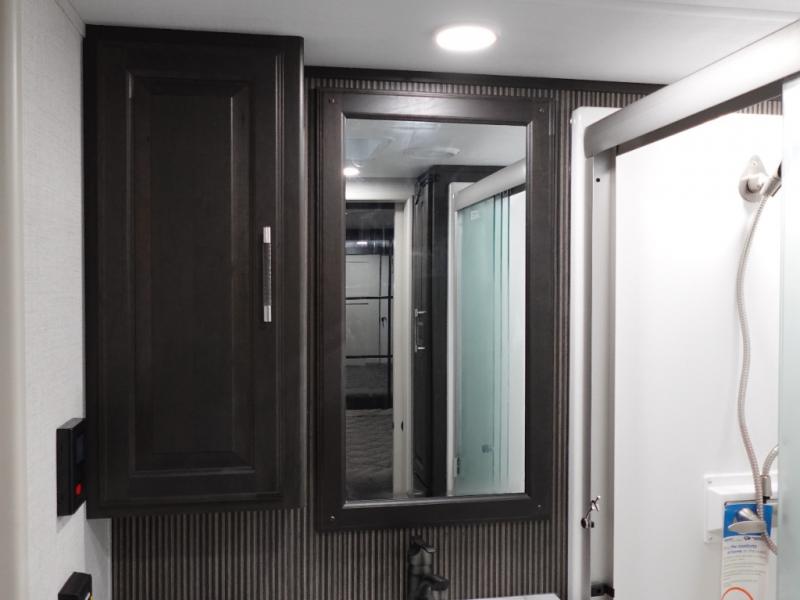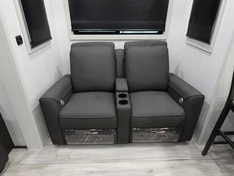 This grand kitchen offers the cook their own space to prepare and serve meals from the large L-shaped counter peninsula bar with stools, and the large pantry and curio will come in handy as well. Dining is also available at the free standing dinette with four chairs and some might even enjoy sitting on the hide-a-bed sofa sleeper. Also available for seating are the theater seats which are equipped with heat, massage, LED lights and USB charging. The master bedroom offers a king bed with storage underneath and additional wardrobe storage plus a space prepped for a washer/dryer. Having a separate living area from the kitchen gives everyone room to spread out, and outside there are two power awnings offering additional outdoor living areas protected from the elements. The cook will enjoy the outside Grill-n-Chill outside kitchen as well.