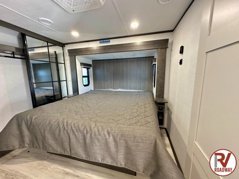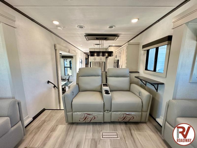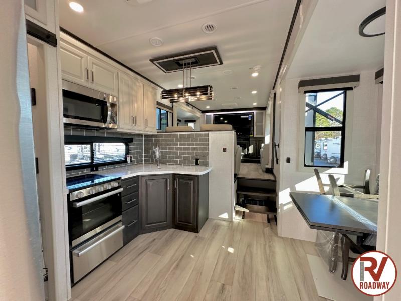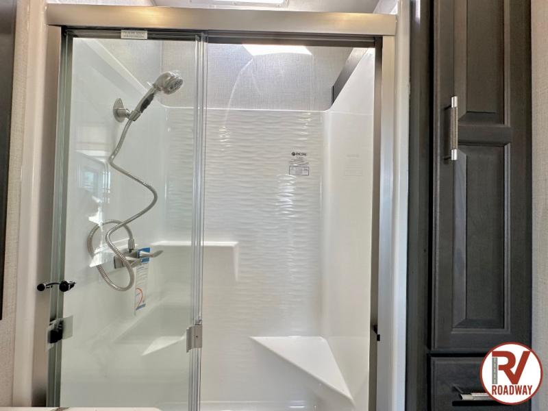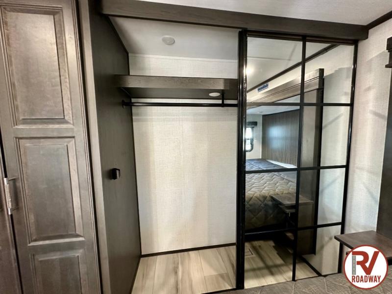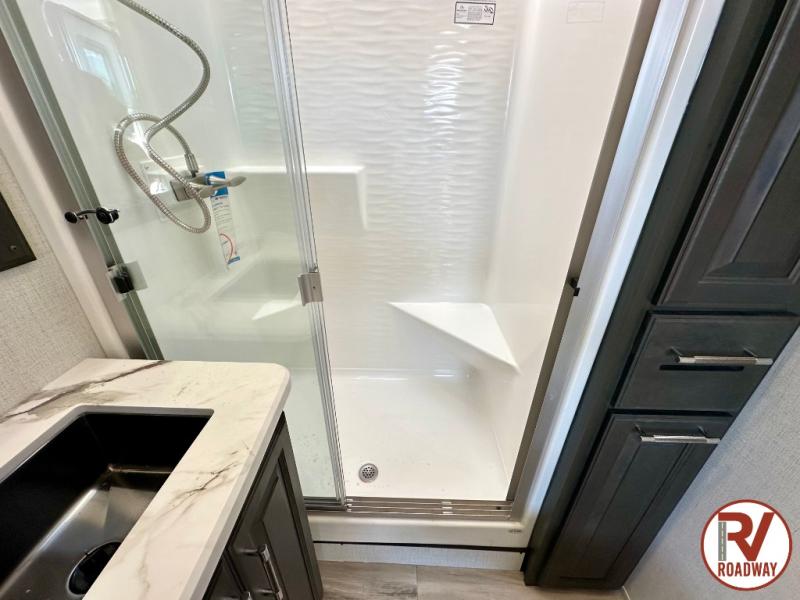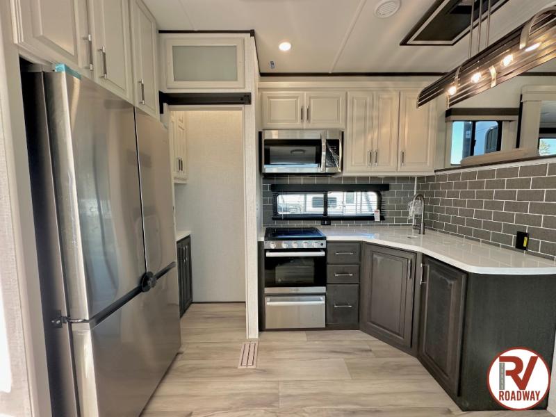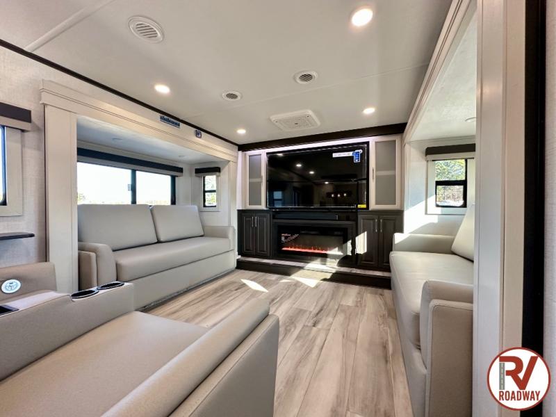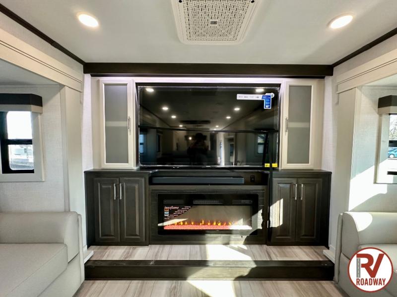 Enjoy traveling with your family and friends in this fifth wheel featuring quad slides providing space for everyone! The front living area offers two of those slides each with a tri-fold sleeper sofa for family or overnight guests. A full wall entertainment center with 65" Smart HD TV and fireplace, plus a theater seat sets this space up as a great gathering place for all to enjoy. Step down to the spacious kitchen and dining area with free standing table and four chairs, a coffee station, plus a refrigerator and range with residential microwave overhead. At the rear of this amazing coach, you will find a raised private master bedroom featuring a king bed slide with storage beneath for extra blankets and such, plus under the entire bedroom area on the outside you will find colossal storage for all sorts of things! The master bedroom offers a master closet, dresser, and a space prepped for a stackable washer and dryer if you choose to add. This unit also features a convenient bathroom located just inside the main entry allowing easy access from outside.