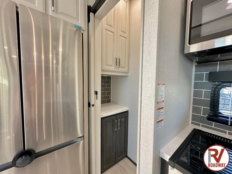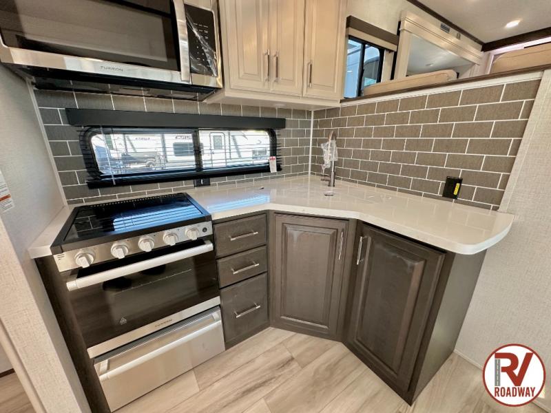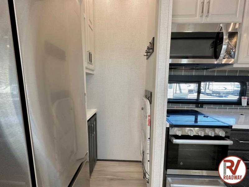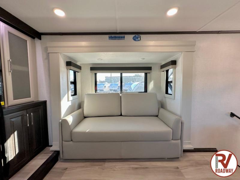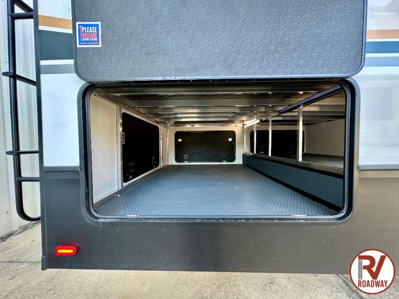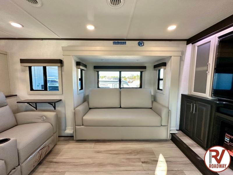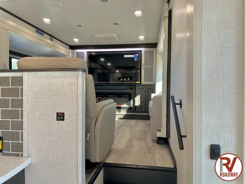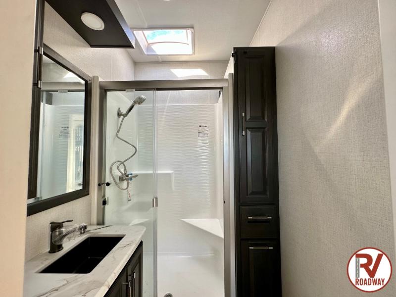 Enjoy traveling with your family and friends in this fifth wheel featuring quad slides providing space for everyone! The front living area offers two of those slides each with a tri-fold sleeper sofa for family or overnight guests. A full wall entertainment center with 65" Smart HD TV and fireplace, plus a theater seat sets this space up as a great gathering place for all to enjoy. Step down to the spacious kitchen and dining area with free standing table and four chairs, a coffee station, plus a refrigerator and range with residential microwave overhead. At the rear of this amazing coach, you will find a raised private master bedroom featuring a king bed slide with storage beneath for extra blankets and such, plus under the entire bedroom area on the outside you will find colossal storage for all sorts of things! The master bedroom offers a master closet, dresser, and a space prepped for a stackable washer and dryer if you choose to add. This unit also features a convenient bathroom located just inside the main entry allowing easy access from outside.