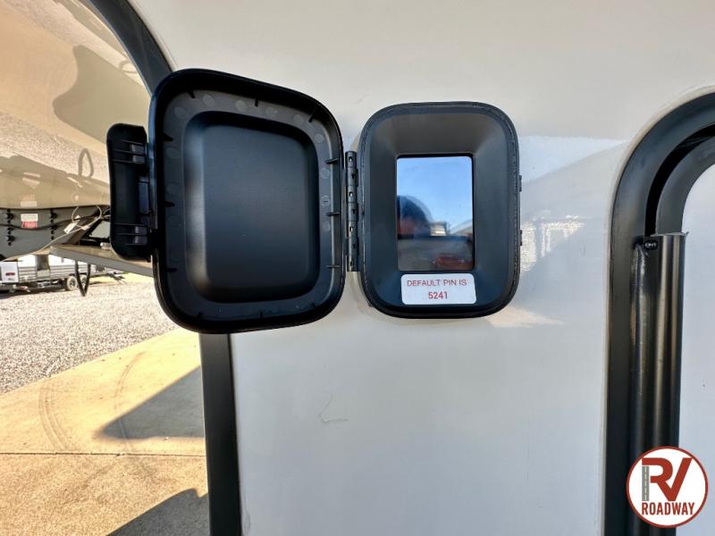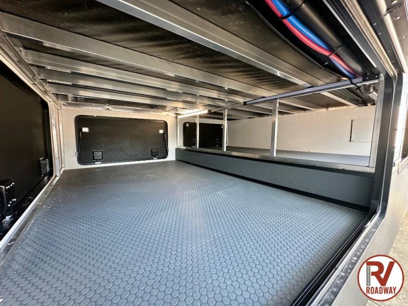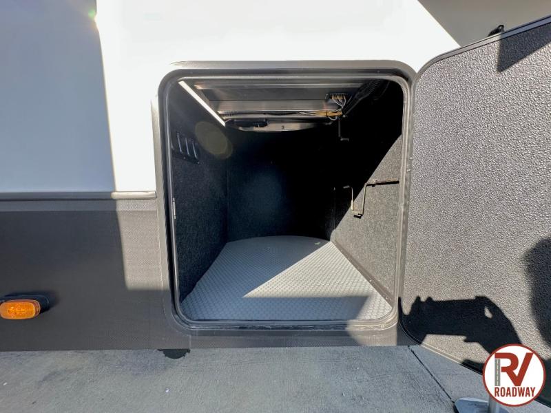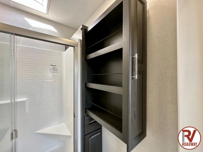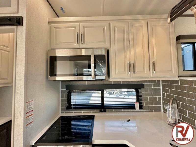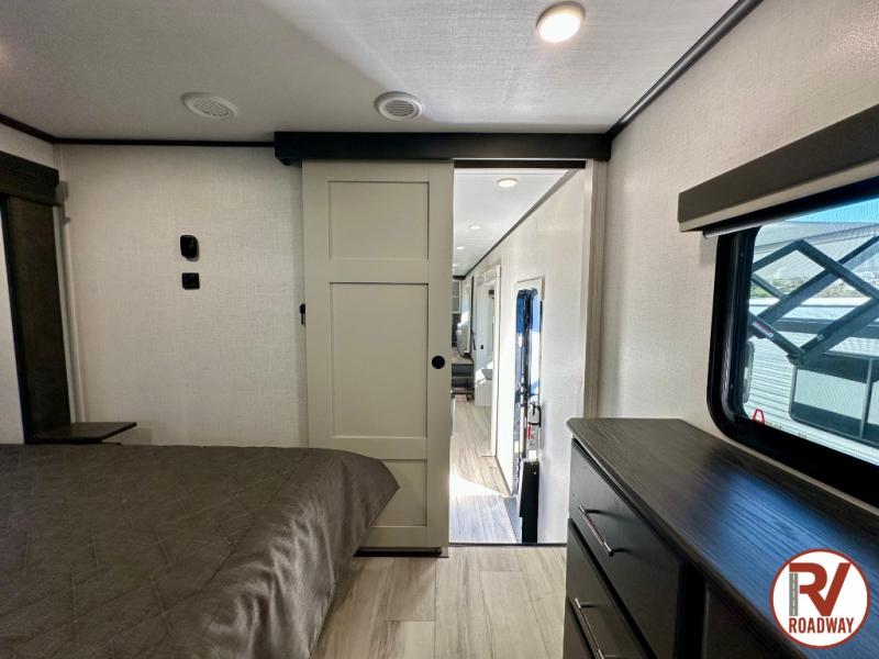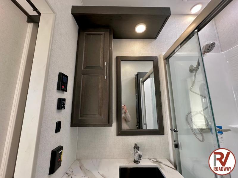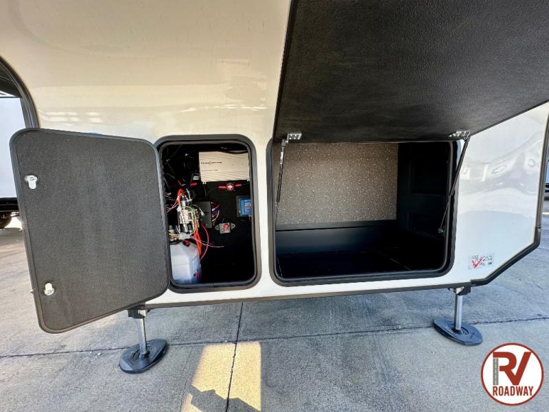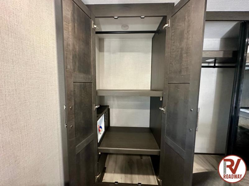 Enjoy traveling with your family and friends in this fifth wheel featuring quad slides providing space for everyone! The front living area offers two of those slides each with a tri-fold sleeper sofa for family or overnight guests. A full wall entertainment center with 65" Smart HD TV and fireplace, plus a theater seat sets this space up as a great gathering place for all to enjoy. Step down to the spacious kitchen and dining area with free standing table and four chairs, a coffee station, plus a refrigerator and range with residential microwave overhead. At the rear of this amazing coach, you will find a raised private master bedroom featuring a king bed slide with storage beneath for extra blankets and such, plus under the entire bedroom area on the outside you will find colossal storage for all sorts of things! The master bedroom offers a master closet, dresser, and a space prepped for a stackable washer and dryer if you choose to add. This unit also features a convenient bathroom located just inside the main entry allowing easy access from outside.