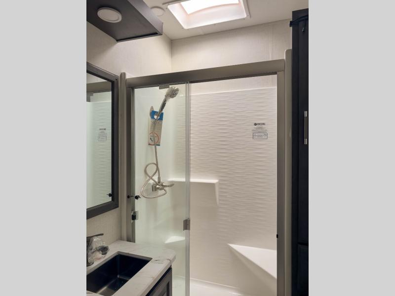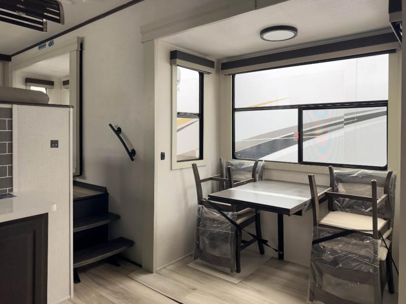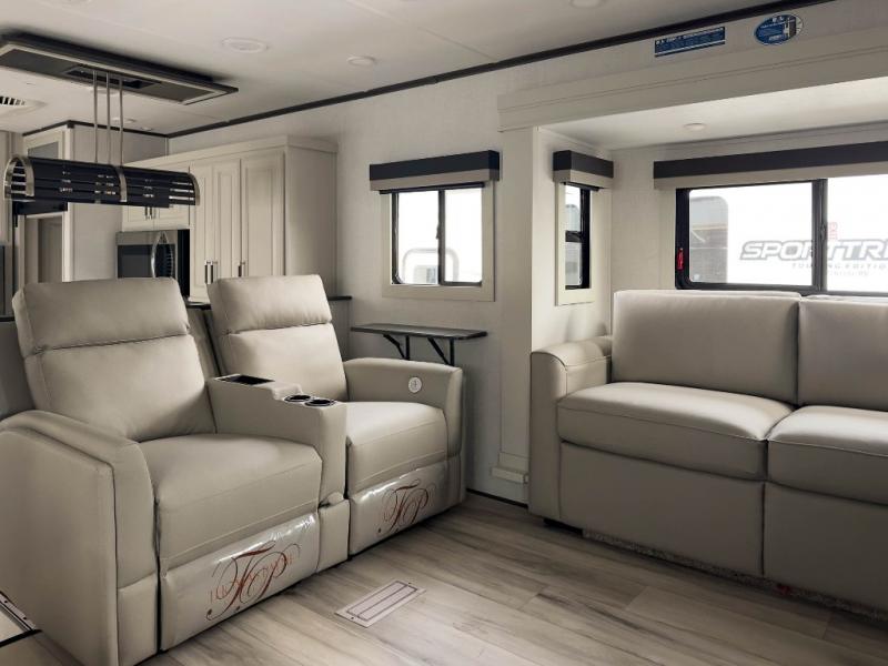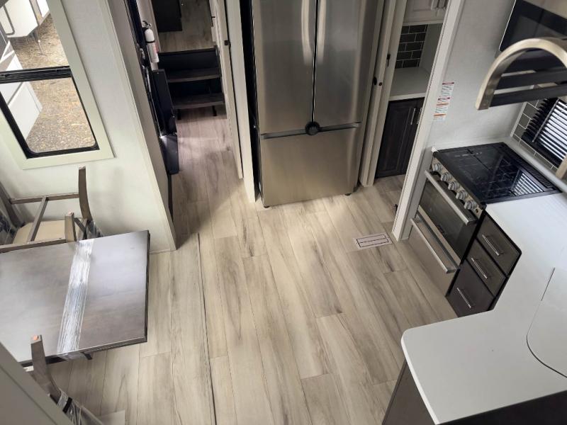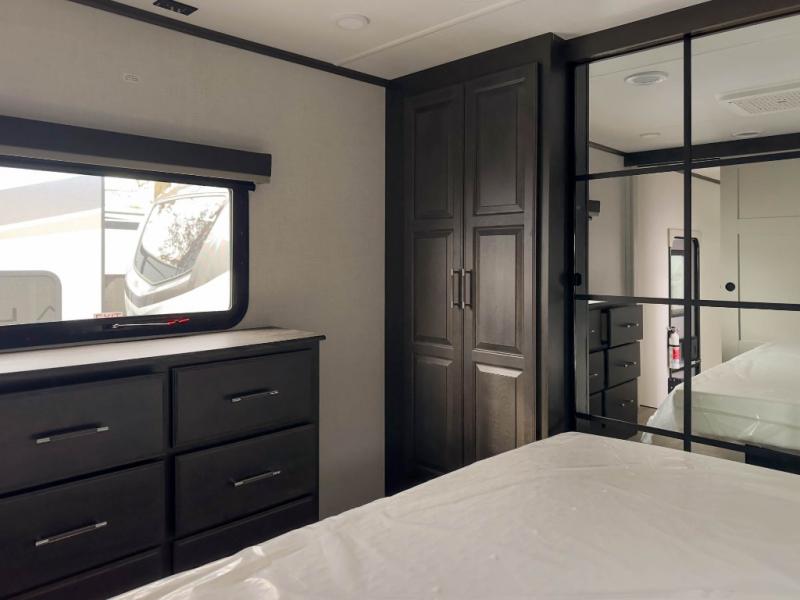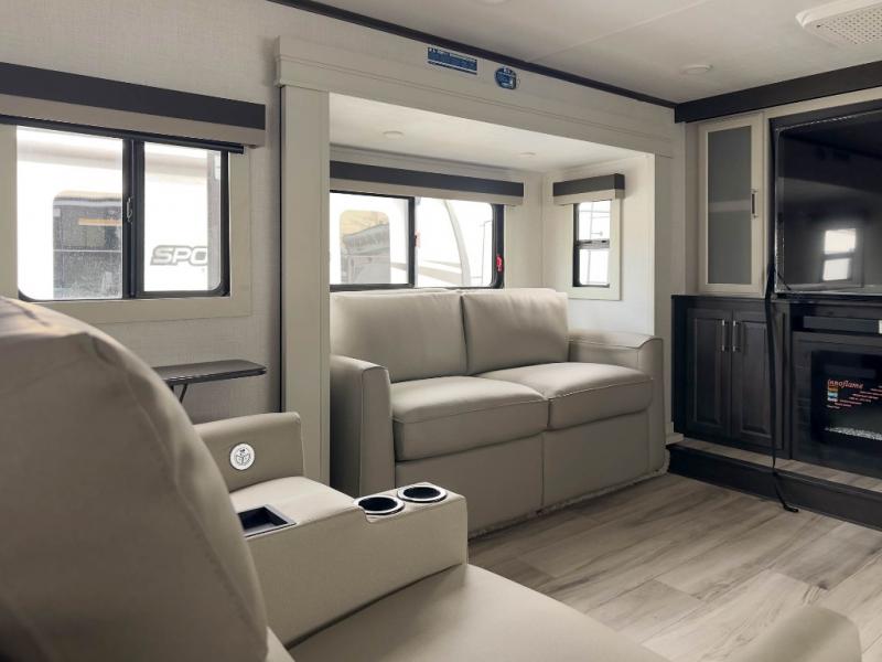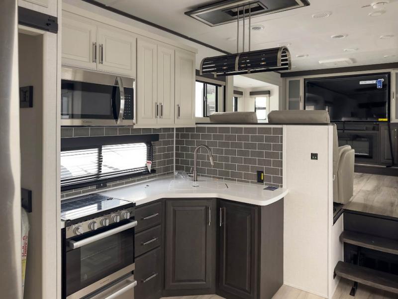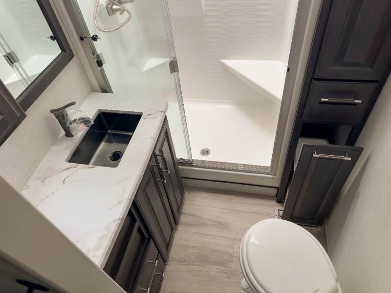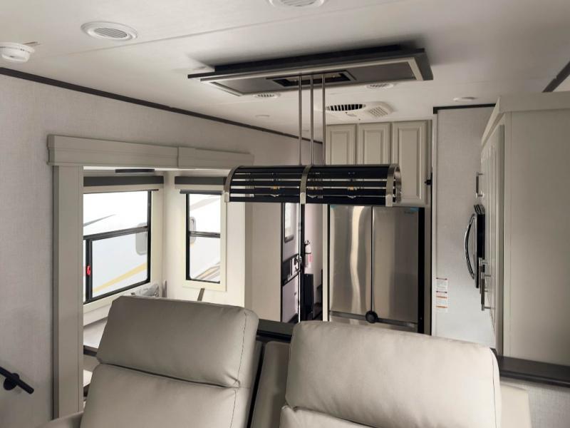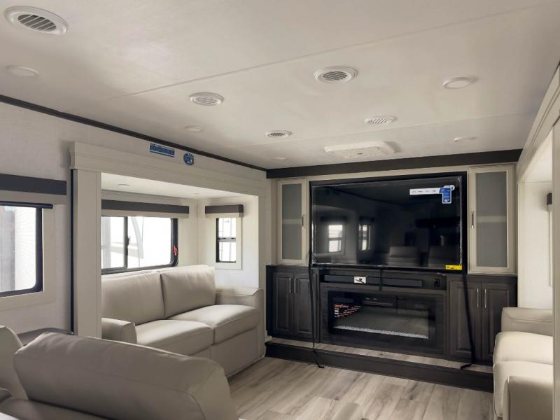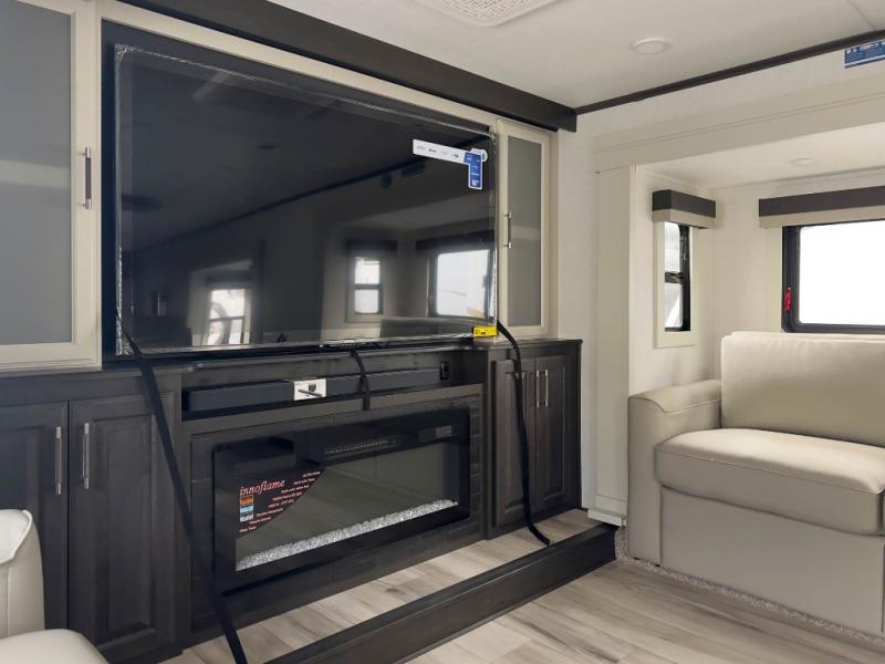 Enjoy traveling with your family and friends in this fifth wheel featuring quad slides providing space for everyone! The front living area offers two of those slides each with a tri-fold sleeper sofa for family or overnight guests. A full wall entertainment center with 65" Smart HD TV and fireplace, plus a theater seat sets this space up as a great gathering place for all to enjoy. Step down to the spacious kitchen and dining area with free standing table and four chairs, a coffee station, plus a refrigerator and range with residential microwave overhead. At the rear of this amazing coach, you will find a raised private master bedroom featuring a king bed slide with storage beneath for extra blankets and such, plus under the entire bedroom area on the outside you will find colossal storage for all sorts of things! The master bedroom offers a master closet, dresser, and a space prepped for a stackable washer and dryer if you choose to add. This unit also features a convenient bathroom located just inside the main entry allowing easy access from outside.