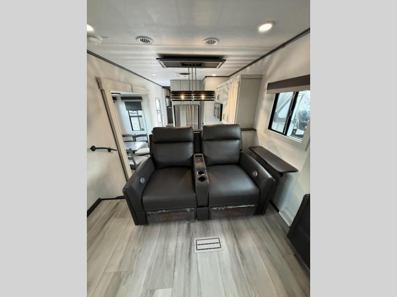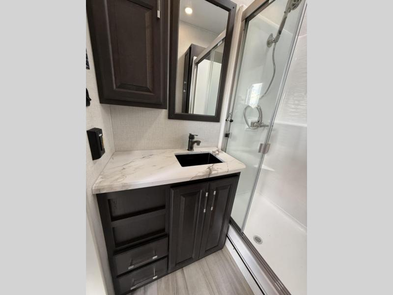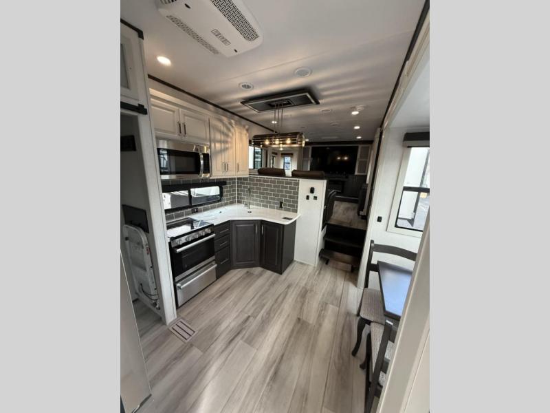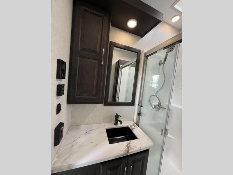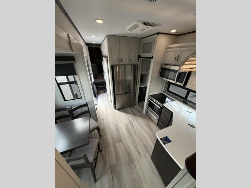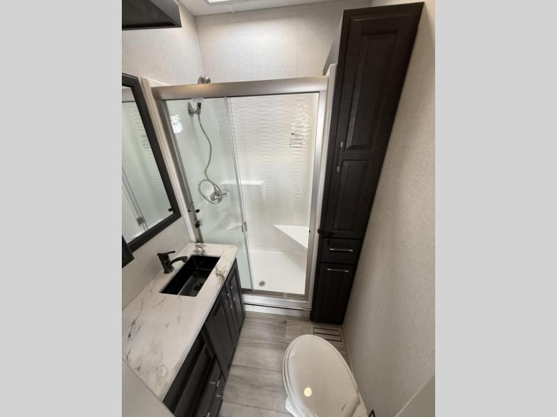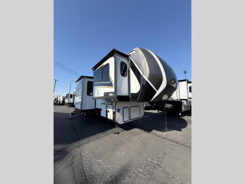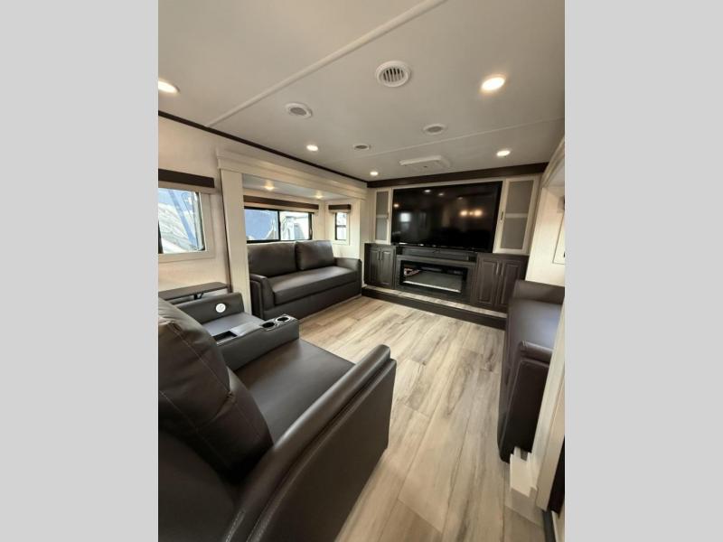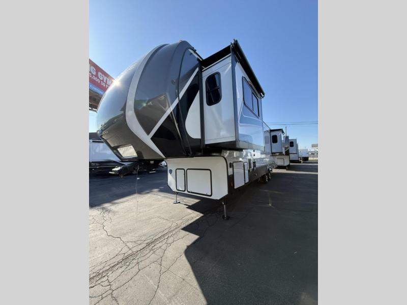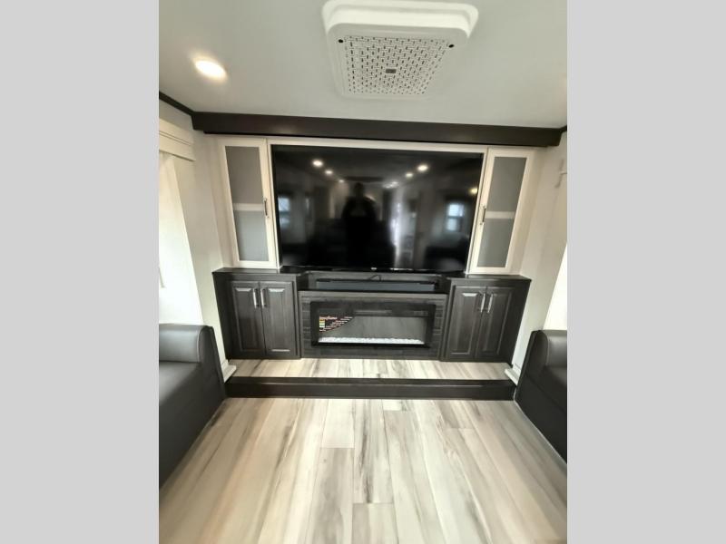 Enjoy traveling with your family and friends in this fifth wheel featuring quad slides providing space for everyone! The front living area offers two of those slides each with a tri-fold sleeper sofa for family or overnight guests. A full wall entertainment center with 65" Smart HD TV and fireplace, plus a theater seat sets this space up as a great gathering place for all to enjoy. Step down to the spacious kitchen and dining area with free standing table and four chairs, a coffee station, plus a refrigerator and range with residential microwave overhead. At the rear of this amazing coach, you will find a raised private master bedroom featuring a king bed slide with storage beneath for extra blankets and such, plus under the entire bedroom area on the outside you will find colossal storage for all sorts of things! The master bedroom offers a master closet, dresser, and a space prepped for a stackable washer and dryer if you choose to add. This unit also features a convenient bathroom located just inside the main entry allowing easy access from outside.