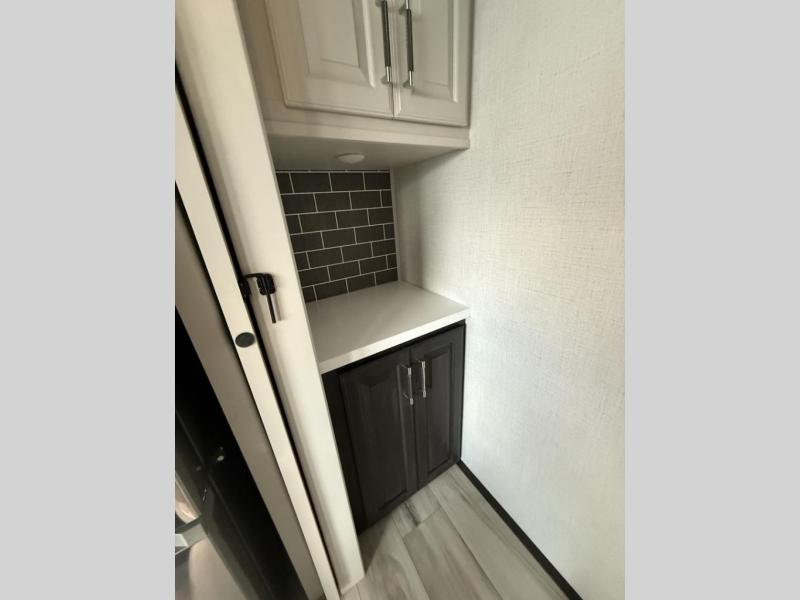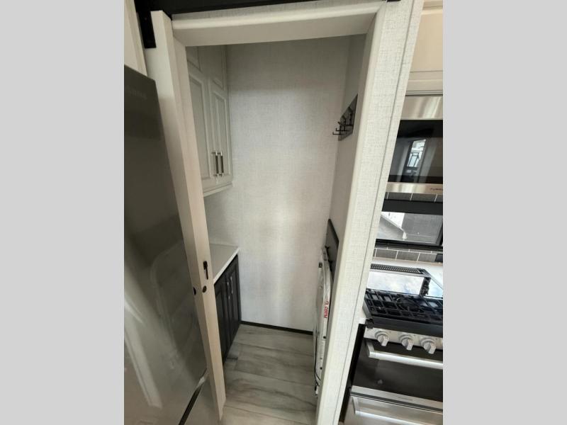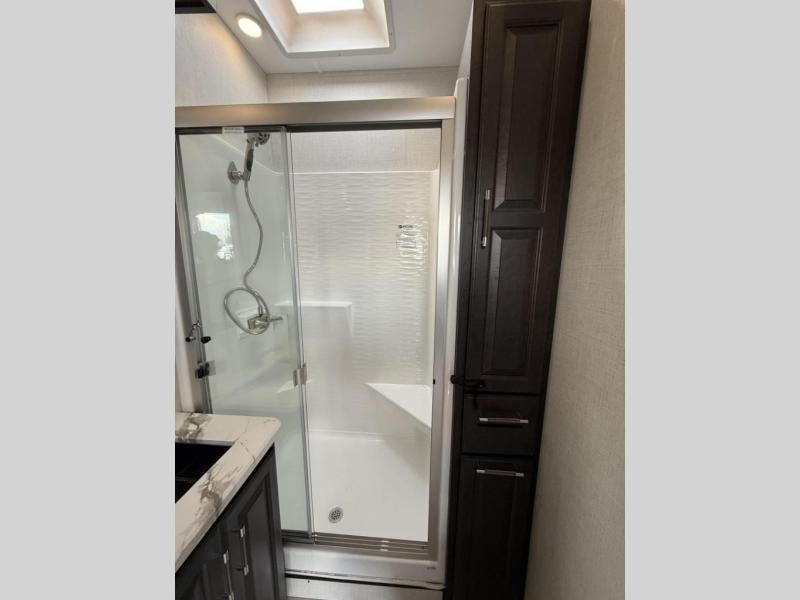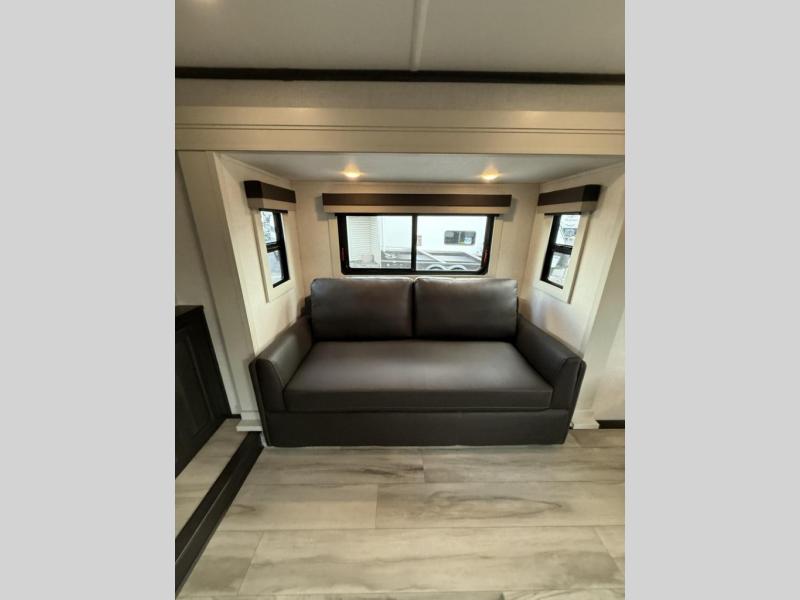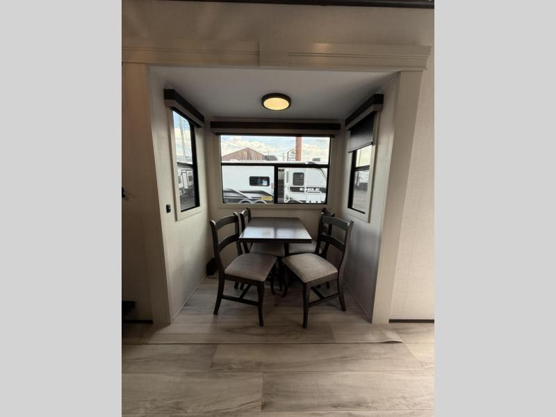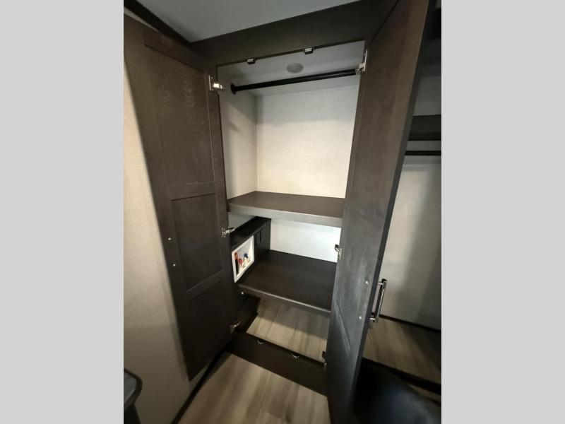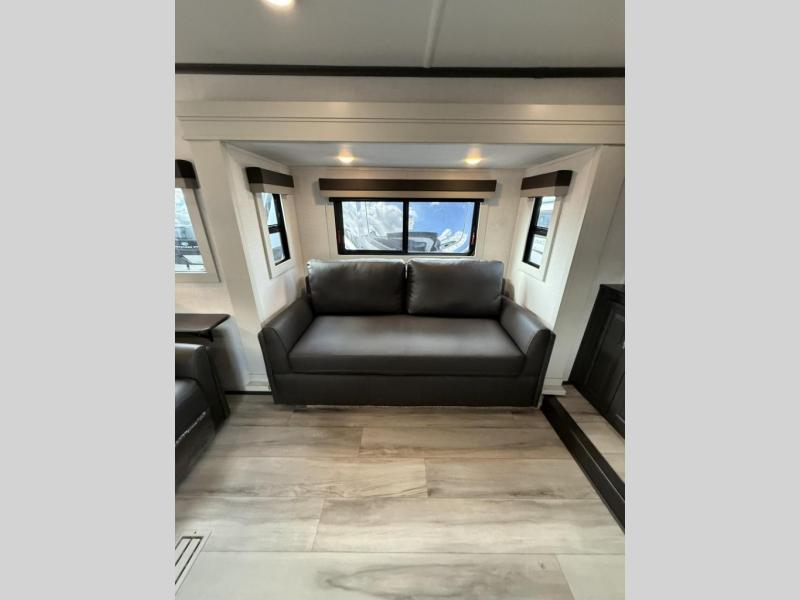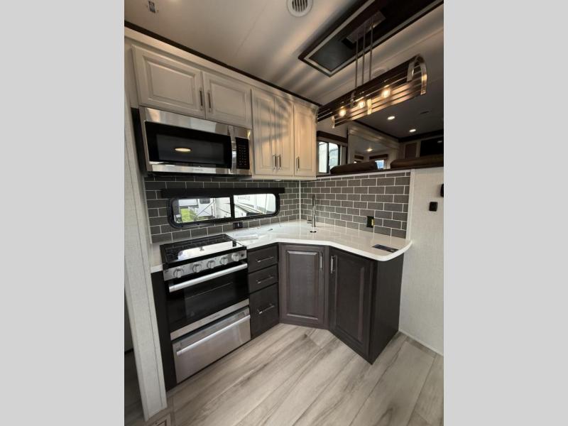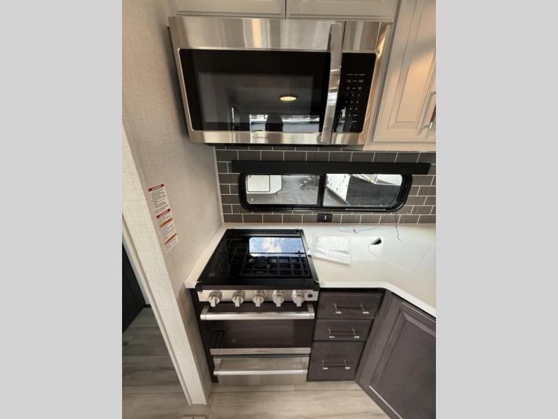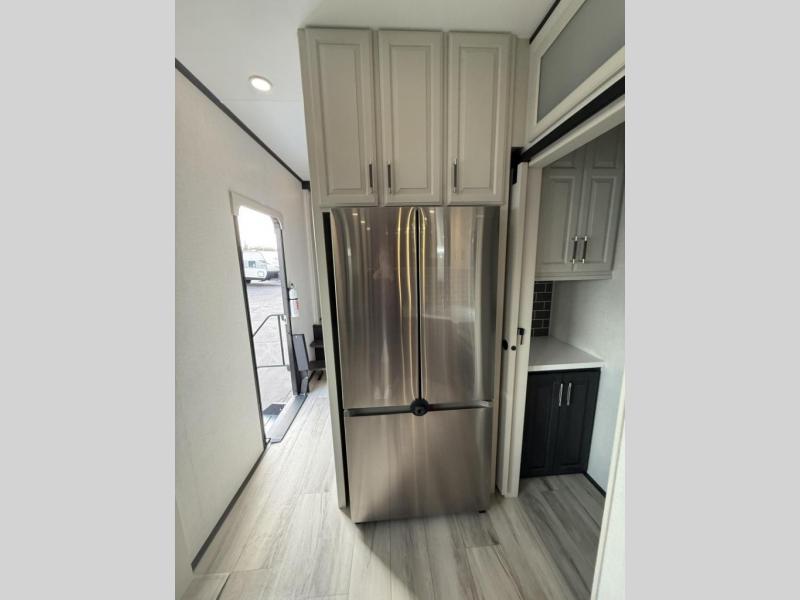 Enjoy traveling with your family and friends in this fifth wheel featuring quad slides providing space for everyone! The front living area offers two of those slides each with a tri-fold sleeper sofa for family or overnight guests. A full wall entertainment center with 65" Smart HD TV and fireplace, plus a theater seat sets this space up as a great gathering place for all to enjoy. Step down to the spacious kitchen and dining area with free standing table and four chairs, a coffee station, plus a refrigerator and range with residential microwave overhead. At the rear of this amazing coach, you will find a raised private master bedroom featuring a king bed slide with storage beneath for extra blankets and such, plus under the entire bedroom area on the outside you will find colossal storage for all sorts of things! The master bedroom offers a master closet, dresser, and a space prepped for a stackable washer and dryer if you choose to add. This unit also features a convenient bathroom located just inside the main entry allowing easy access from outside.
