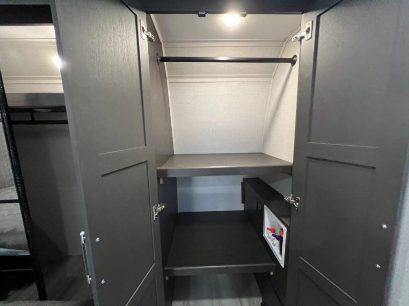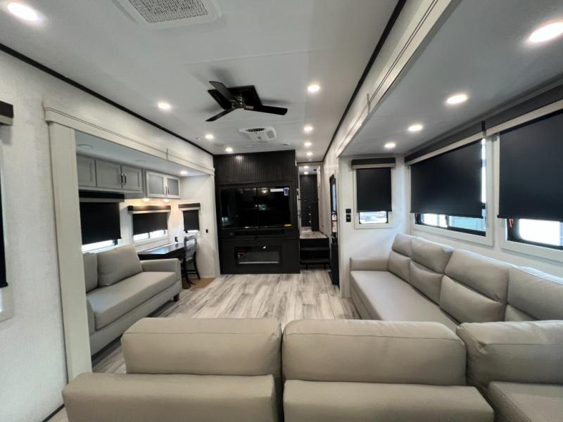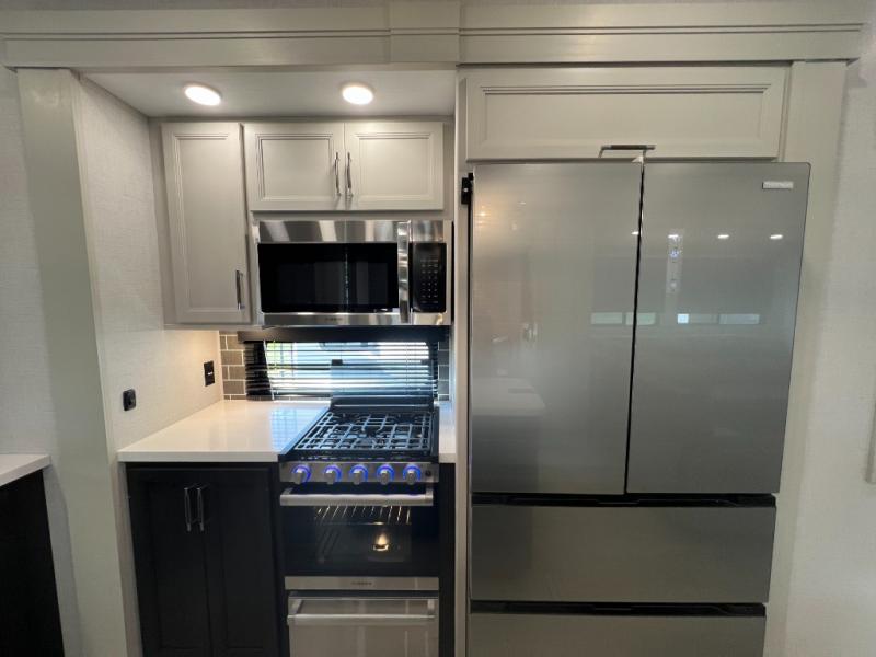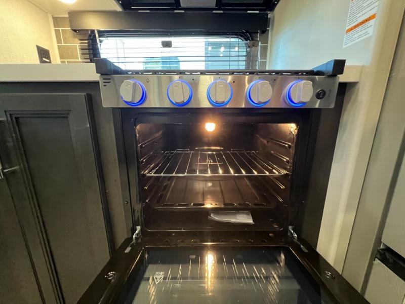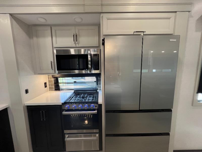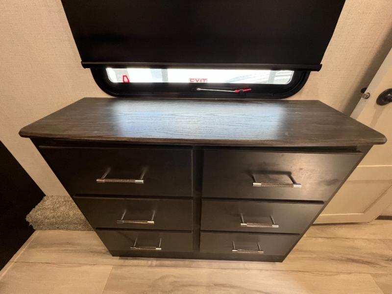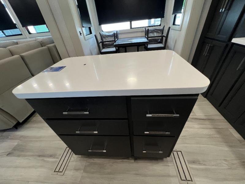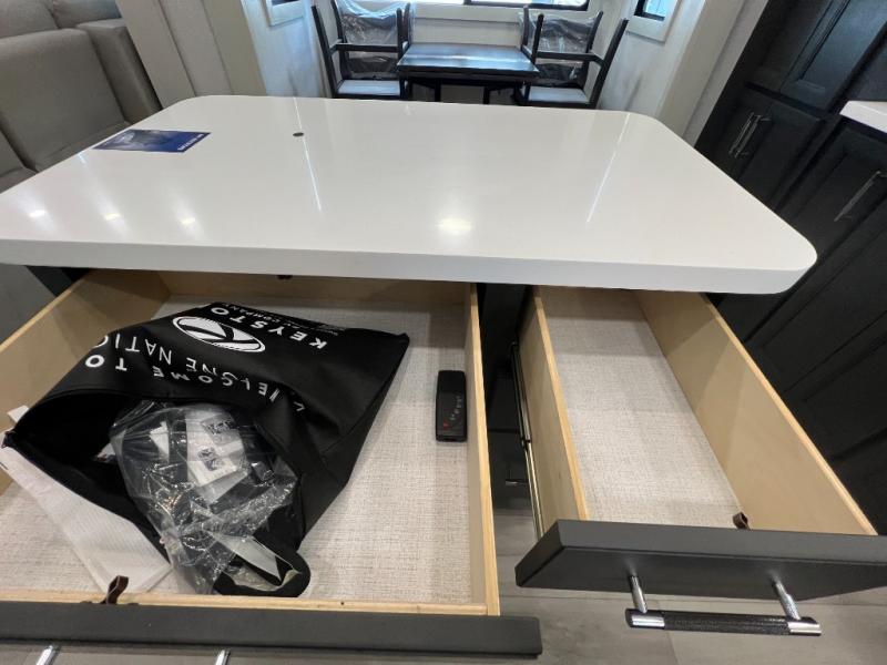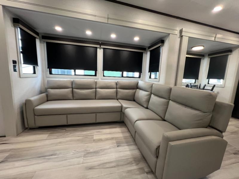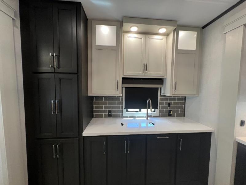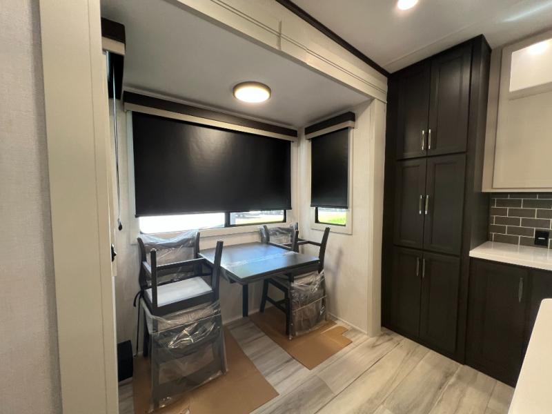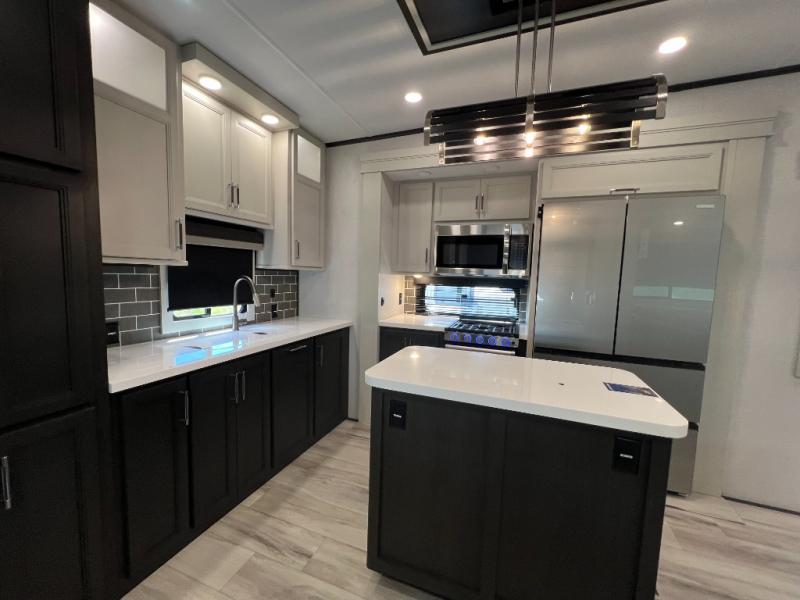 This rear kitchen fifth wheel makes extended stays or weekend trips to the lake enjoyable! The chef of your group will find plenty of counter space with the included kitchen island, plus there is a pantry and 18 cu. ft. residential refrigerator for food storage. A free-standing dinette provides a place to dine together, and the largest L-shaped sofa with recliners will be the perfect spot to relax with a movie. If you have guests, they could sleep here or on the hide-a-bed sofa sleeper. The dual entry bath includes a shower with a seat for added comfort, and the front master bedroom will feel just like home with its king bed slide out and master closet. There is also a dresser and stackable washer and dryer prep if you want to add those appliances!
