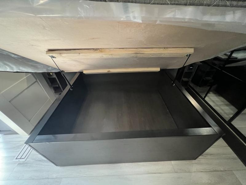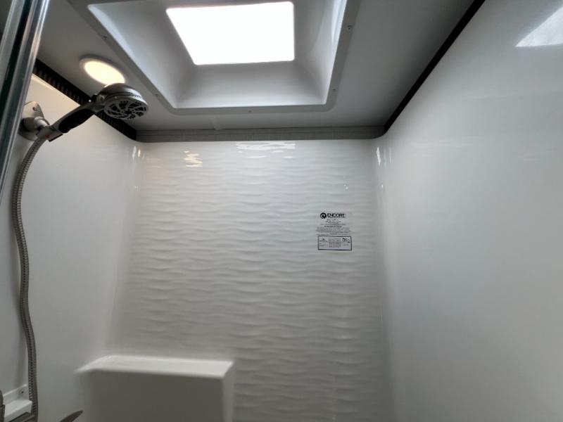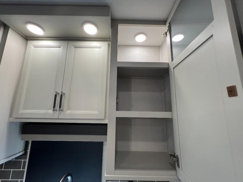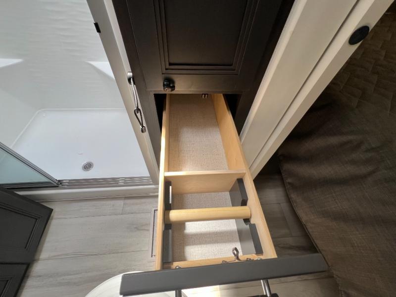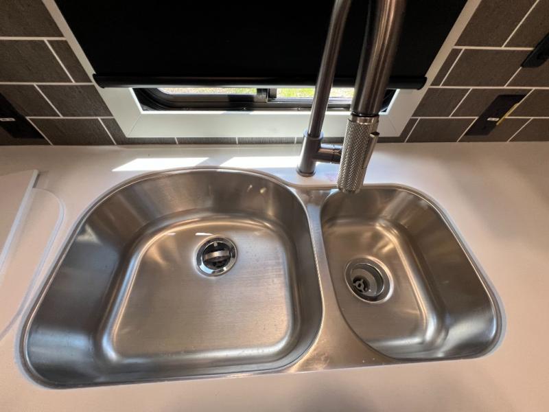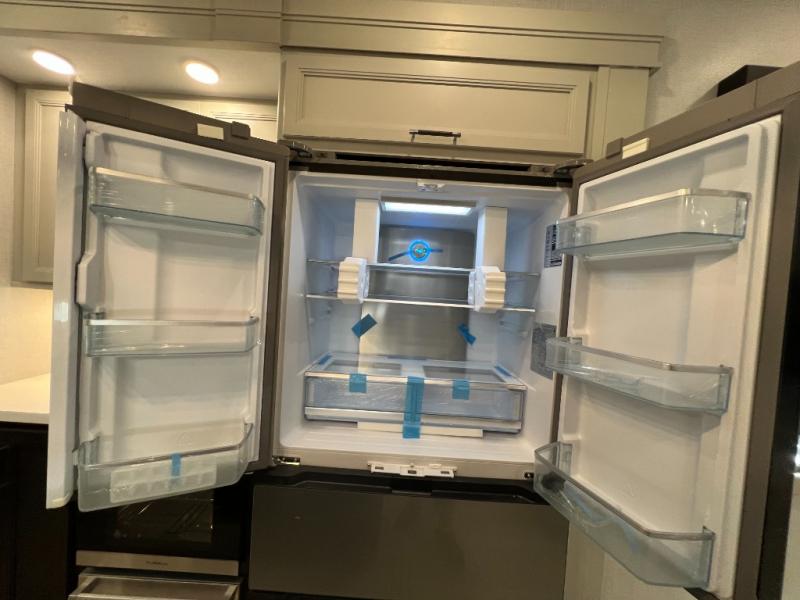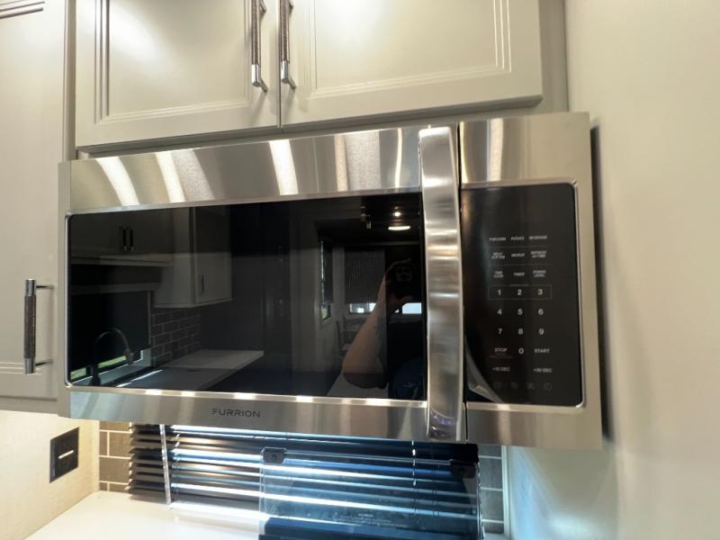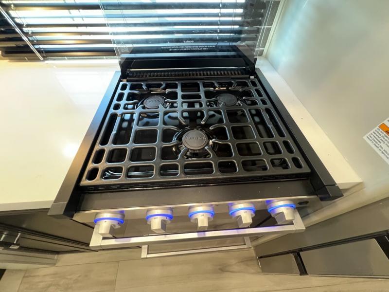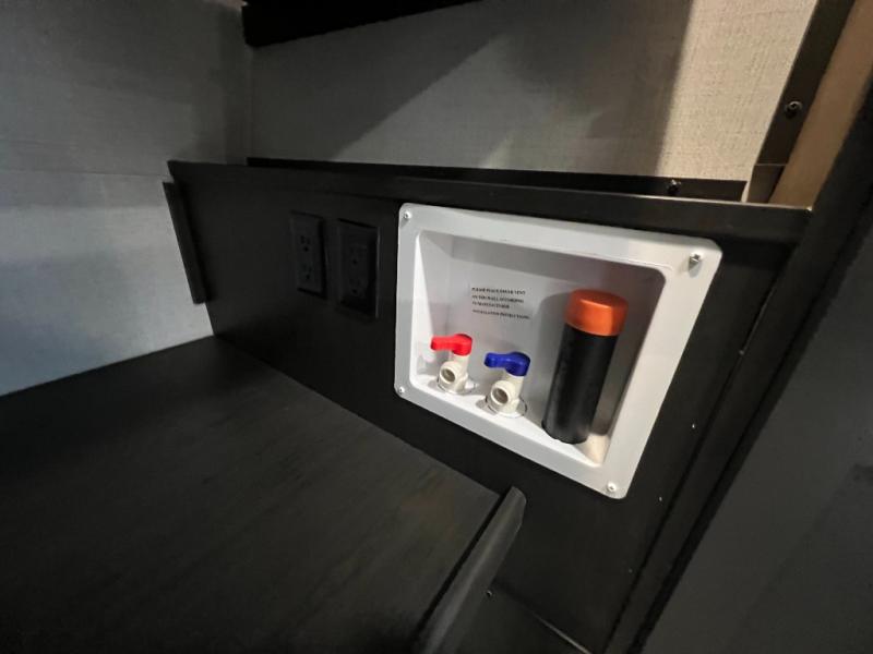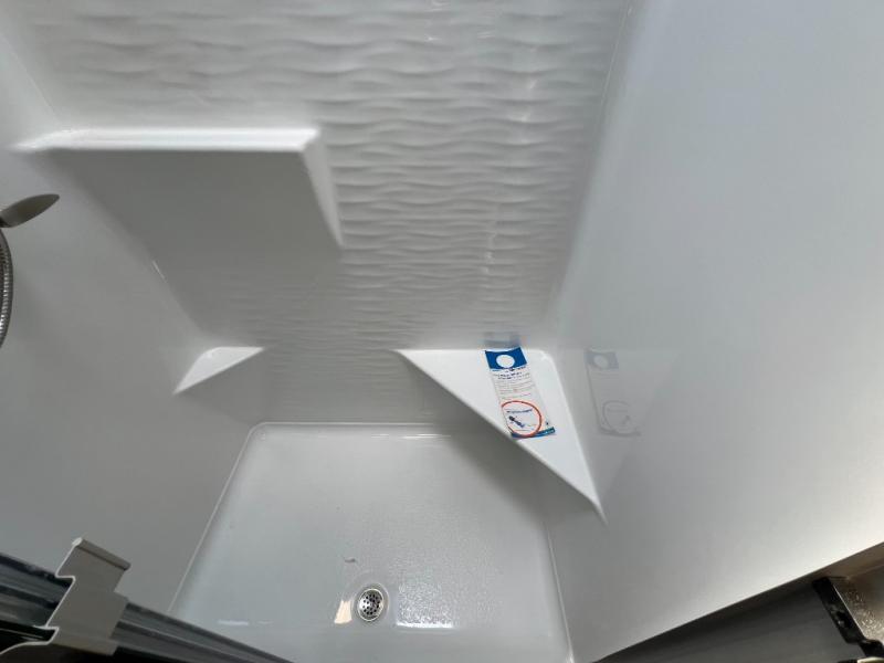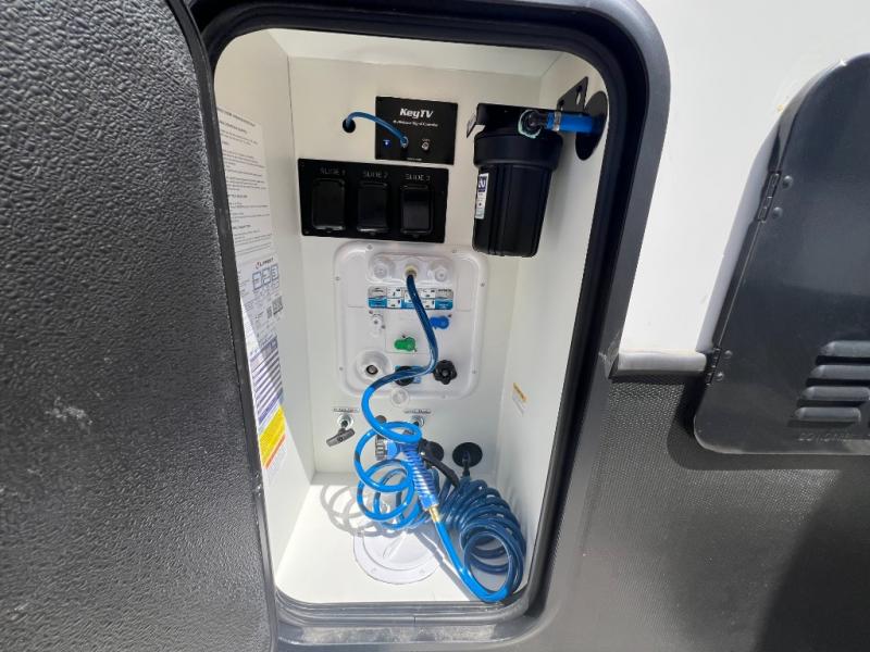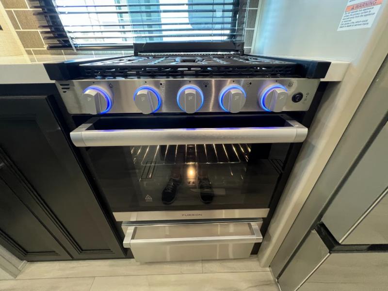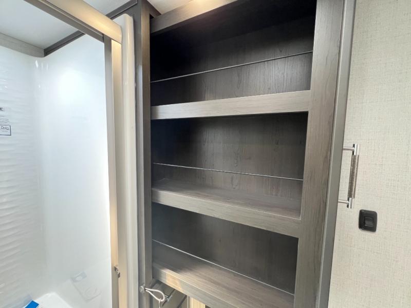 This rear kitchen fifth wheel makes extended stays or weekend trips to the lake enjoyable! The chef of your group will find plenty of counter space with the included kitchen island, plus there is a pantry and 18 cu. ft. residential refrigerator for food storage. A free-standing dinette provides a place to dine together, and the largest L-shaped sofa with recliners will be the perfect spot to relax with a movie. If you have guests, they could sleep here or on the hide-a-bed sofa sleeper. The dual entry bath includes a shower with a seat for added comfort, and the front master bedroom will feel just like home with its king bed slide out and master closet. There is also a dresser and stackable washer and dryer prep if you want to add those appliances!