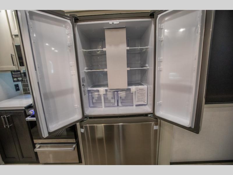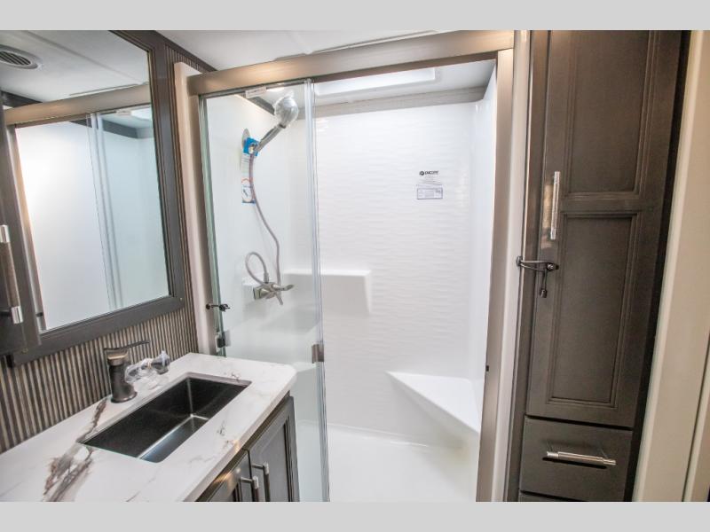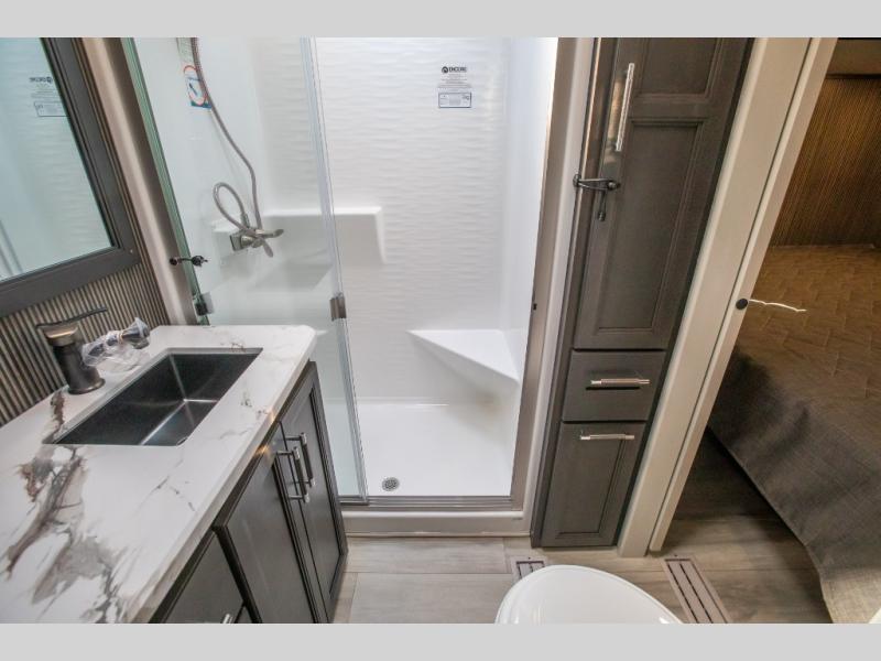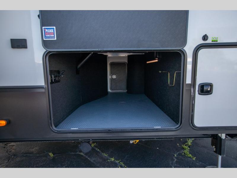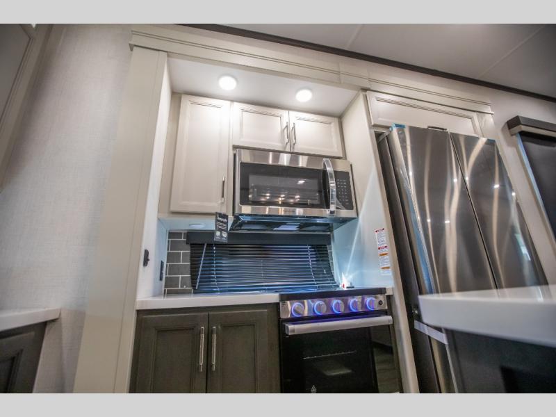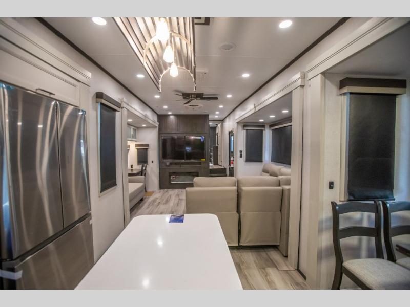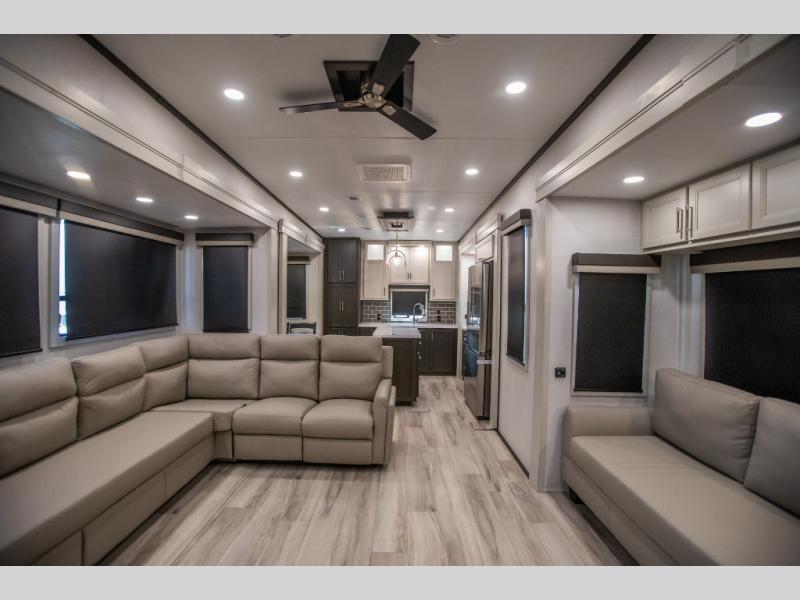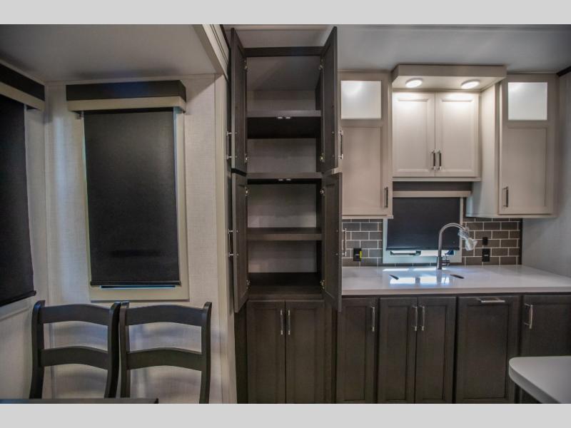This rear kitchen fifth wheel makes extended stays or weekend trips to the lake enjoyable! The chef of your group will find plenty of counter space with the included kitchen island, plus there is a pantry and 18 cu. ft. residential refrigerator for food storage. A free-standing dinette provides a place to dine together, and the largest L-shaped sofa with recliners will be the perfect spot to relax with a movie. If you have guests, they could sleep here or on the hide-a-bed sofa sleeper. The dual entry bath includes a shower with a seat for added comfort, and the front master bedroom will feel just like home with its king bed slide out and master closet. There is also a dresser and stackable washer and dryer prep if you want to add those appliances!