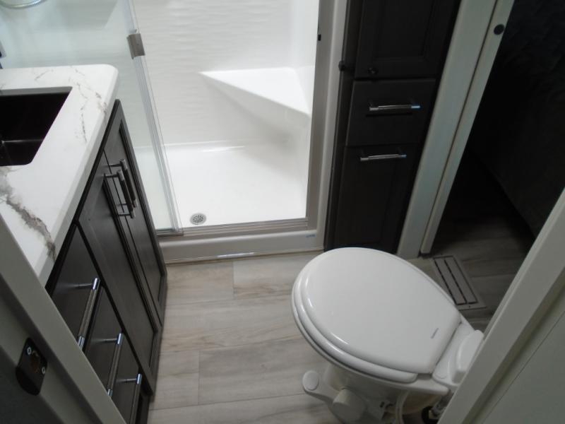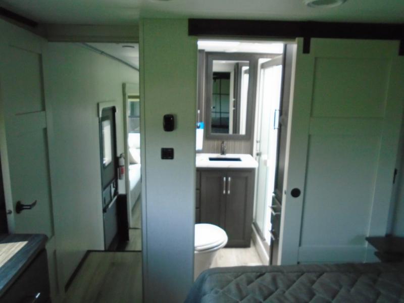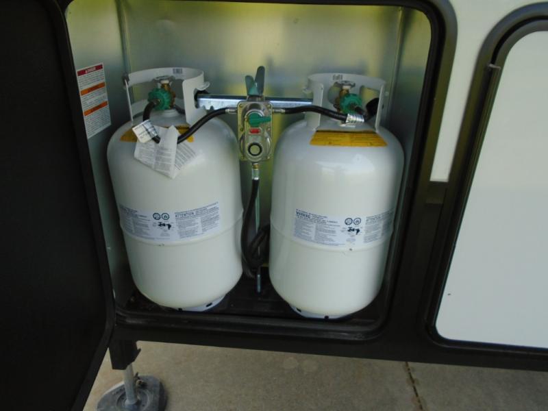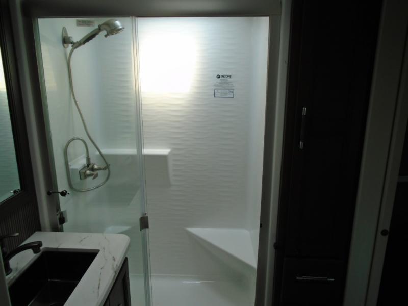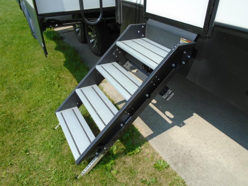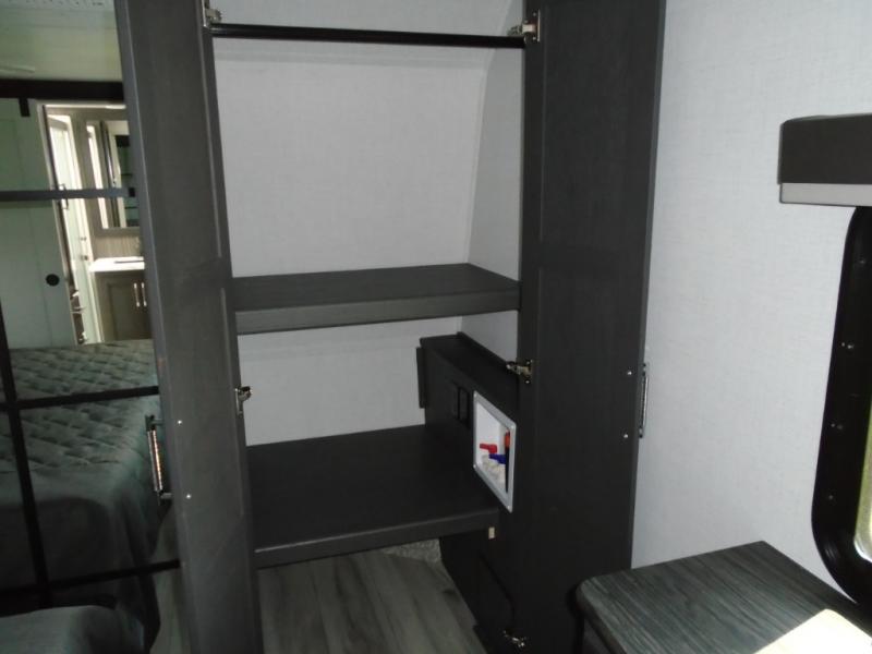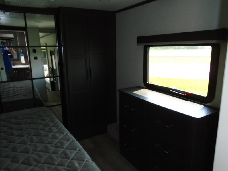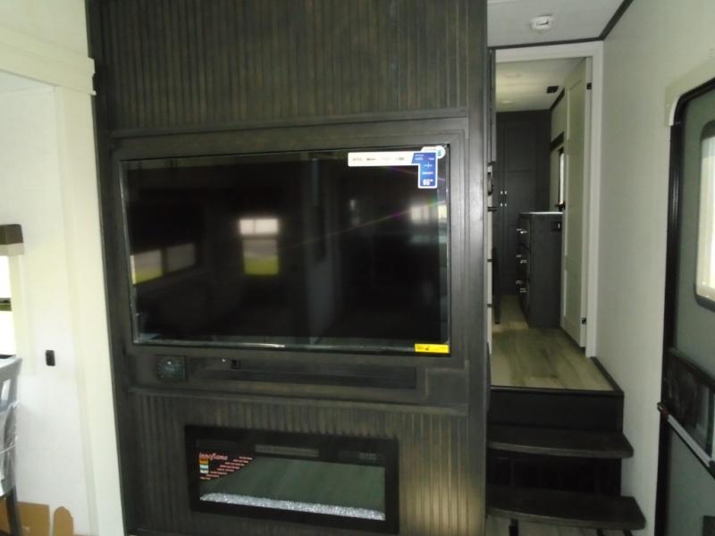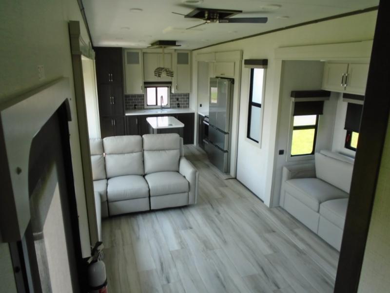 This rear kitchen fifth wheel makes extended stays or weekend trips to the lake enjoyable! The chef of your group will find plenty of counter space with the included kitchen island, plus there is a pantry and 18 cu. ft. residential refrigerator for food storage. A free-standing dinette provides a place to dine together, and the largest L-shaped sofa with recliners will be the perfect spot to relax with a movie. If you have guests, they could sleep here or on the hide-a-bed sofa sleeper. The dual entry bath includes a shower with a seat for added comfort, and the front master bedroom will feel just like home with its king bed slide out and master closet. There is also a dresser and stackable washer and dryer prep if you want to add those appliances!