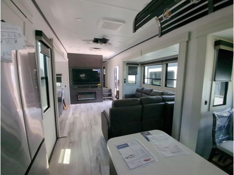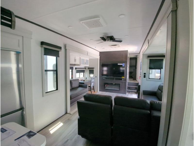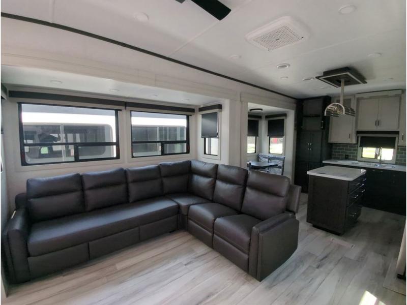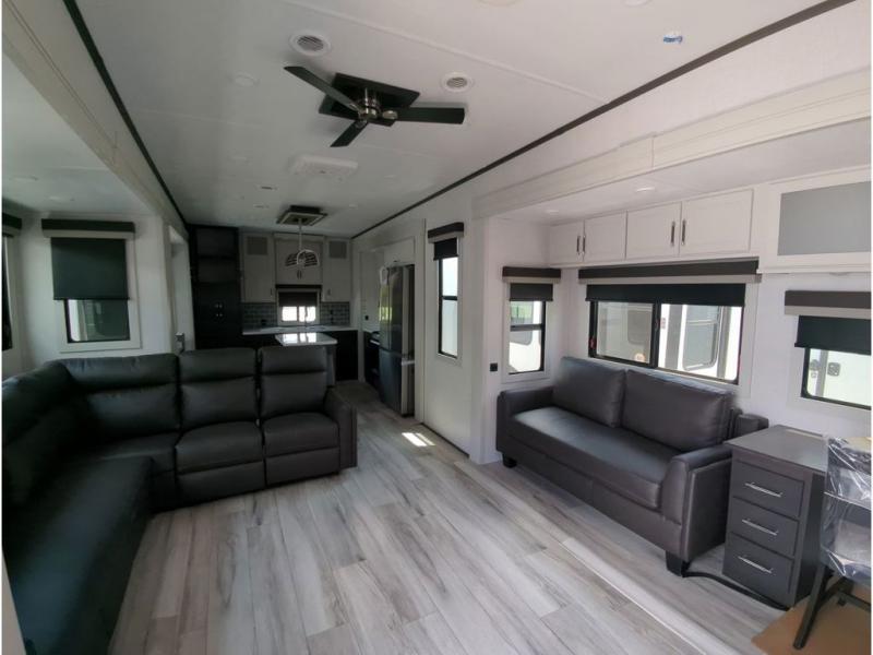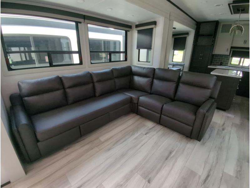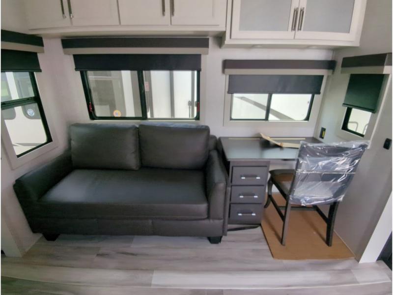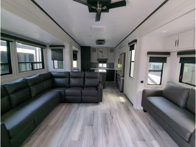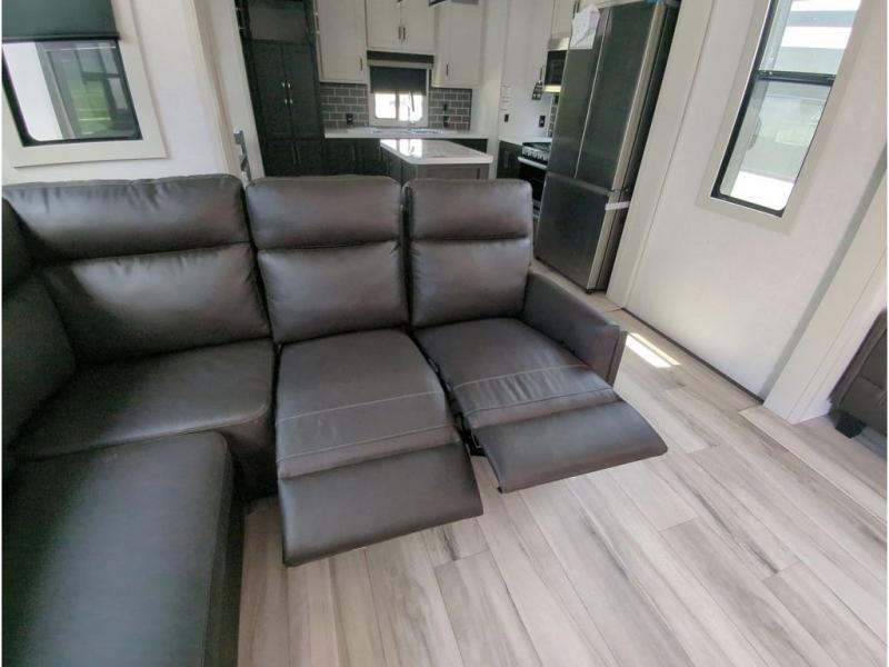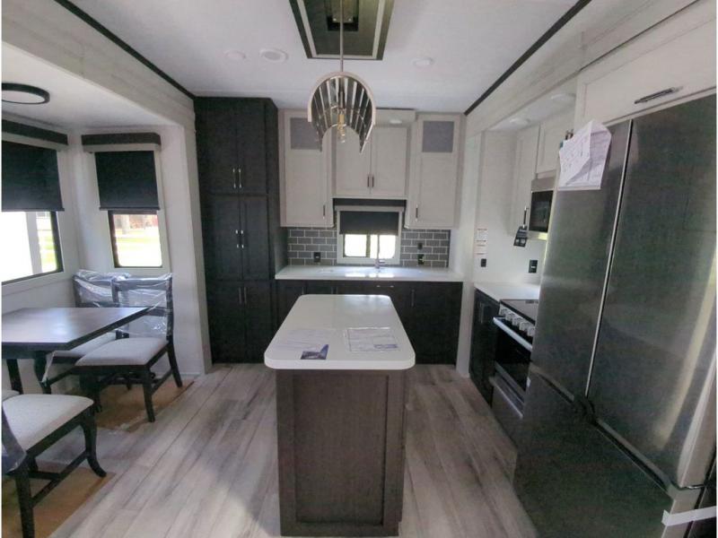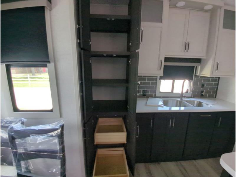 This rear kitchen fifth wheel makes extended stays or weekend trips to the lake enjoyable! The chef of your group will find plenty of counter space with the included kitchen island, plus there is a pantry and 18 cu. ft. residential refrigerator for food storage. A free-standing dinette provides a place to dine together, and the largest L-shaped sofa with recliners will be the perfect spot to relax with a movie. If you have guests, they could sleep here or on the hide-a-bed sofa sleeper. The dual entry bath includes a shower with a seat for added comfort, and the front master bedroom will feel just like home with its king bed slide out and master closet. There is also a dresser and stackable washer and dryer prep if you want to add those appliances!