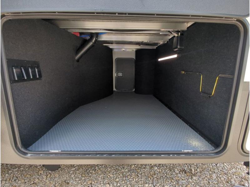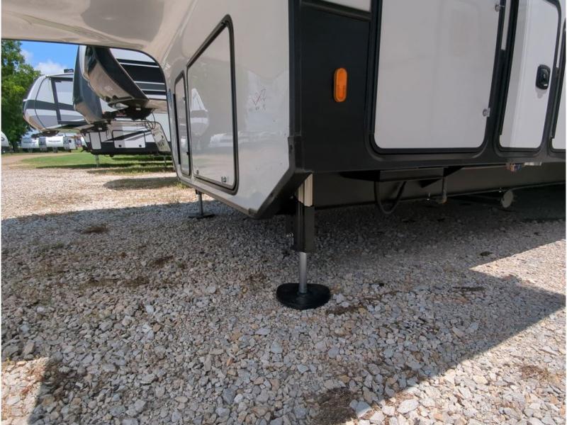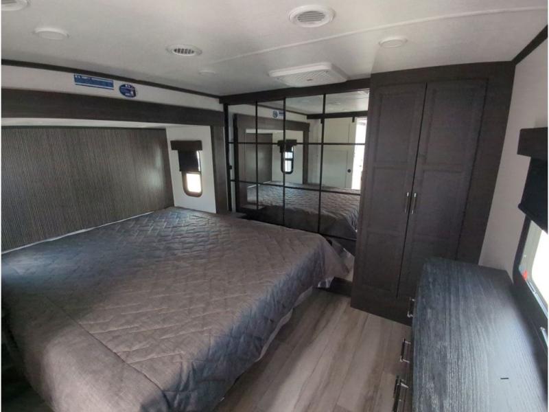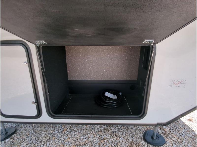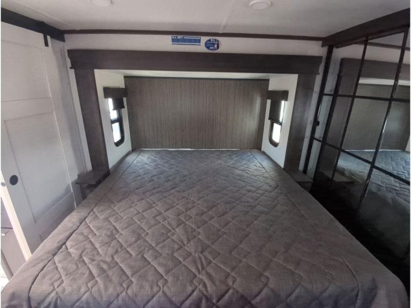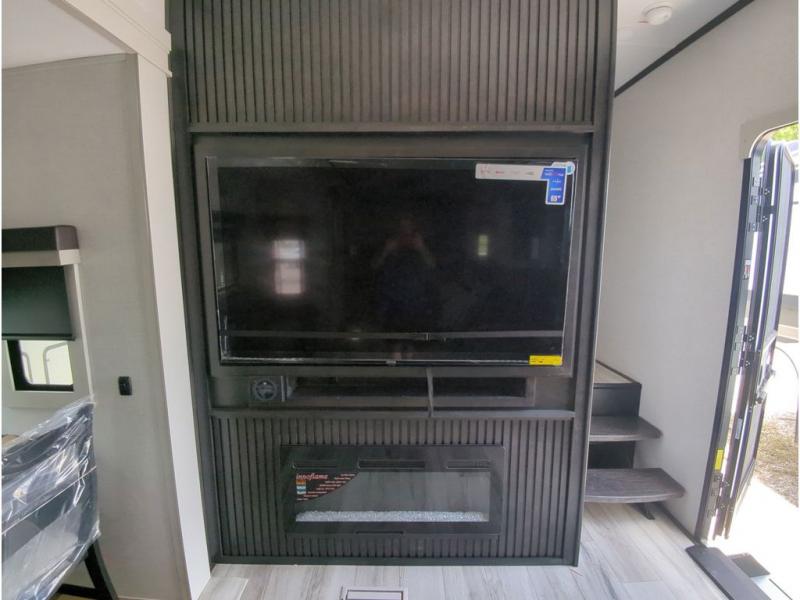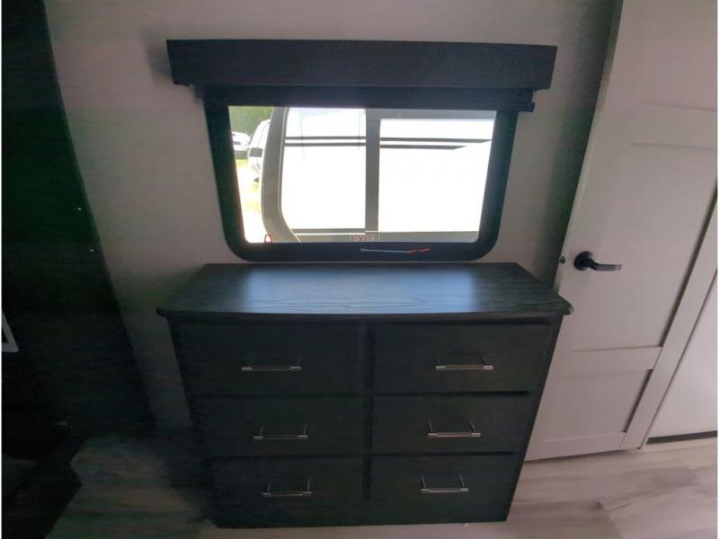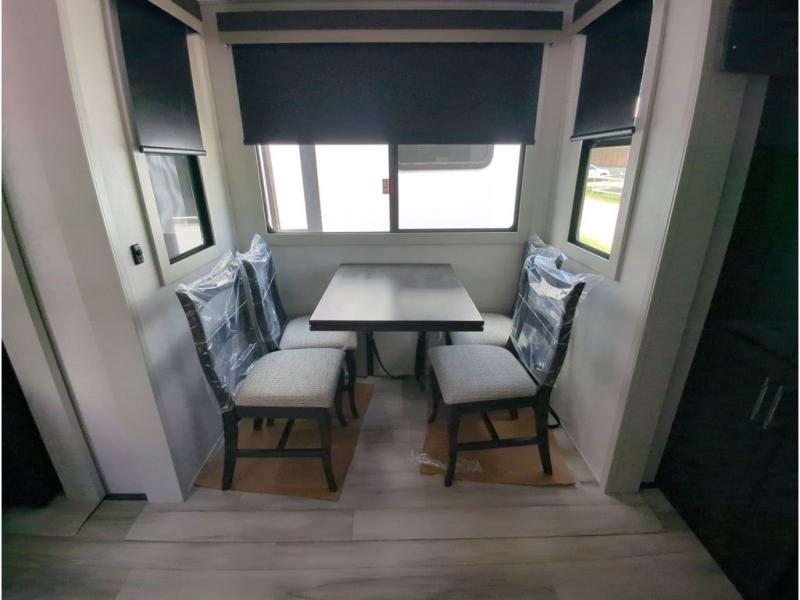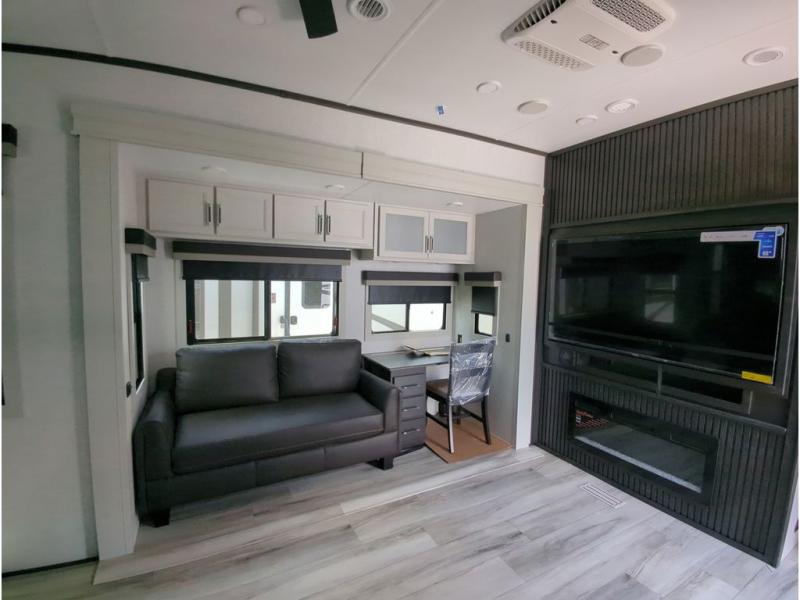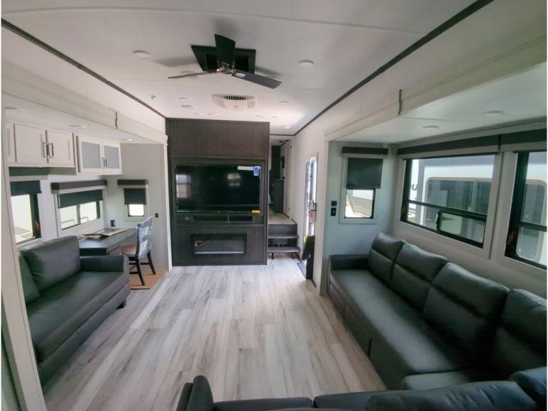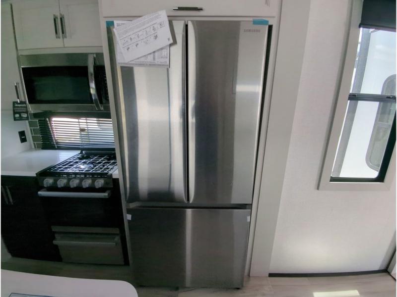 This rear kitchen fifth wheel makes extended stays or weekend trips to the lake enjoyable! The chef of your group will find plenty of counter space with the included kitchen island, plus there is a pantry and 18 cu. ft. residential refrigerator for food storage. A free-standing dinette provides a place to dine together, and the largest L-shaped sofa with recliners will be the perfect spot to relax with a movie. If you have guests, they could sleep here or on the hide-a-bed sofa sleeper. The dual entry bath includes a shower with a seat for added comfort, and the front master bedroom will feel just like home with its king bed slide out and master closet. There is also a dresser and stackable washer and dryer prep if you want to add those appliances!