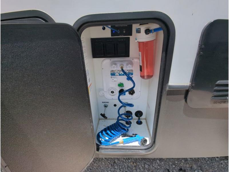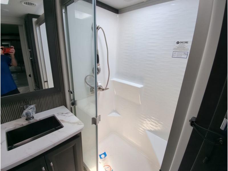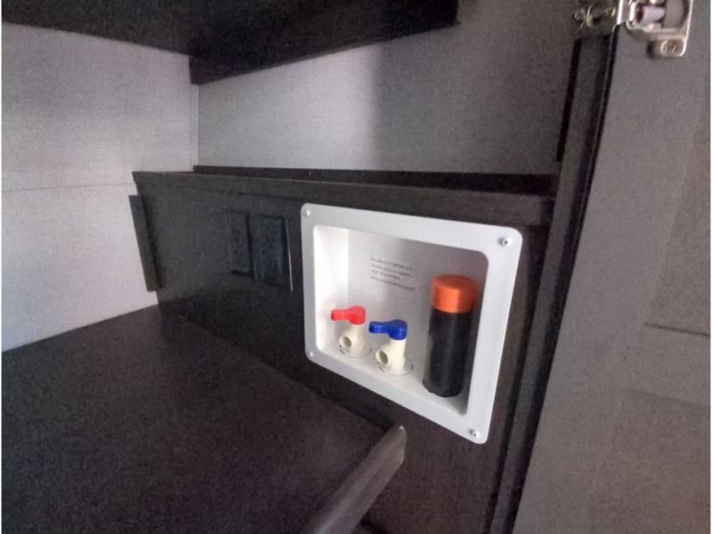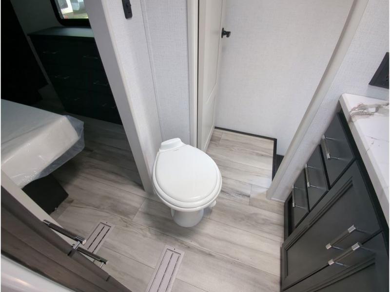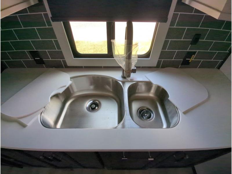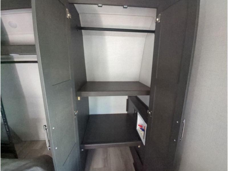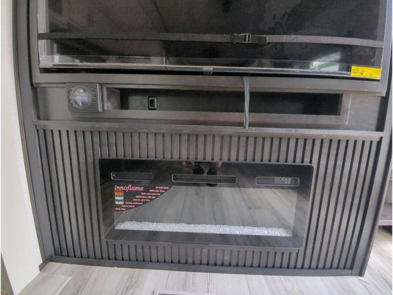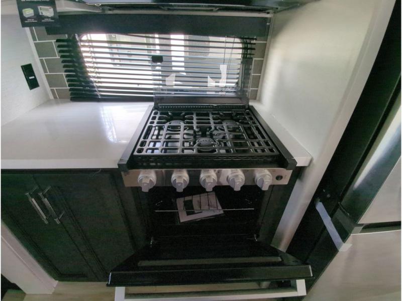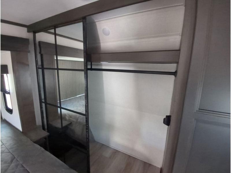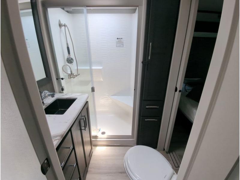 This rear kitchen fifth wheel makes extended stays or weekend trips to the lake enjoyable! The chef of your group will find plenty of counter space with the included kitchen island, plus there is a pantry and 18 cu. ft. residential refrigerator for food storage. A free-standing dinette provides a place to dine together, and the largest L-shaped sofa with recliners will be the perfect spot to relax with a movie. If you have guests, they could sleep here or on the hide-a-bed sofa sleeper. The dual entry bath includes a shower with a seat for added comfort, and the front master bedroom will feel just like home with its king bed slide out and master closet. There is also a dresser and stackable washer and dryer prep if you want to add those appliances!