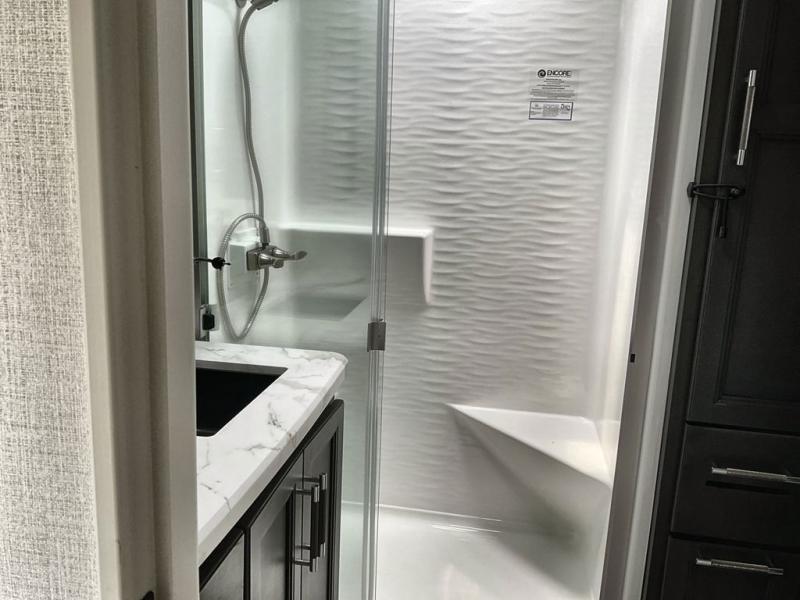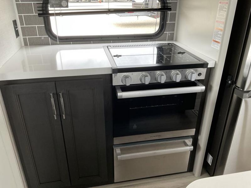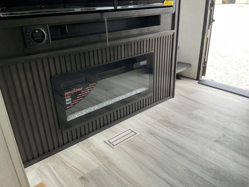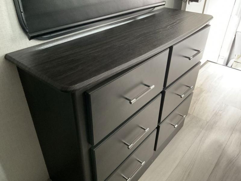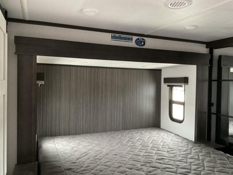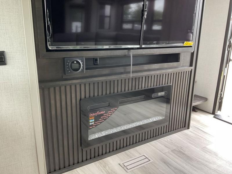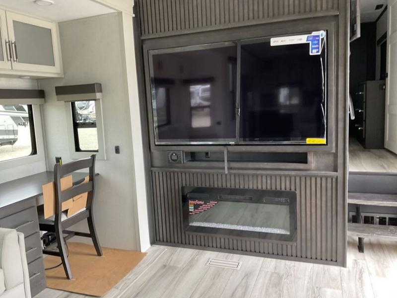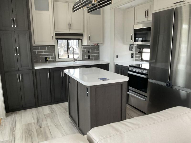 This rear kitchen fifth wheel makes extended stays or weekend trips to the lake enjoyable! The chef of your group will find plenty of counter space with the included kitchen island, plus there is a pantry and 18 cu. ft. residential refrigerator for food storage. A free-standing dinette provides a place to dine together, and the largest L-shaped sofa with recliners will be the perfect spot to relax with a movie. If you have guests, they could sleep here or on the hide-a-bed sofa sleeper. The dual entry bath includes a shower with a seat for added comfort, and the front master bedroom will feel just like home with its king bed slide out and master closet. There is also a dresser and stackable washer and dryer prep if you want to add those appliances!