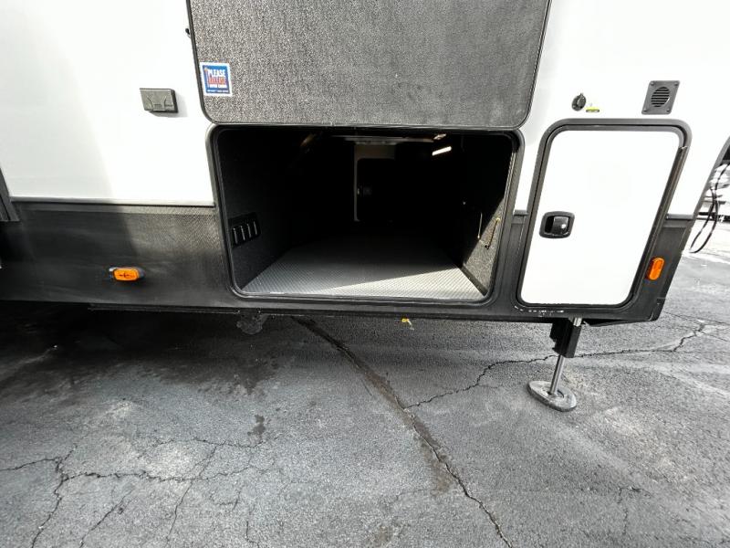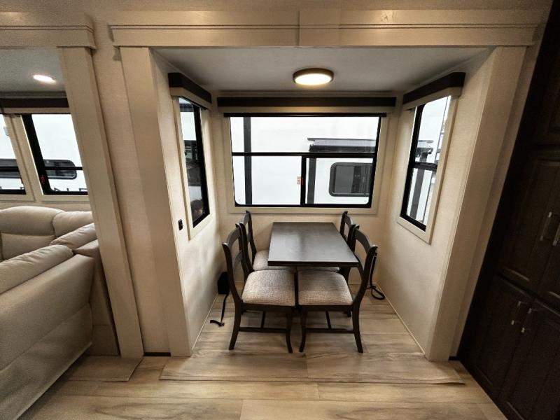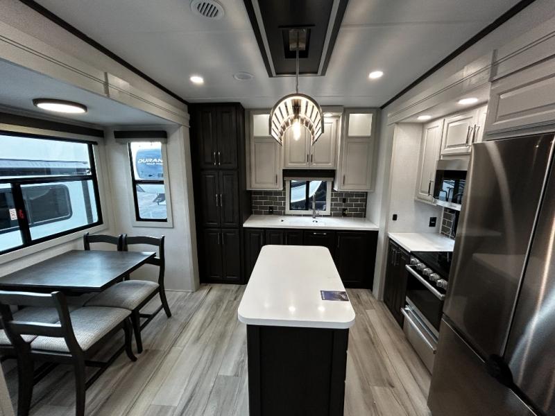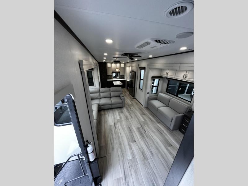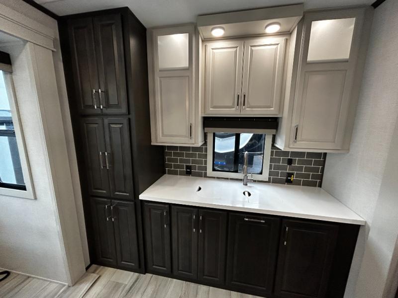 This rear kitchen fifth wheel makes extended stays or weekend trips to the lake enjoyable! The chef of your group will find plenty of counter space with the included kitchen island, plus there is a pantry and 18 cu. ft. residential refrigerator for food storage. A free-standing dinette provides a place to dine together, and the largest L-shaped sofa with recliners will be the perfect spot to relax with a movie. If you have guests, they could sleep here or on the hide-a-bed sofa sleeper. The dual entry bath includes a shower with a seat for added comfort, and the front master bedroom will feel just like home with its king bed slide out and master closet. There is also a dresser and stackable washer and dryer prep if you want to add those appliances!