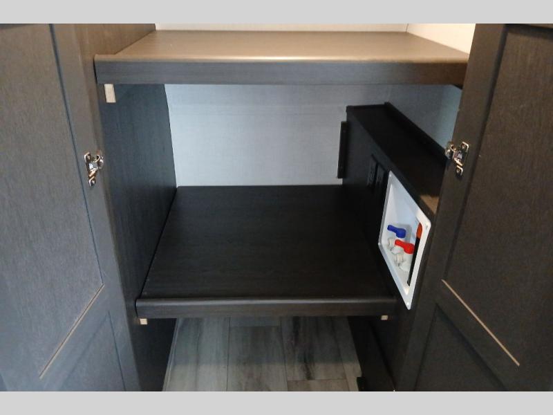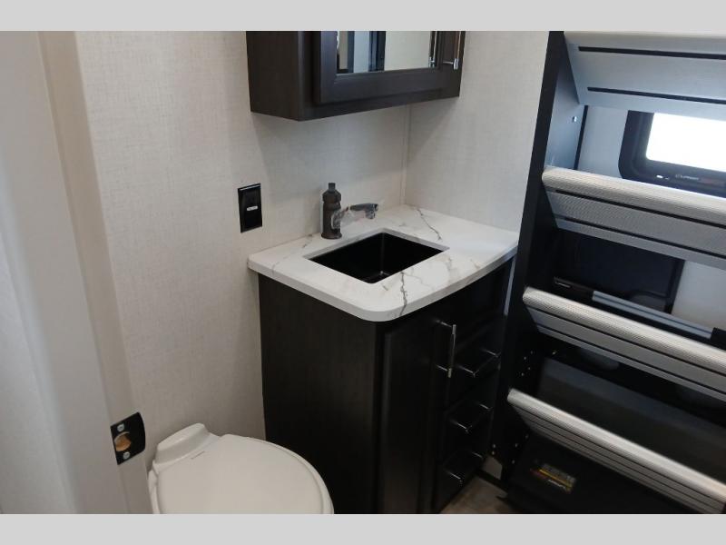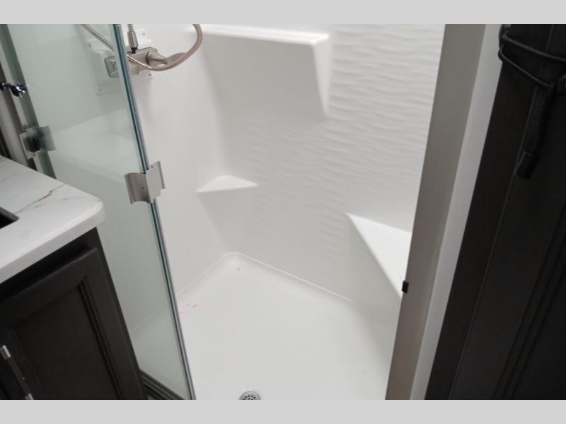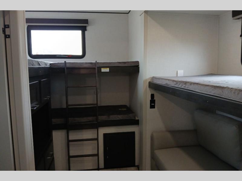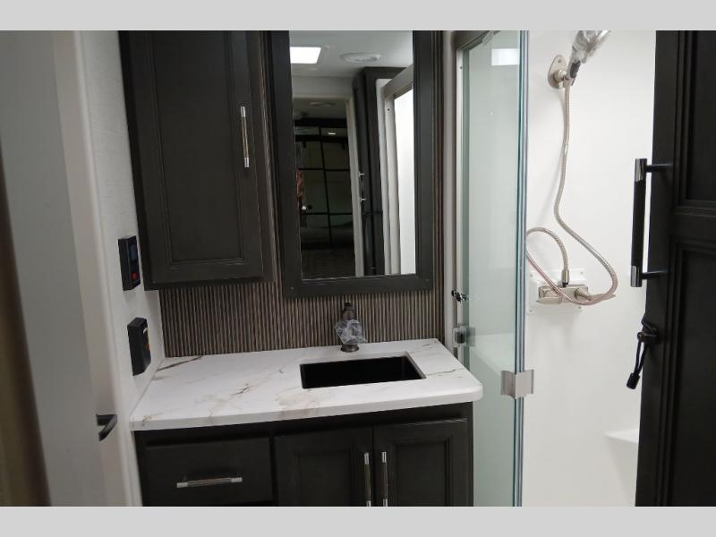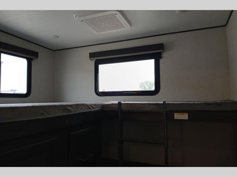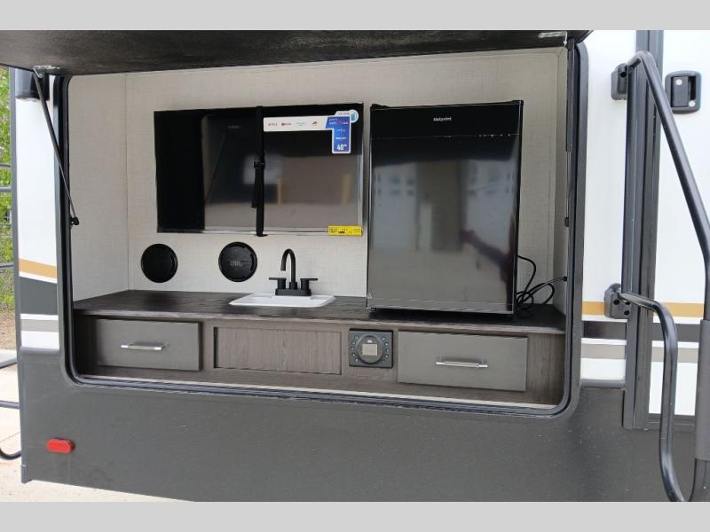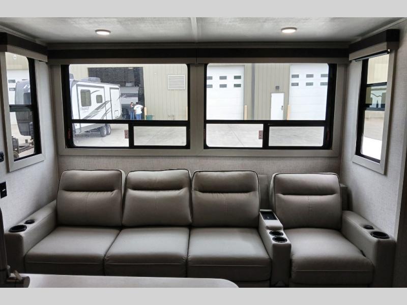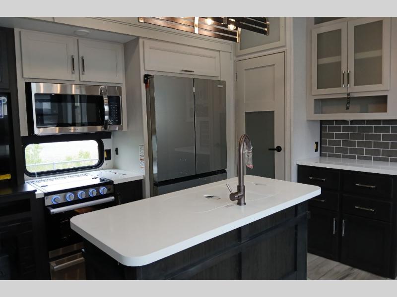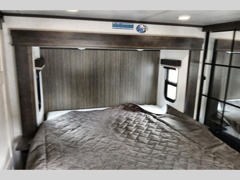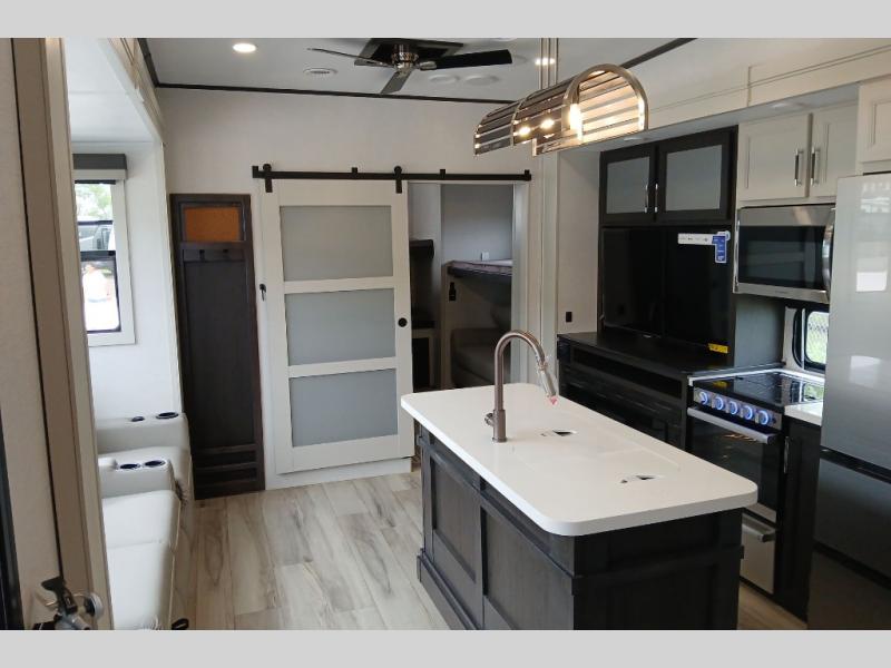 You won't believe how many extravagant details have been included in this fifth wheel! Traveling with guests or extended family will be easy to do with the separate bunkhouse suite that sleeps six, plus a master suite on the opposite end. The bunkhouse suite also features a half bath with a private entrance for added convenience. The kitchen and combined living room area features dual opposing slides to really open up the room. A center island allows for added prep space and the double sink is located here too. A tri-fold sofa with removeable table and recliner offers seating for four to watch TV since the bunkhouse also offers a space for A TV and has a hide-a-bed sofa to hang out where the kids or extra guests can have a space to relax all on their own. You will appreciate the master bedroom with king bed slide, master closet and prepped space to add a stackable washer and dryer.