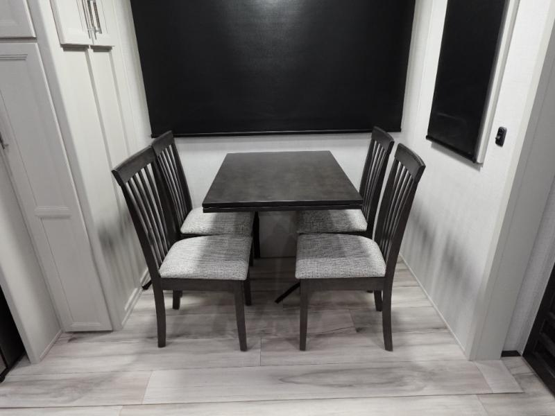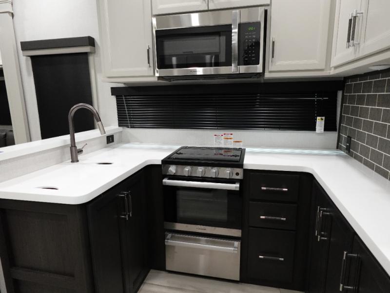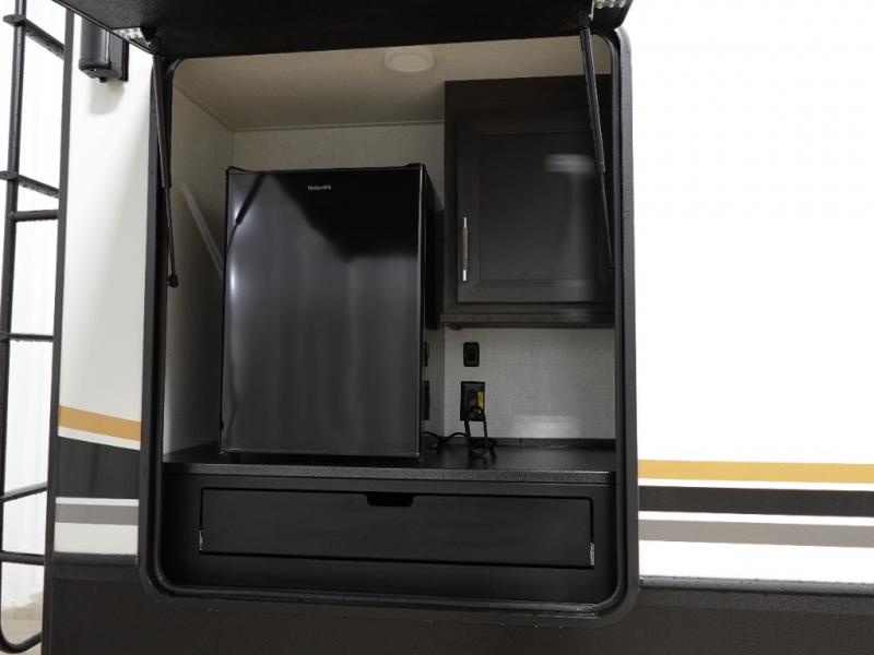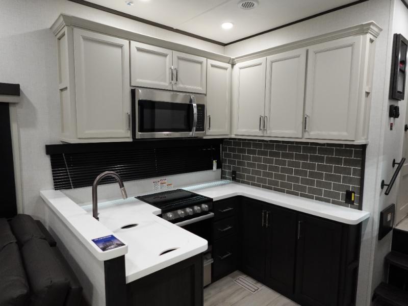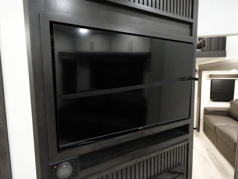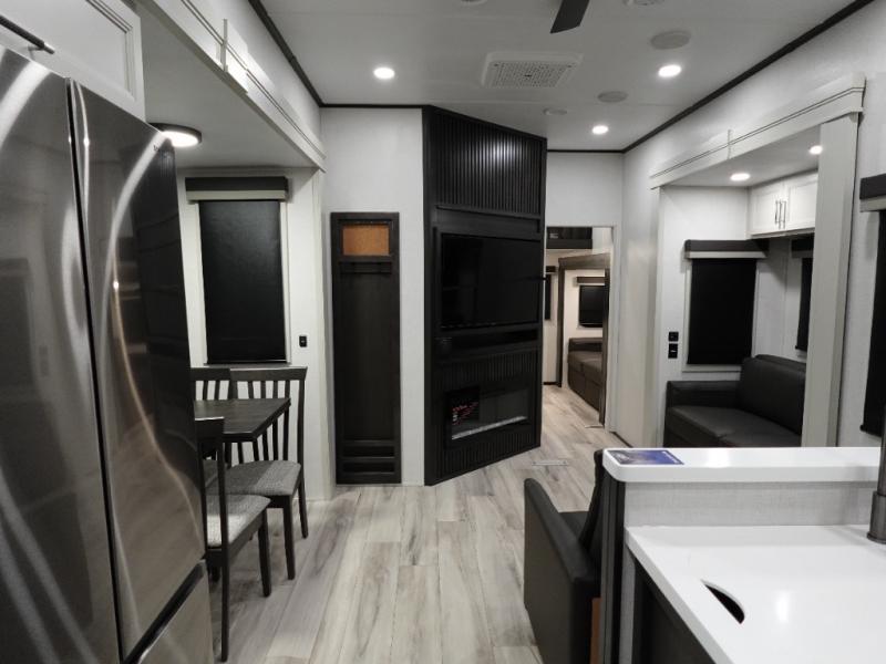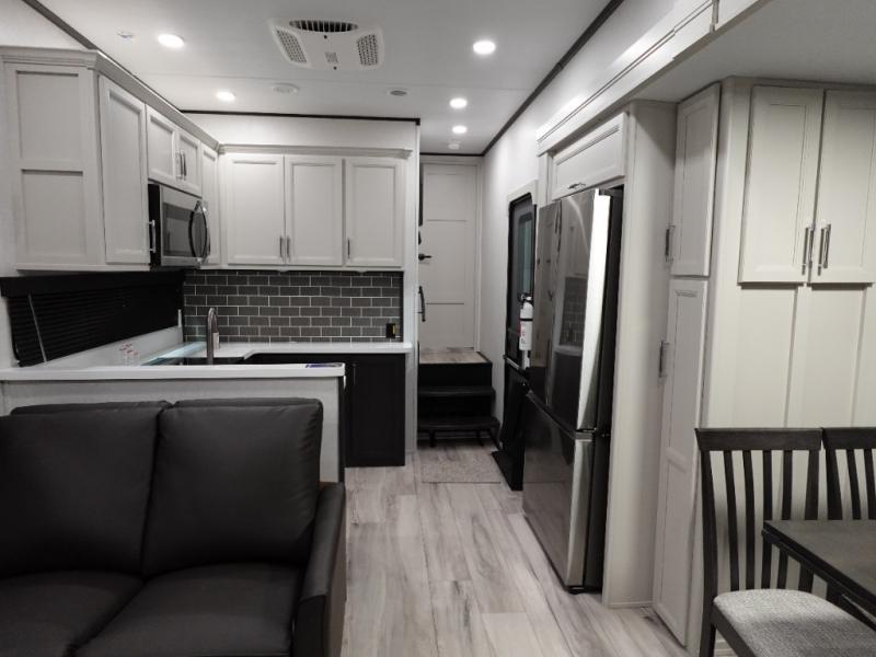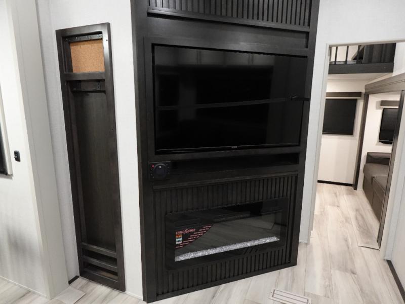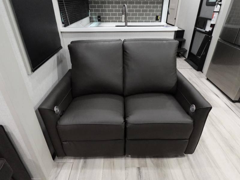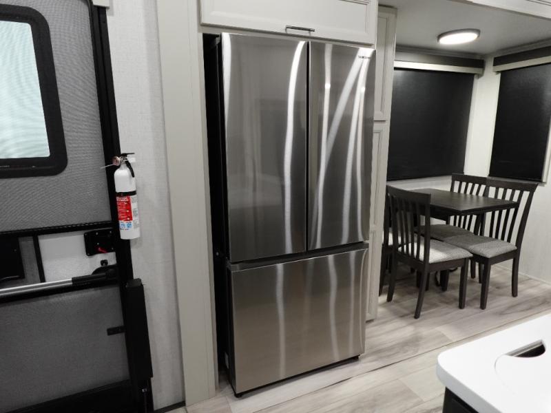 Are you looking for a spacious fifth wheel with space for you and your guests? Look no further than this four slide out unit with dual entry doors, a front master bedroom, and a rear bedroom/den with a loft! There is also a half bath here and a hide-a-bed sofa with storage underneath. You'll find the second hide-a-bed sofa in the living room, along with theater seating, a feature wall with a 50" TV, and a free-standing dinette with chairs where you can dine together. Furrion appliances in the kitchen let you create yummy meals each day, and there is a pantry and residential refrigerator to keep food stocked. Head to the front master bedroom where you can relax on the king bed slide out, store your clothes in the master closet, and easily use the dual entry bath. There is even stackable washer and dryer prep if you want the option to make laundry day easier!
