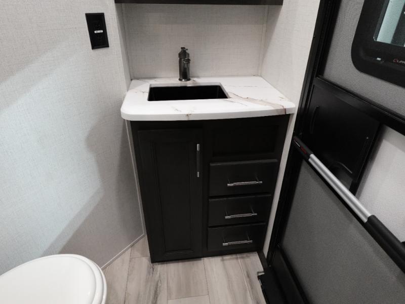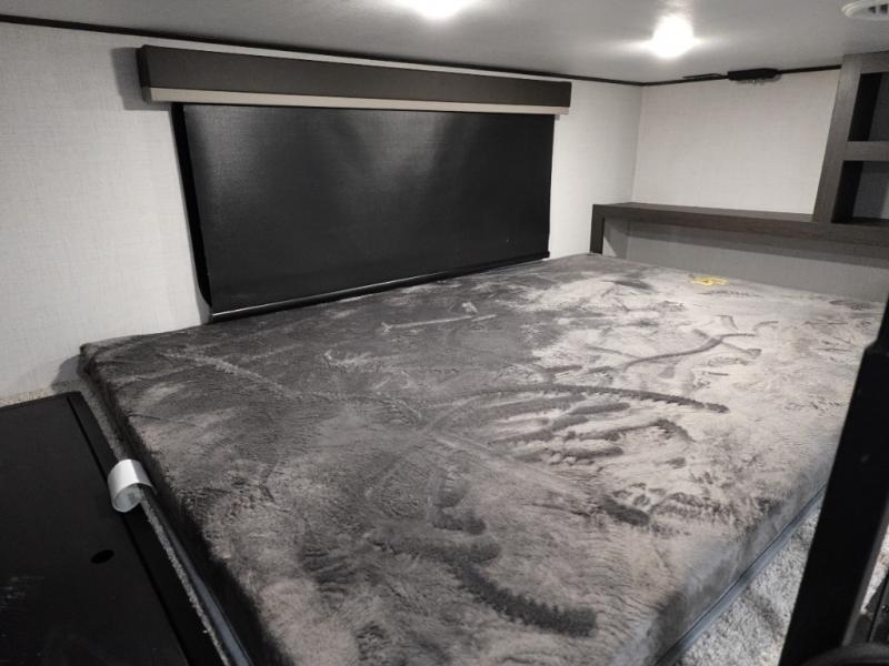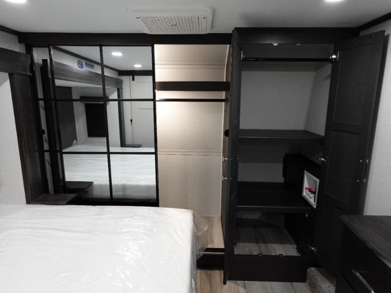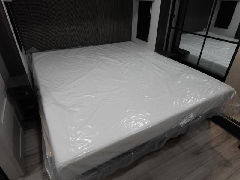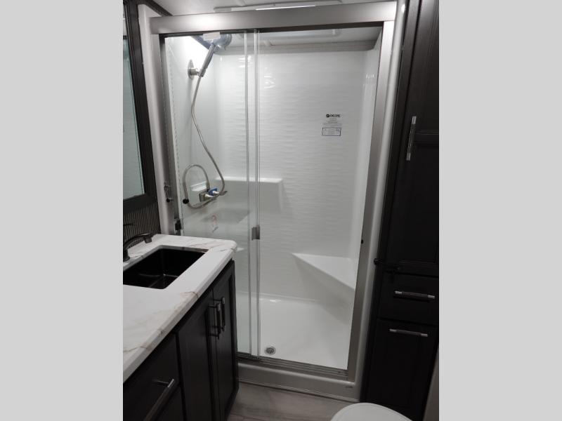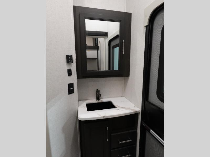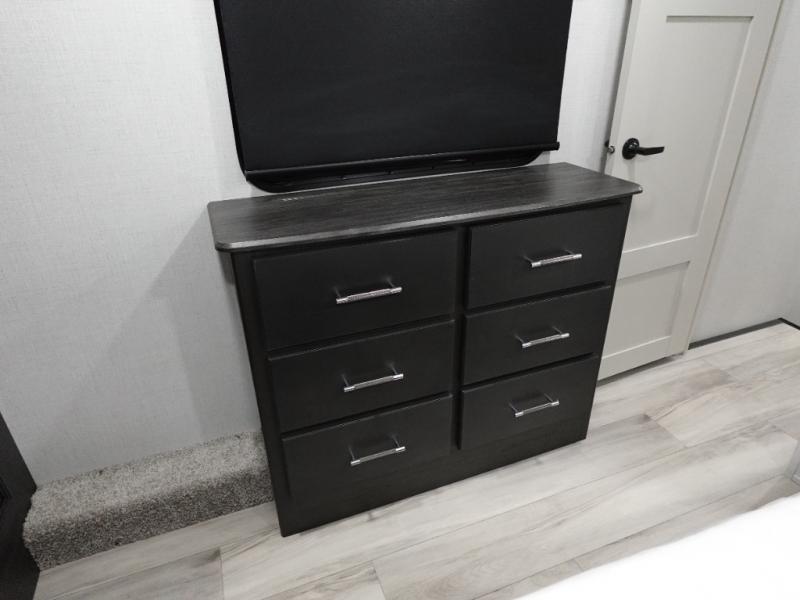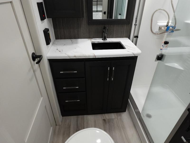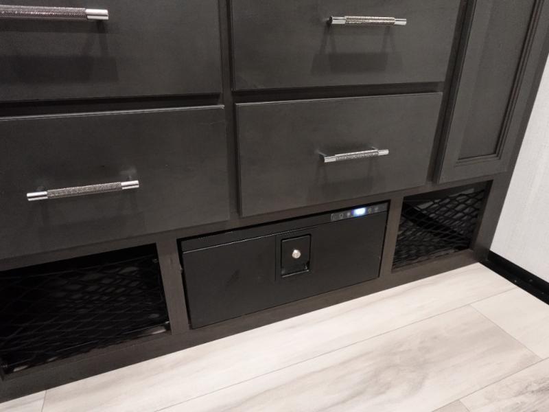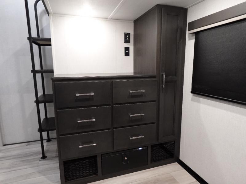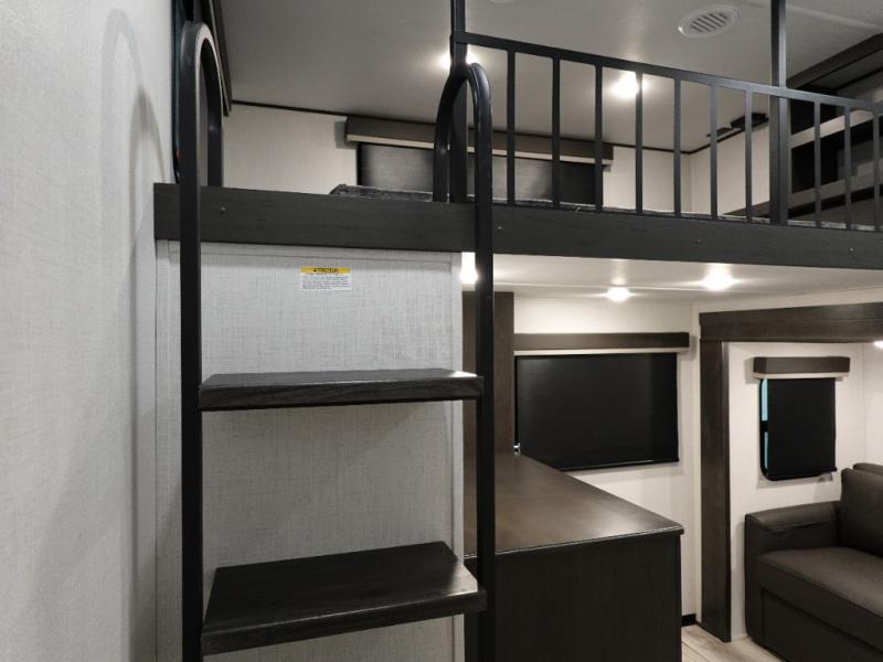 Are you looking for a spacious fifth wheel with space for you and your guests? Look no further than this four slide out unit with dual entry doors, a front master bedroom, and a rear bedroom/den with a loft! There is also a half bath here and a hide-a-bed sofa with storage underneath. You'll find the second hide-a-bed sofa in the living room, along with theater seating, a feature wall with a 50" TV, and a free-standing dinette with chairs where you can dine together. Furrion appliances in the kitchen let you create yummy meals each day, and there is a pantry and residential refrigerator to keep food stocked. Head to the front master bedroom where you can relax on the king bed slide out, store your clothes in the master closet, and easily use the dual entry bath. There is even stackable washer and dryer prep if you want the option to make laundry day easier!