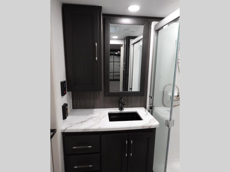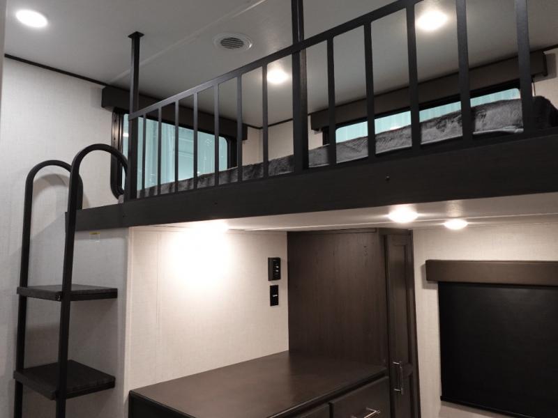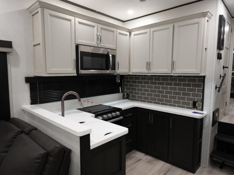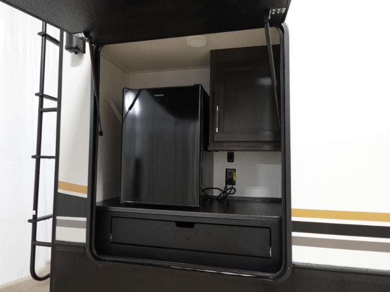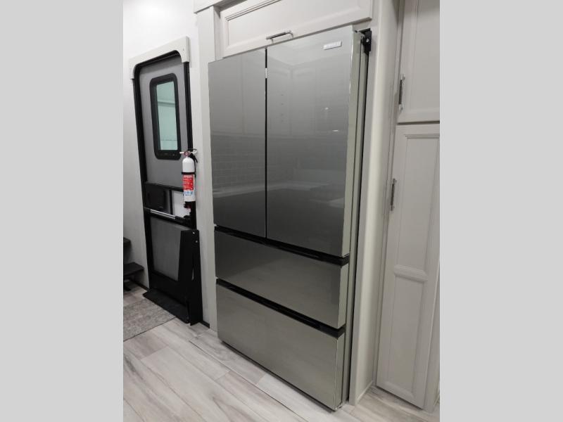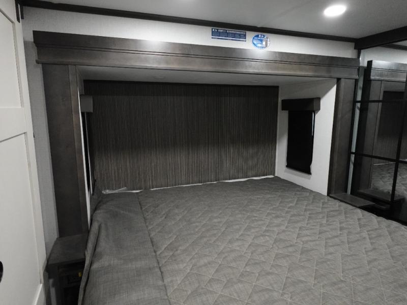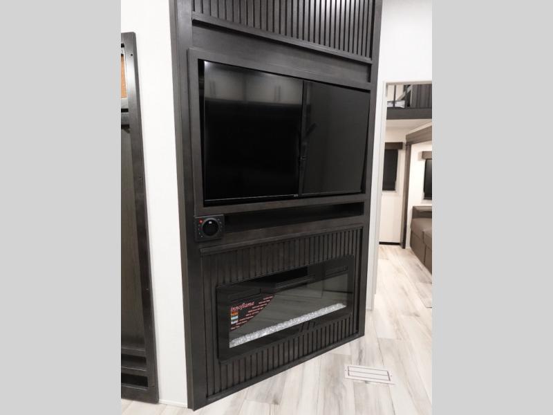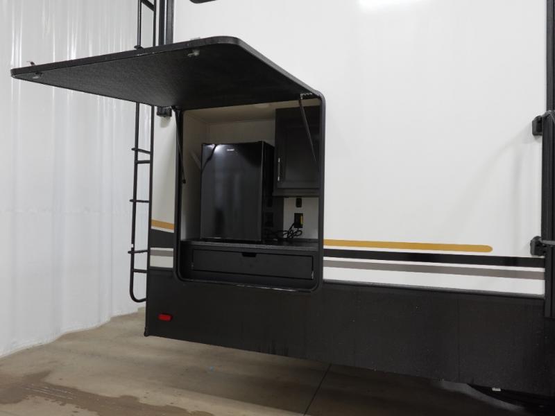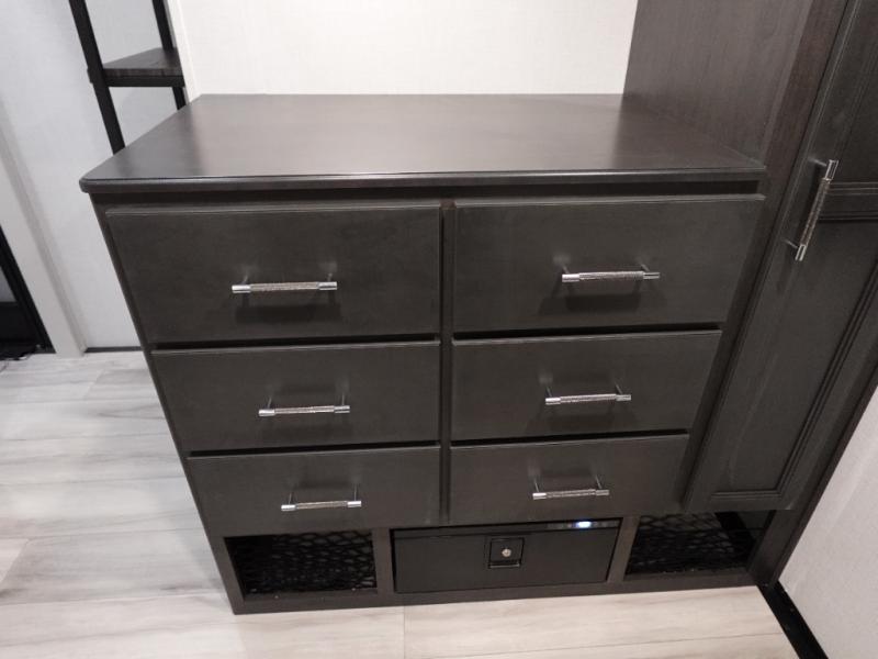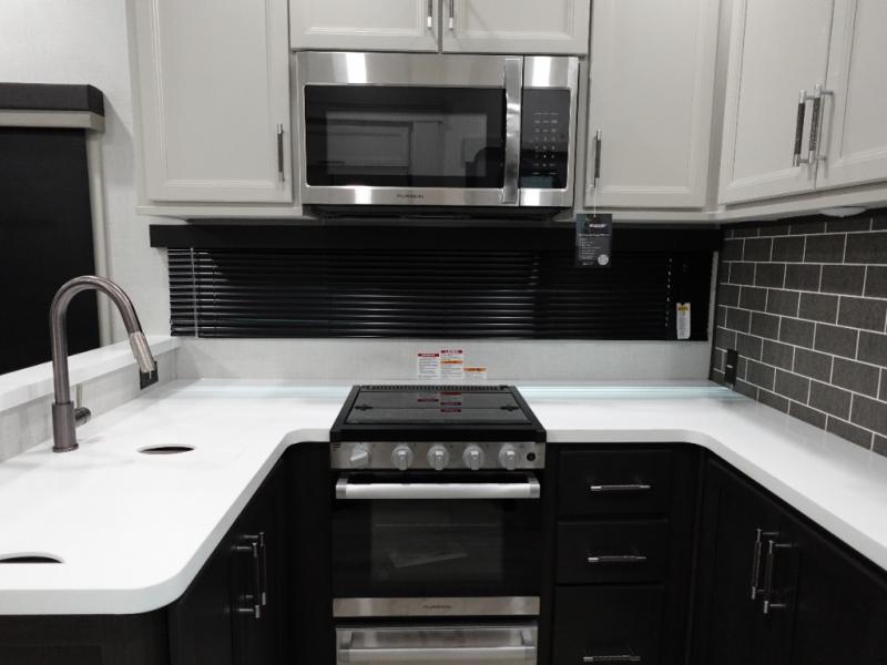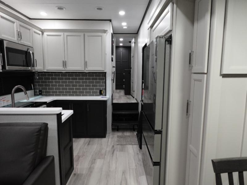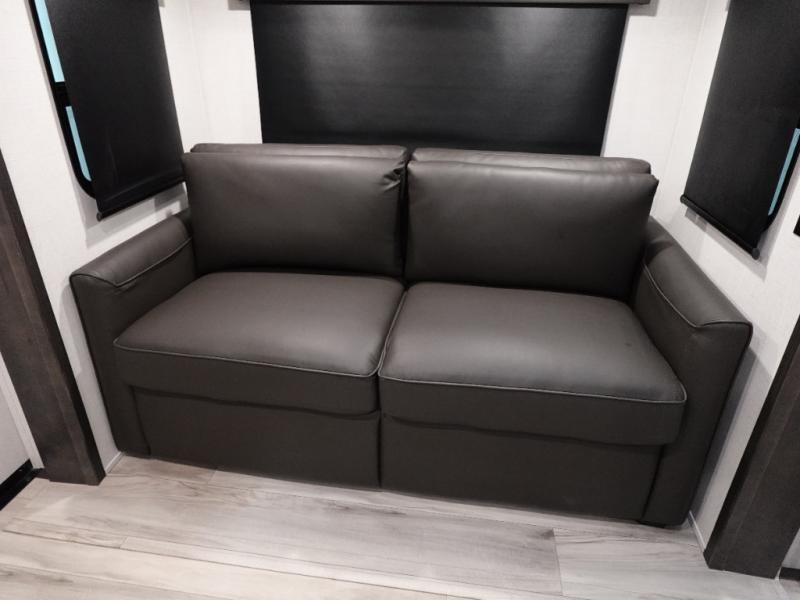 Are you looking for a spacious fifth wheel with space for you and your guests? Look no further than this four slide out unit with dual entry doors, a front master bedroom, and a rear bedroom/den with a loft! There is also a half bath here and a hide-a-bed sofa with storage underneath. You'll find the second hide-a-bed sofa in the living room, along with theater seating, a feature wall with a 50" TV, and a free-standing dinette with chairs where you can dine together. Furrion appliances in the kitchen let you create yummy meals each day, and there is a pantry and residential refrigerator to keep food stocked. Head to the front master bedroom where you can relax on the king bed slide out, store your clothes in the master closet, and easily use the dual entry bath.