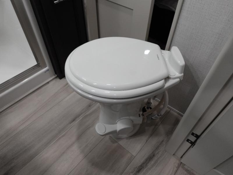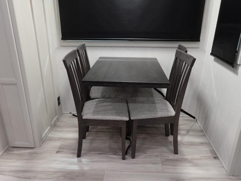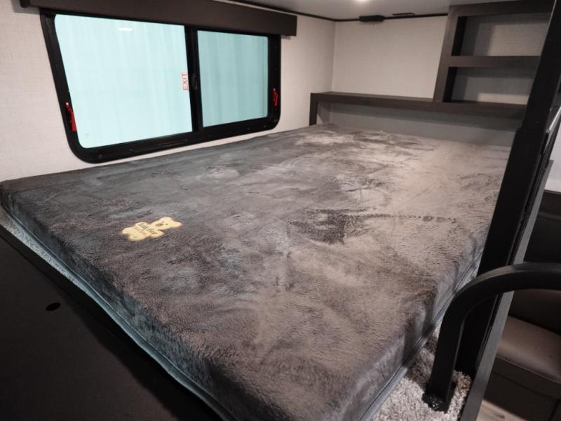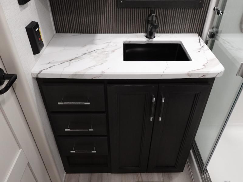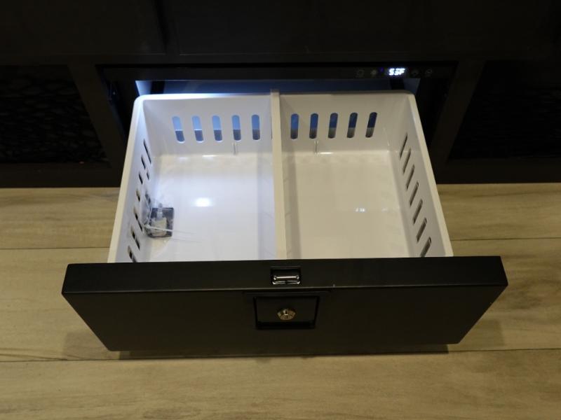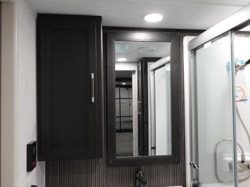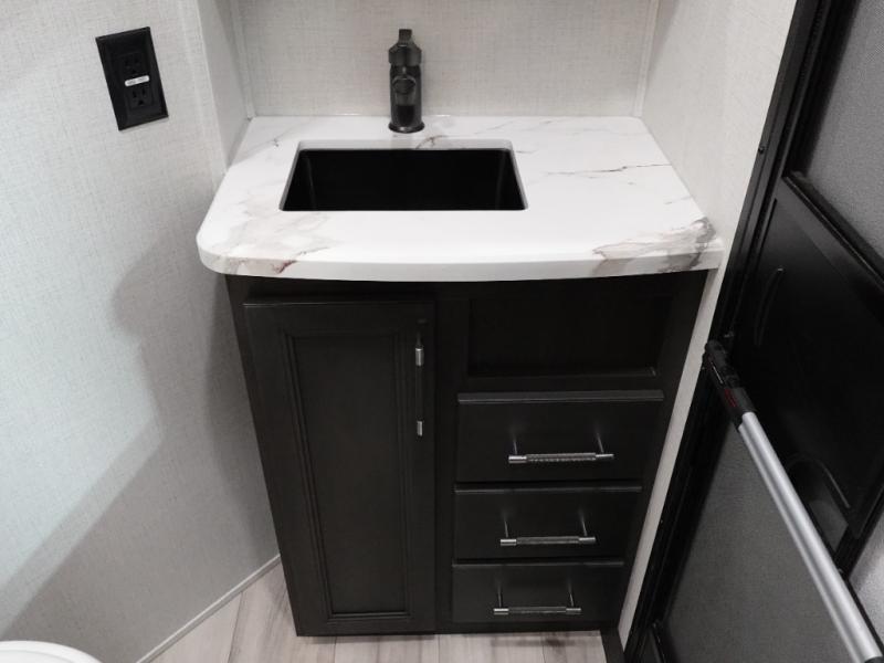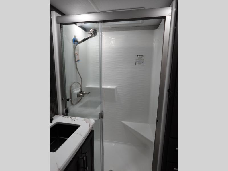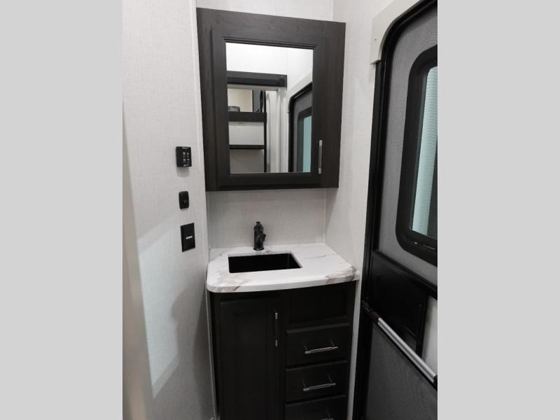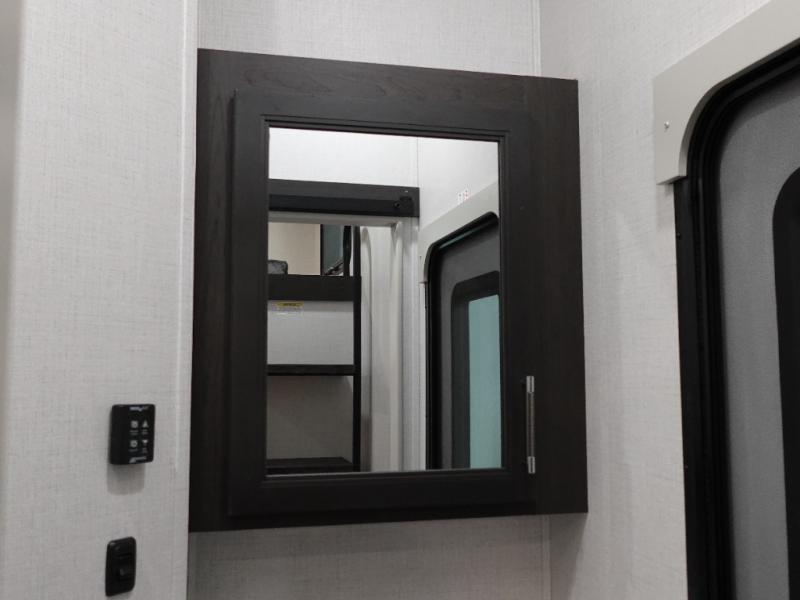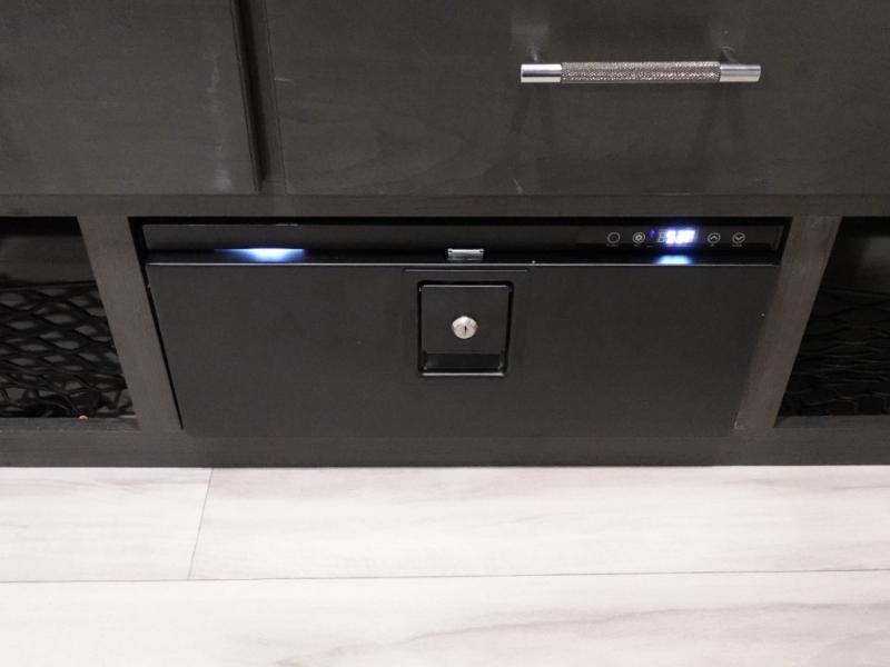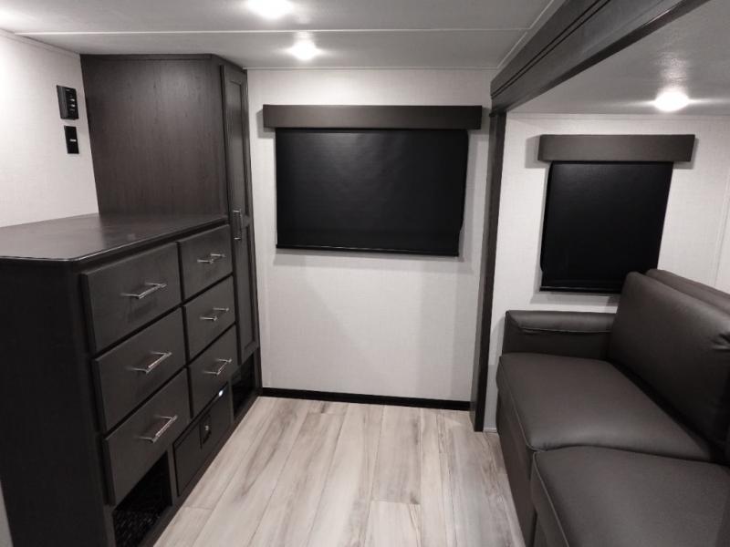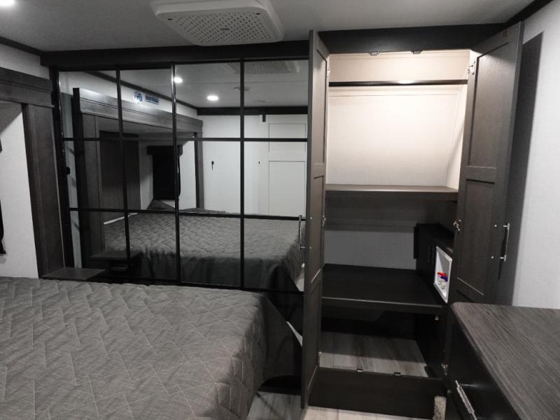 Are you looking for a spacious fifth wheel with space for you and your guests? Look no further than this four slide out unit with dual entry doors, a front master bedroom, and a rear bedroom/den with a loft! There is also a half bath here and a hide-a-bed sofa with storage underneath. You'll find the second hide-a-bed sofa in the living room, along with theater seating, a feature wall with a 50" TV, and a free-standing dinette with chairs where you can dine together. Furrion appliances in the kitchen let you create yummy meals each day, and there is a pantry and residential refrigerator to keep food stocked. Head to the front master bedroom where you can relax on the king bed slide out, store your clothes in the master closet, and easily use the dual entry bath.