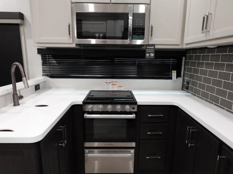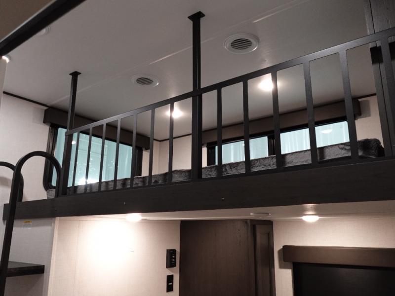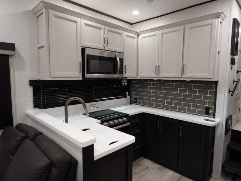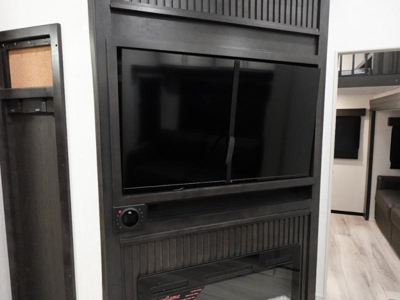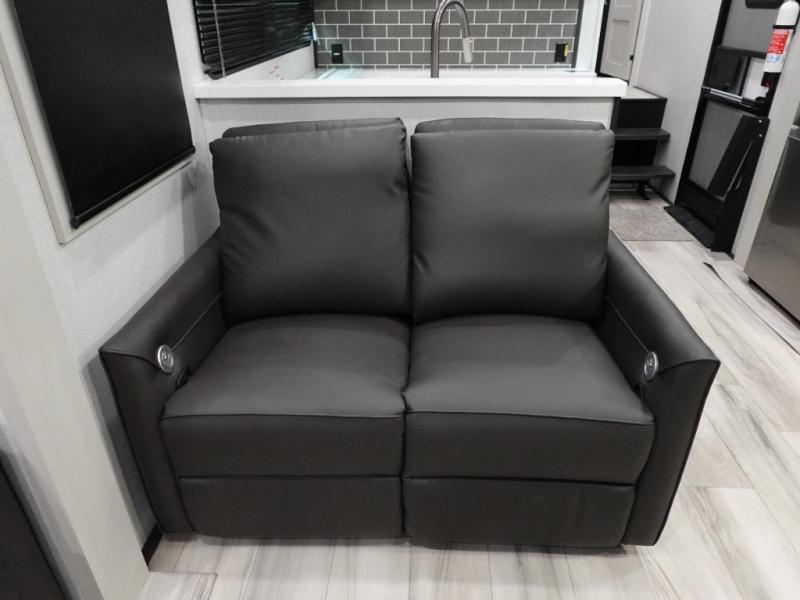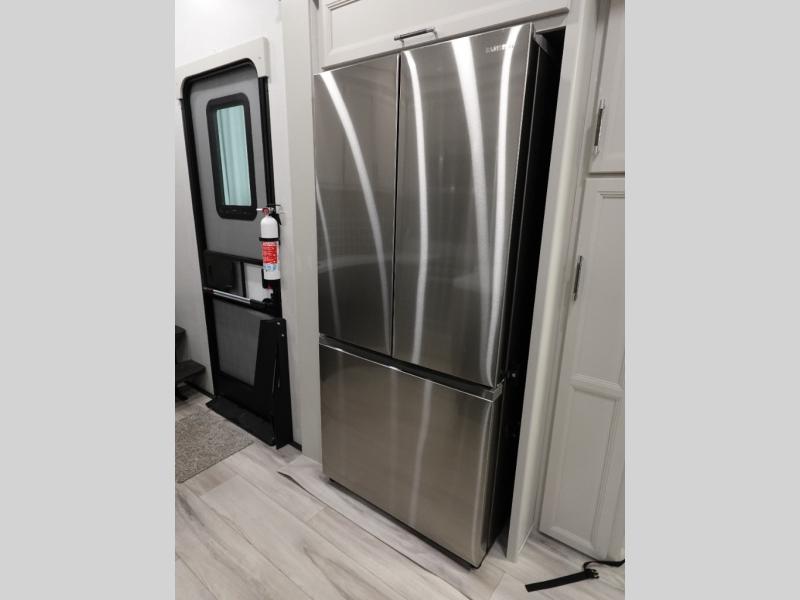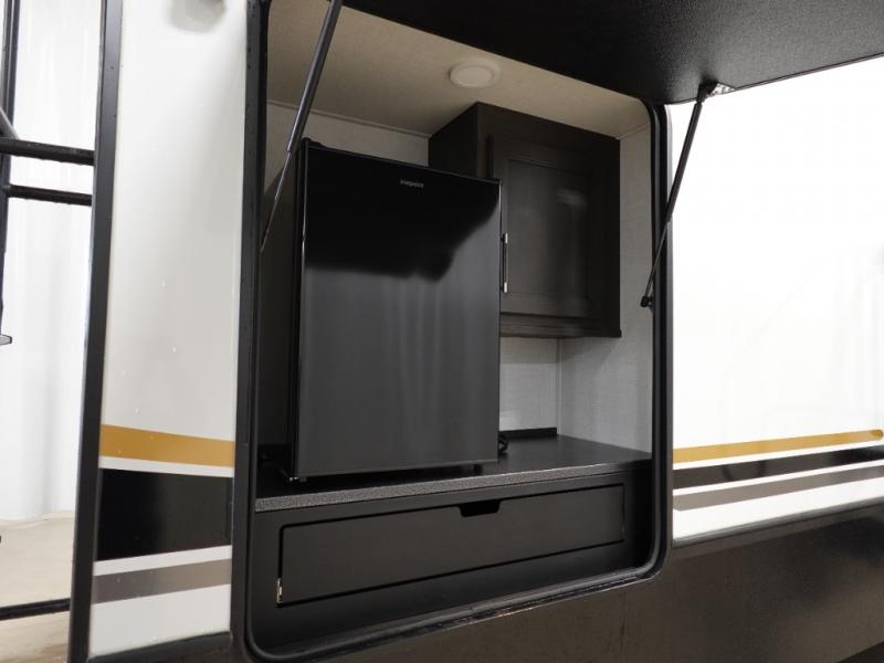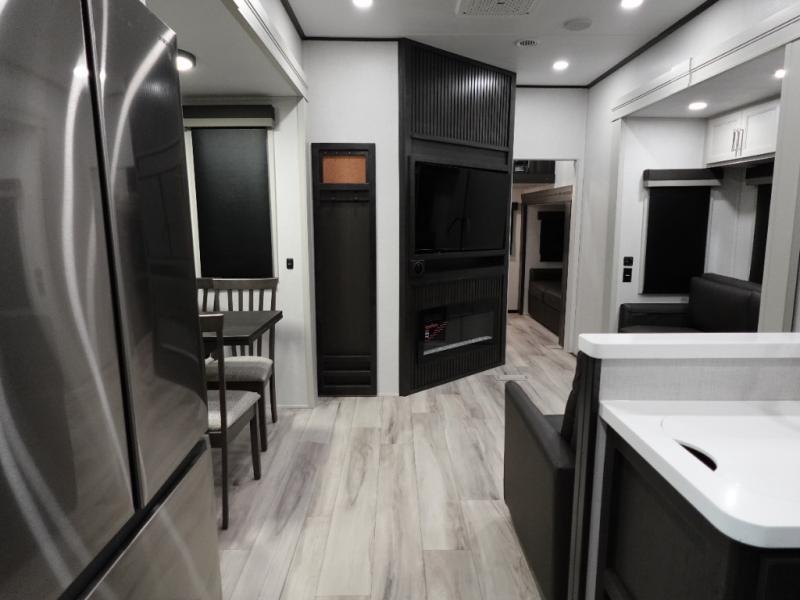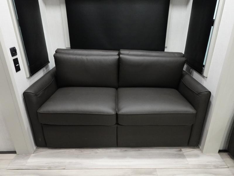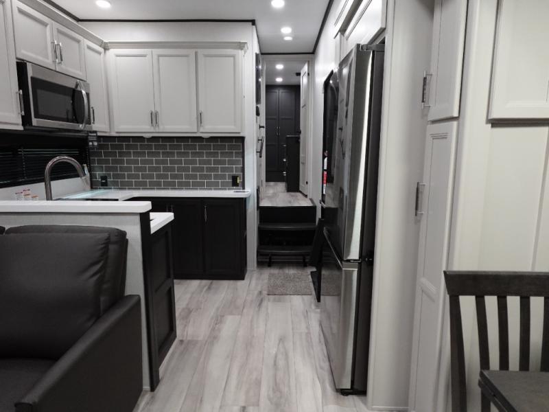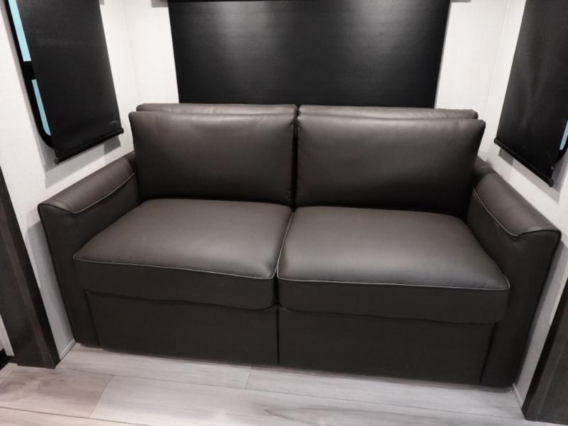 Are you looking for a spacious fifth wheel with space for you and your guests? Look no further than this four slide out unit with dual entry doors, a front master bedroom, and a rear bedroom/den with a loft! There is also a half bath here and a hide-a-bed sofa with storage underneath. You'll find the second hide-a-bed sofa in the living room, along with theater seating, a feature wall with a 50" TV, and a free-standing dinette with chairs where you can dine together. Furrion appliances in the kitchen let you create yummy meals each day, and there is a pantry and residential refrigerator to keep food stocked. Head to the front master bedroom where you can relax on the king bed slide out, store your clothes in the master closet, and easily use the dual entry bath. There is even stackable washer and dryer prep if you want the option to make laundry day easier!