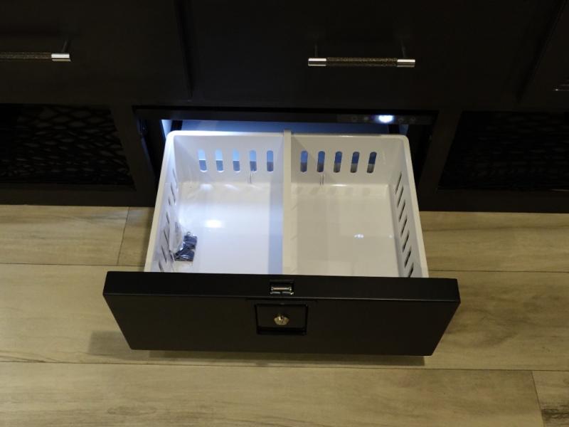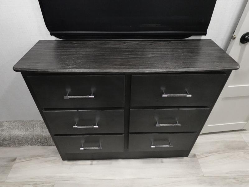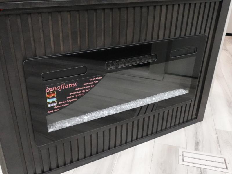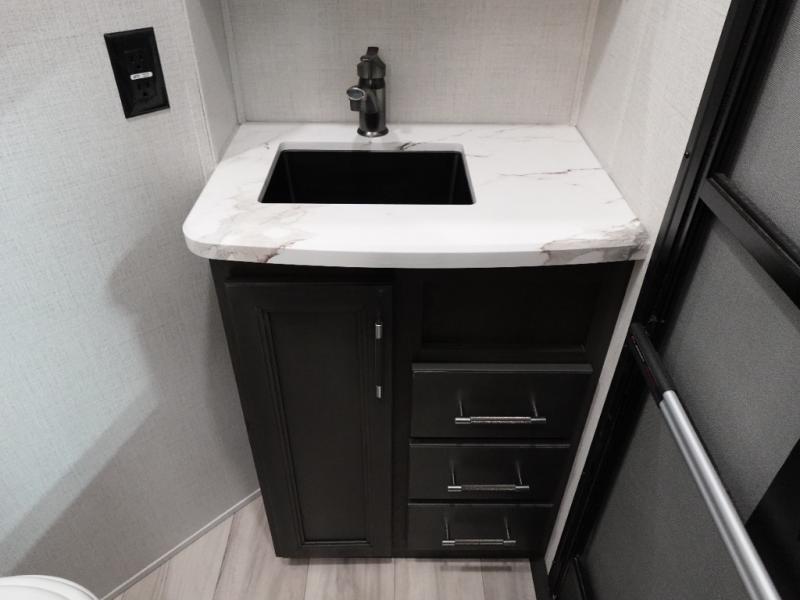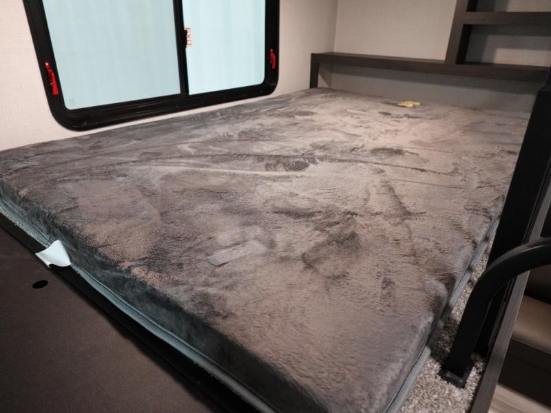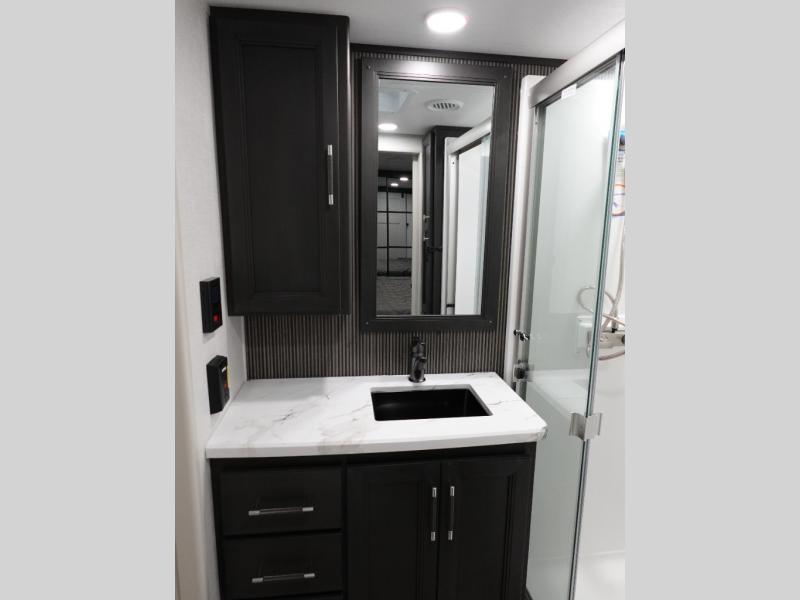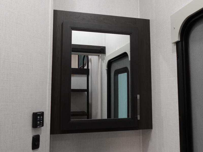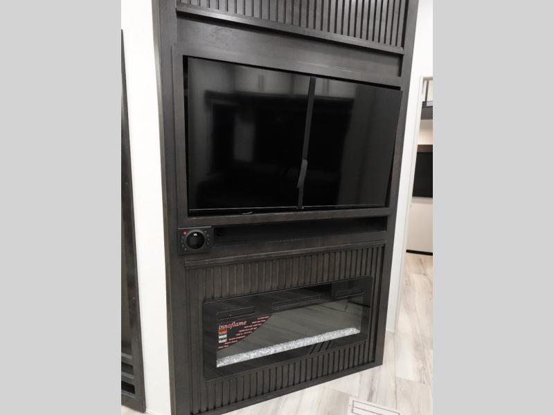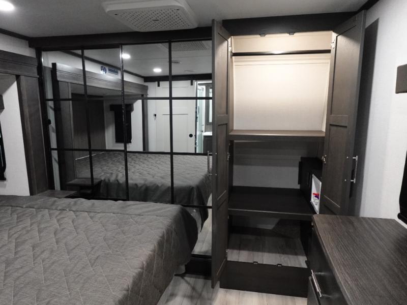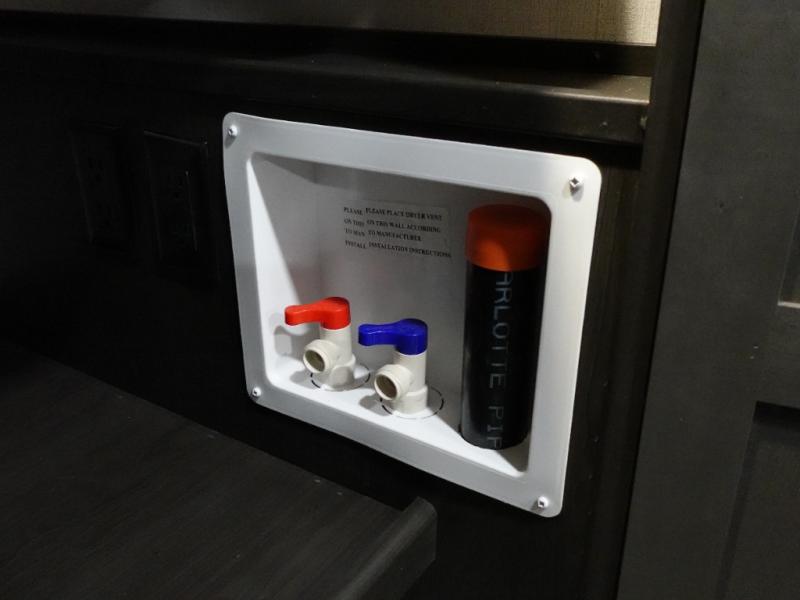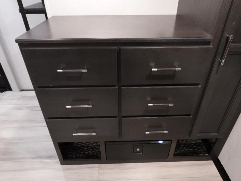 Are you looking for a spacious fifth wheel with space for you and your guests? Look no further than this four slide out unit with dual entry doors, a front master bedroom, and a rear bedroom/den with a loft! There is also a half bath here and a hide-a-bed sofa with storage underneath. You'll find the second hide-a-bed sofa in the living room, along with theater seating, a feature wall with a 50" TV, and a free-standing dinette with chairs where you can dine together. Furrion appliances in the kitchen let you create yummy meals each day, and there is a pantry and residential refrigerator to keep food stocked. Head to the front master bedroom where you can relax on the king bed slide out, store your clothes in the master closet, and easily use the dual entry bath. There is even stackable washer and dryer prep if you want the option to make laundry day easier!