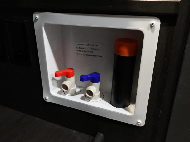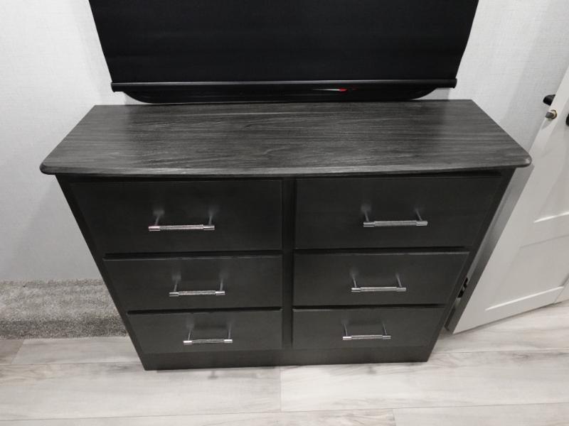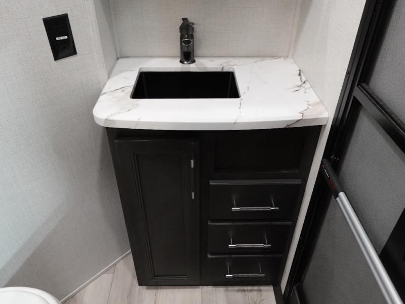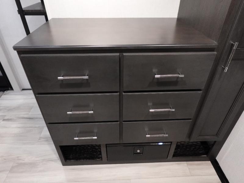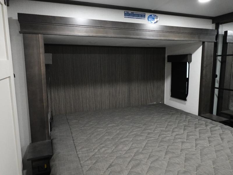 Are you looking for a spacious fifth wheel with space for you and your guests? Look no further than this four slide out unit with dual entry doors, a front master bedroom, and a rear bedroom/den with a loft! There is also a half bath here and a hide-a-bed sofa with storage underneath. You'll find the second hide-a-bed sofa in the living room, along with theater seating, a feature wall with a 50" TV, and a free-standing dinette with chairs where you can dine together. Furrion appliances in the kitchen let you create yummy meals each day, and there is a pantry and residential refrigerator to keep food stocked. Head to the front master bedroom where you can relax on the king bed slide out, store your clothes in the master closet, and easily use the dual entry bath. There is even stackable washer and dryer prep if you want the option to make laundry day easier!