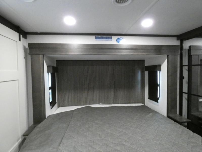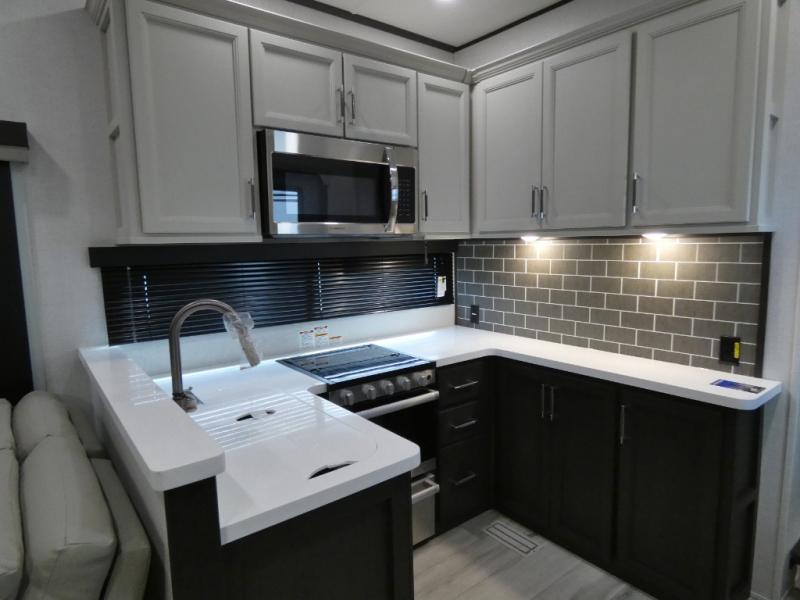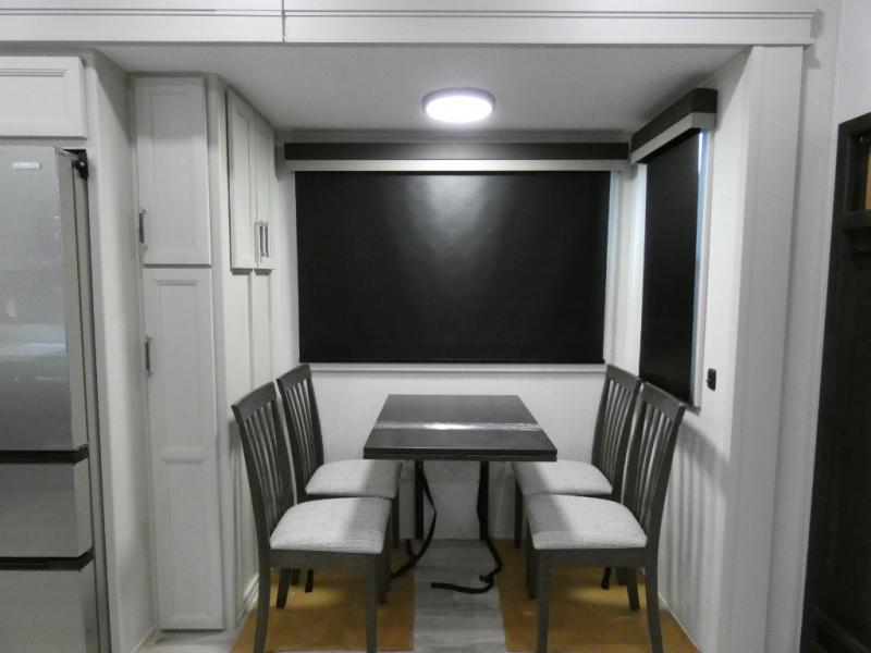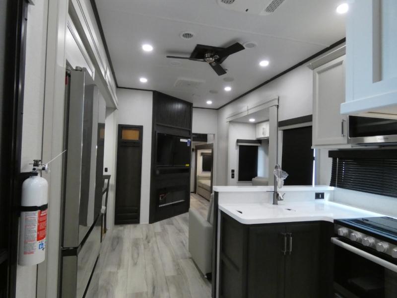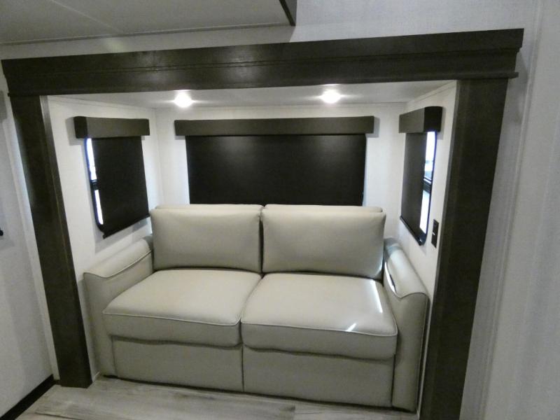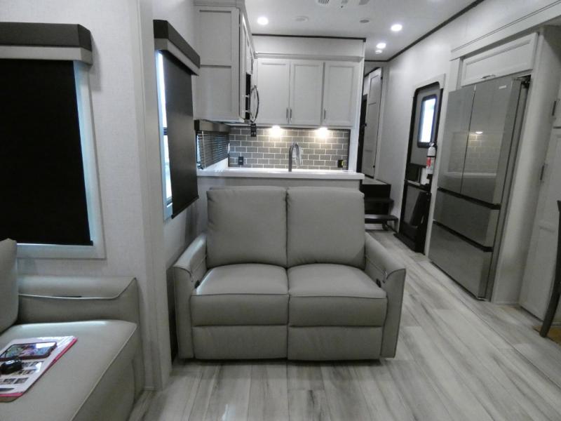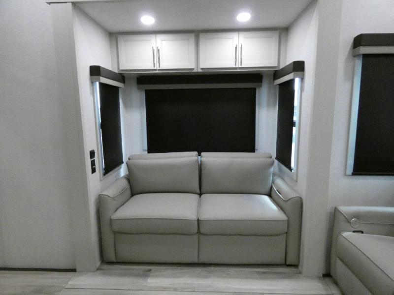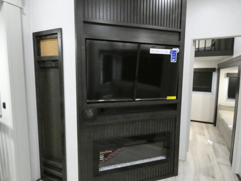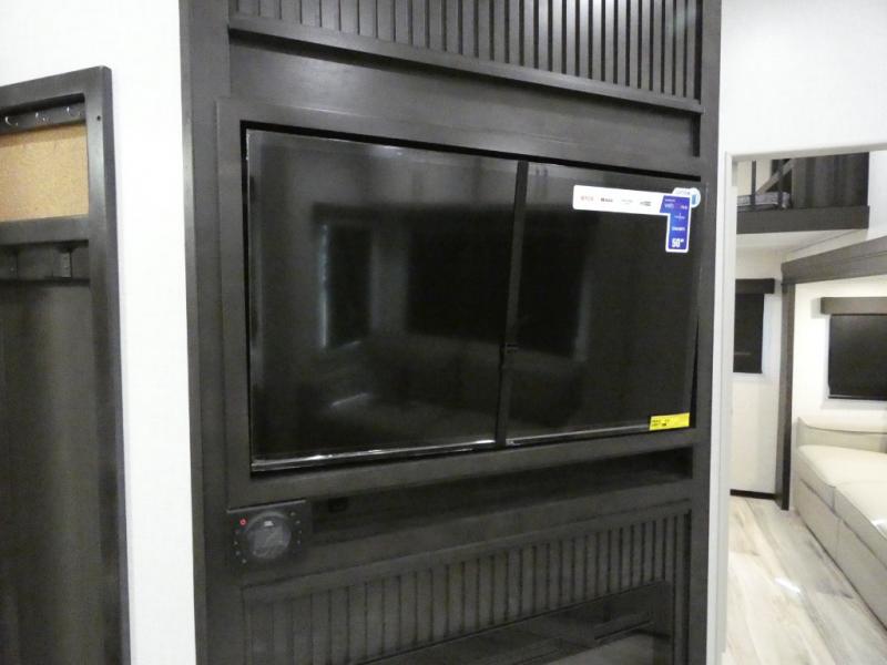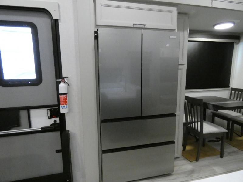 Are you looking for a spacious fifth wheel with space for you and your guests? Look no further than this four slide out unit with dual entry doors, a front master bedroom, and a rear bedroom/den with a loft! There is also a half bath here and a hide-a-bed sofa with storage underneath. You'll find the second hide-a-bed sofa in the living room, along with theater seating, a feature wall with a 50" TV, and a free-standing dinette with chairs where you can dine together. Furrion appliances in the kitchen let you create yummy meals each day, and there is a pantry and residential refrigerator to keep food stocked. Head to the front master bedroom where you can relax on the king bed slide out, store your clothes in the master closet, and easily use the dual entry bath. There is even stackable washer and dryer prep if you want the option to make laundry day easier!