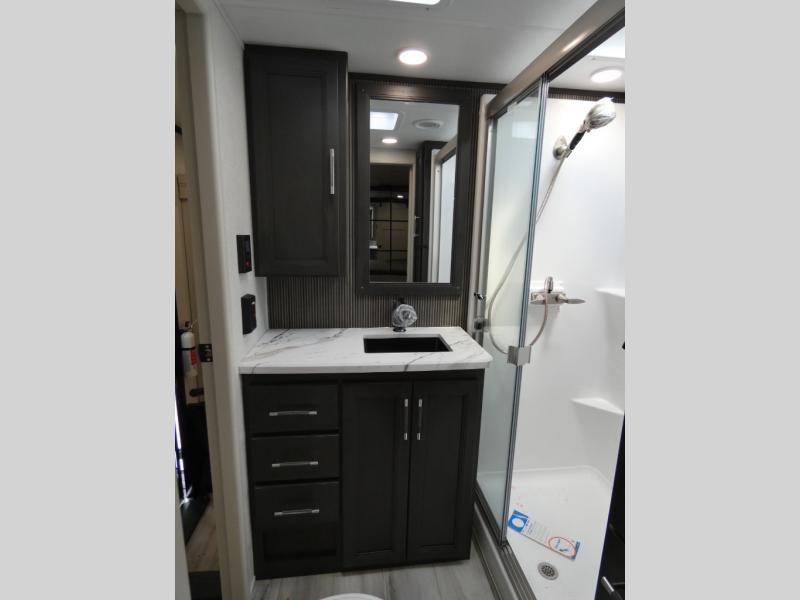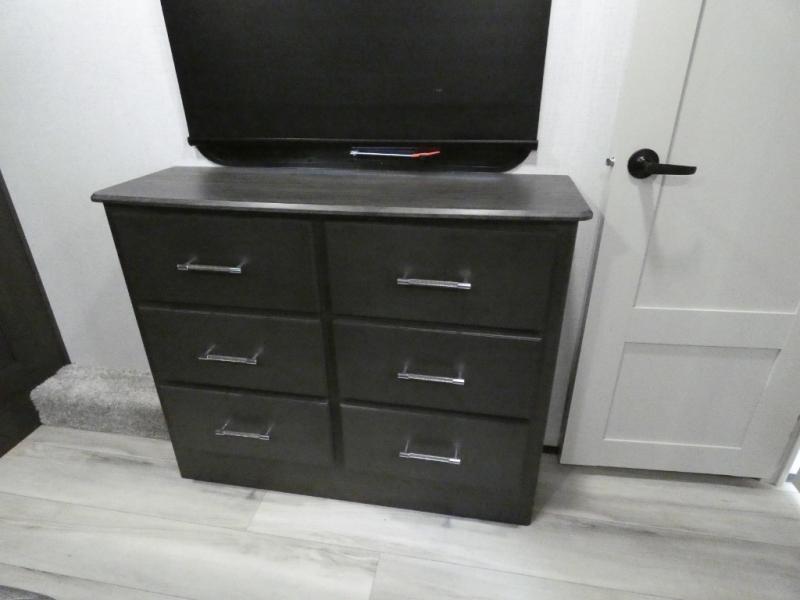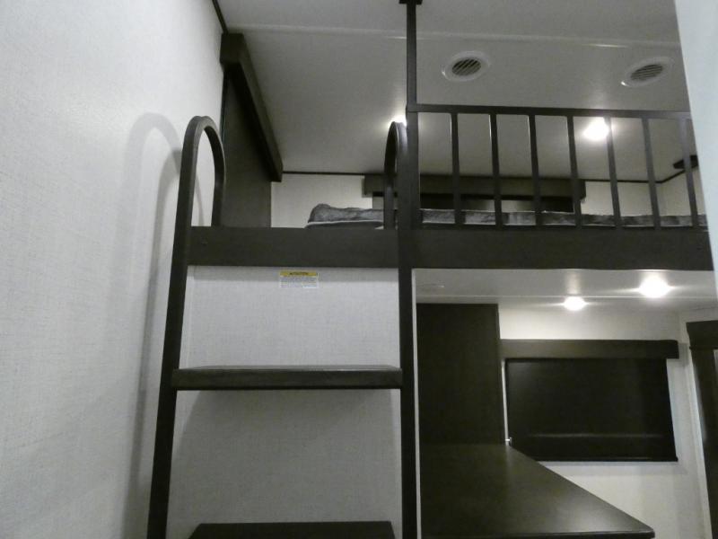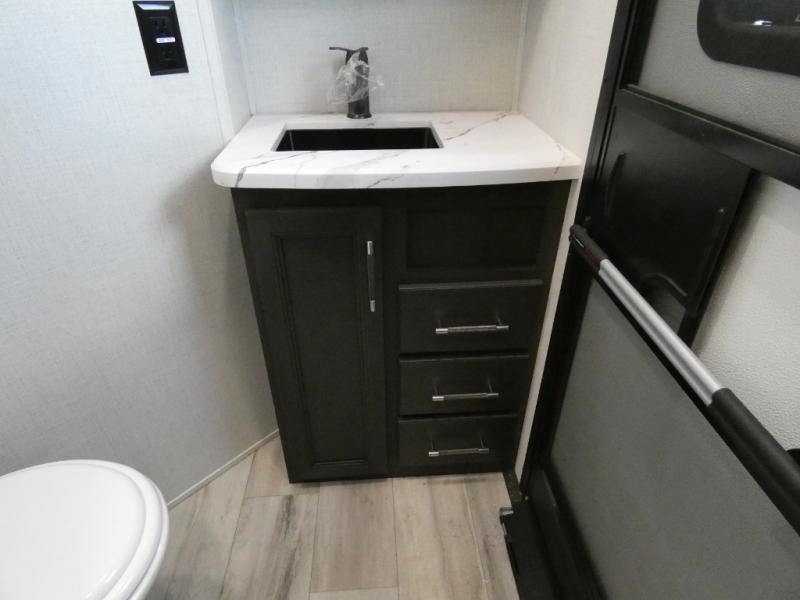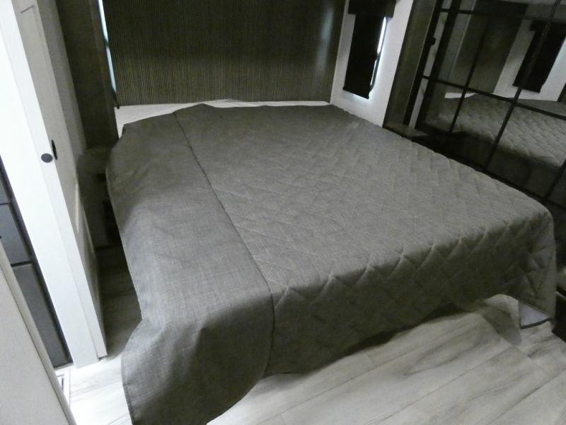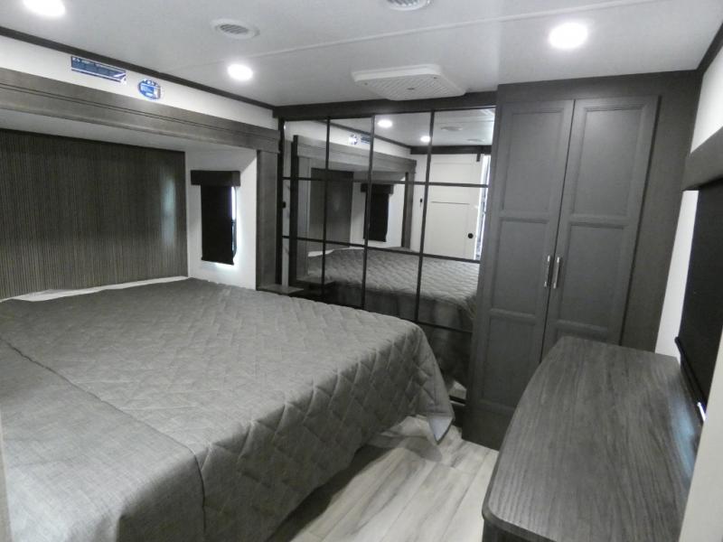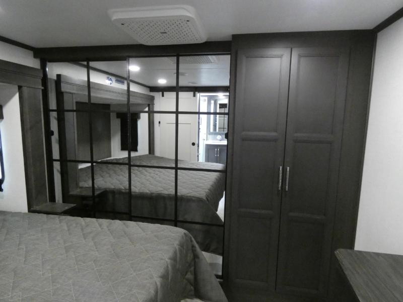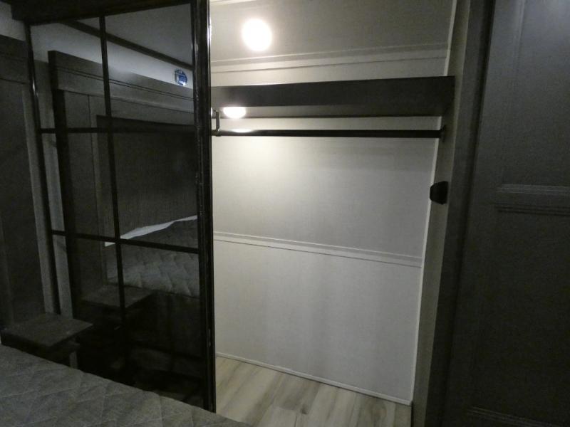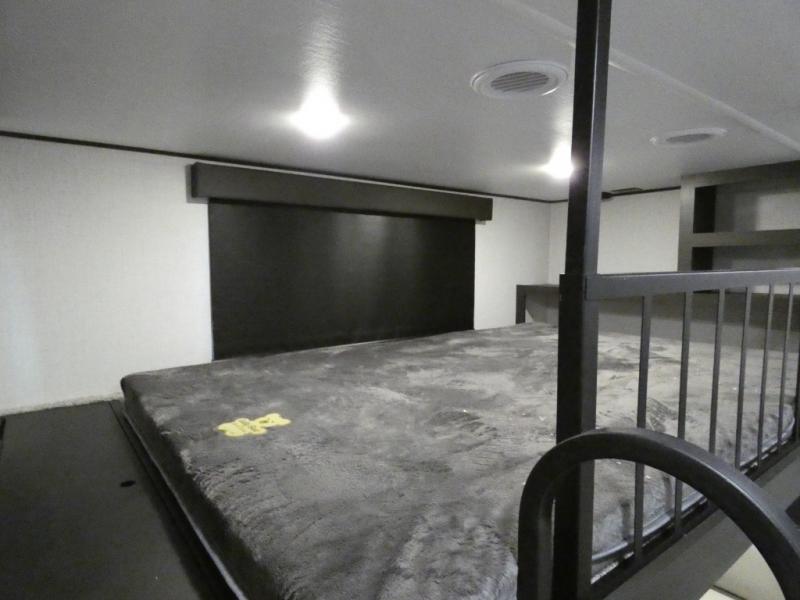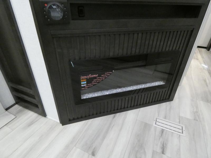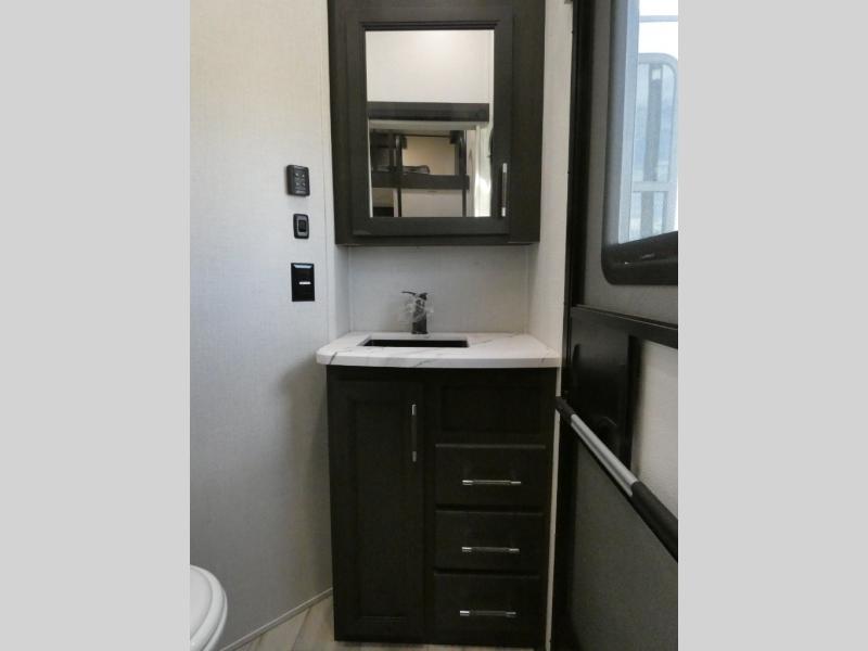Are you looking for a spacious fifth wheel with space for you and your guests? Look no further than this four slide out unit with dual entry doors, a front master bedroom, and a rear bedroom/den with a loft! There is also a half bath here and a hide-a-bed sofa with storage underneath. You'll find the second hide-a-bed sofa in the living room, along with theater seating, a feature wall with a 50" TV, and a free-standing dinette with chairs where you can dine together. Furrion appliances in the kitchen let you create yummy meals each day, and there is a pantry and residential refrigerator to keep food stocked. Head to the front master bedroom where you can relax on the king bed slide out, store your clothes in the master closet, and easily use the dual entry bath. There is even stackable washer and dryer prep if you want the option to make laundry day easier!