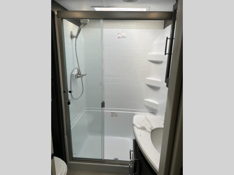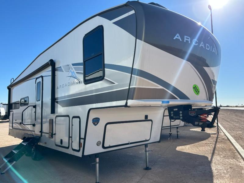 With any Arcadia Super Lite fifth wheel by Keystone, you will enjoy easy-to-tow lengths, unmatched storage, and oversized windows to let the outdoor views in. The structural I-beam frame will provide a strong foundation to your RV, and the Curt Performance Package means you can enjoy hassle-free towing. You will be able to camp year around thanks to the Peak Weather Package that includes a heated and enclosed underbelly, a 35K BTU furnace, and Keystone's exclusive HyperDeck floor that adds an additional layer of insulation to your floor. The interior will make you feel at home with residential hardware, seamless pressed countertops, black roller shades, and ample storage space. Sometimes the best things come in smaller packages; choose a Arcadia Super Lite today!