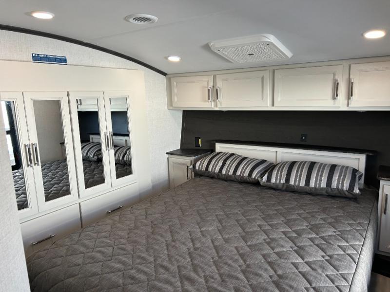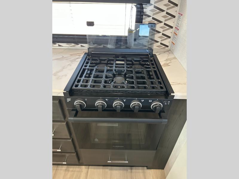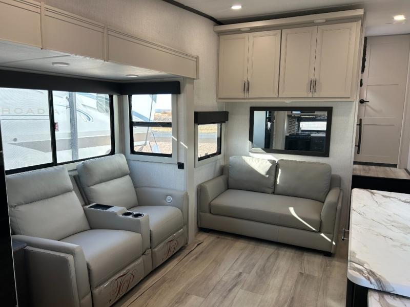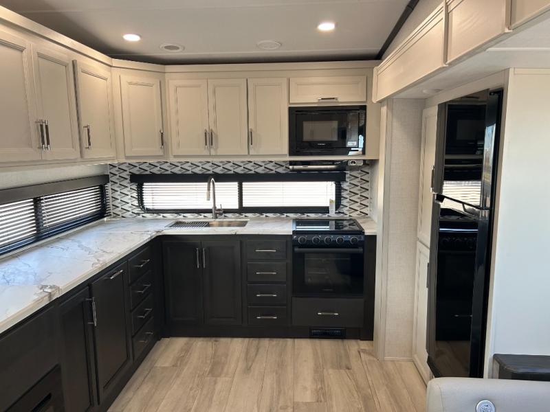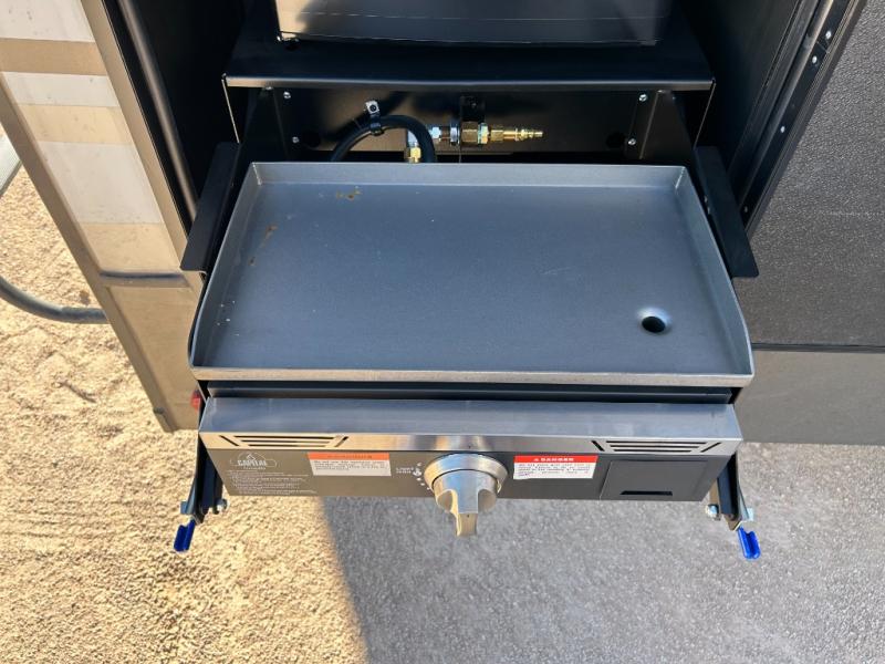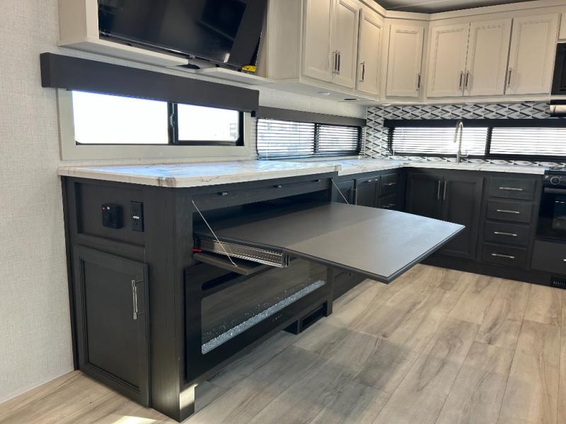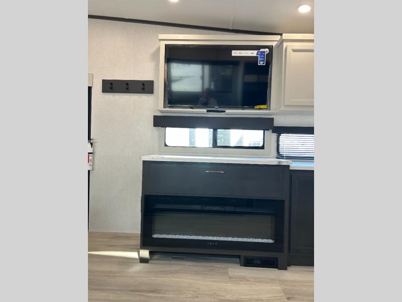 You're sure to love every minute spent in this rear kitchen fifth wheel! There is generous counter space to prep your best meals plus a pull-out dinette table where you can dine together. Additional seating space can be found on the theater seating and hide-a-bed sofa slide out. There is even a fireplace to make this space more cozy. If you enjoy spending time outdoors, there is a Grill-N-Chill outdoor kitchen, 19' power awning, and LCI solid steps. When it's time to call it a night, the queen bed in the private bedroom is sure to be calling your name!