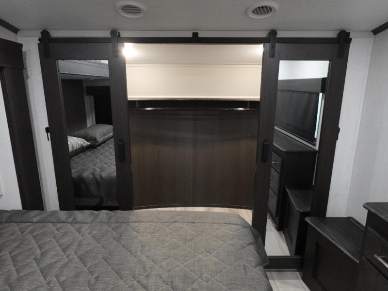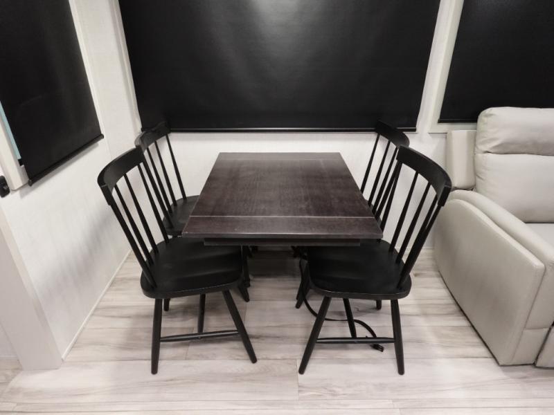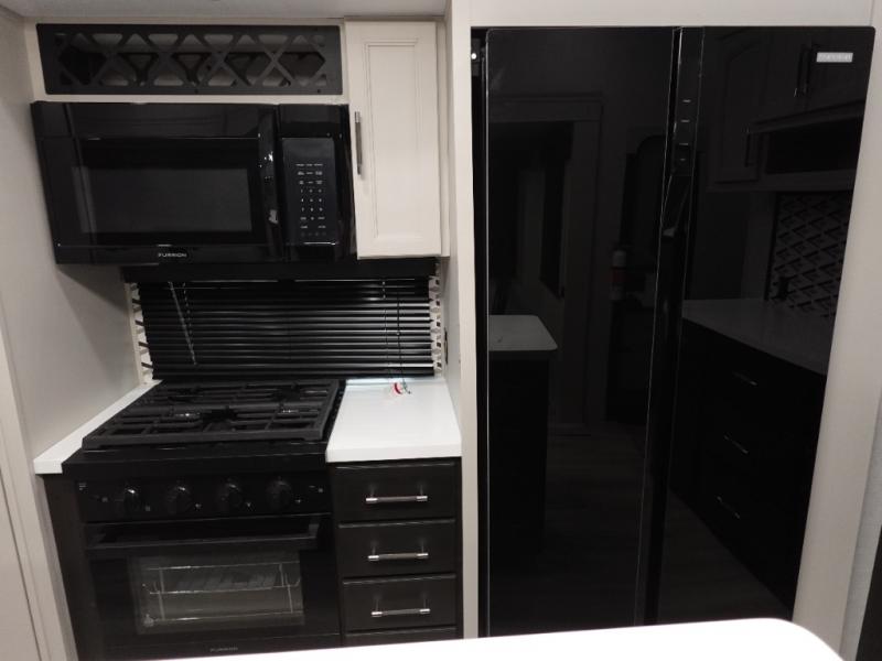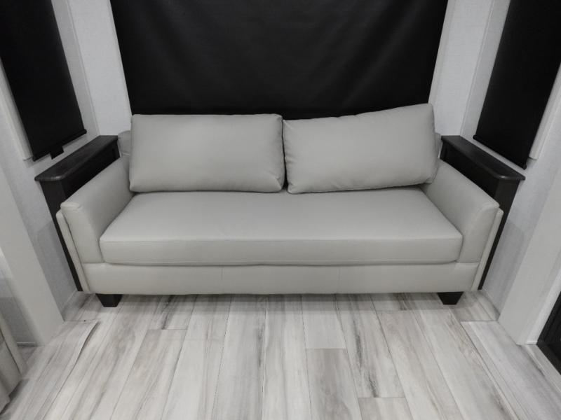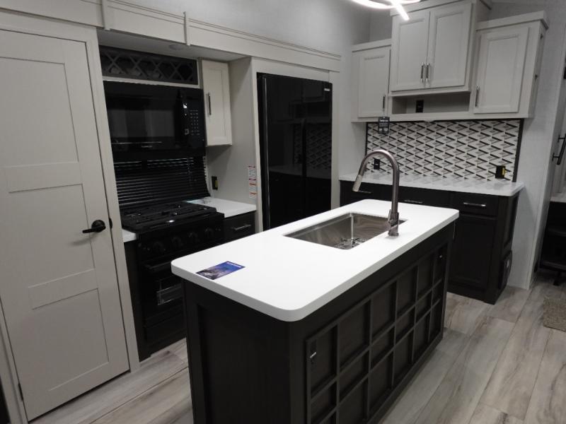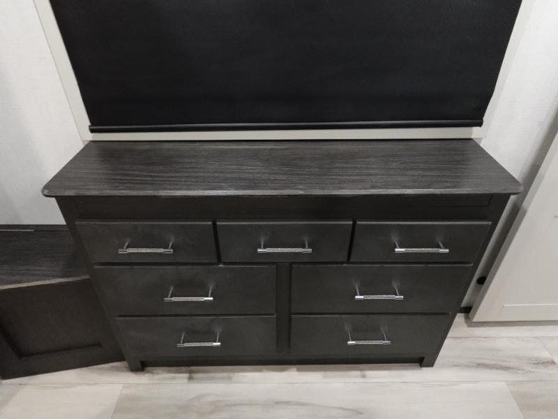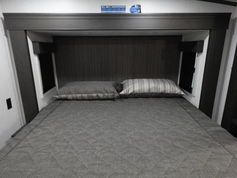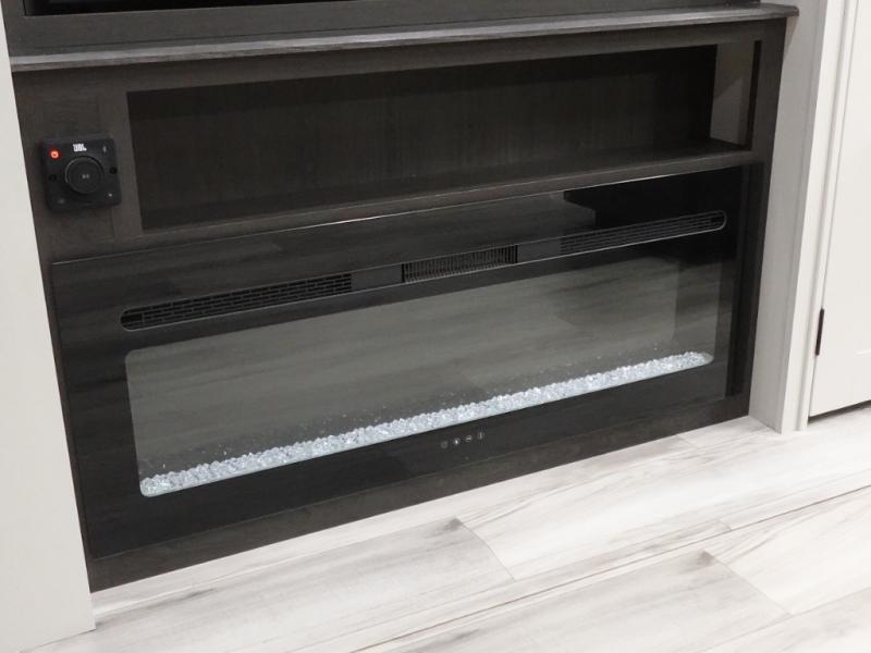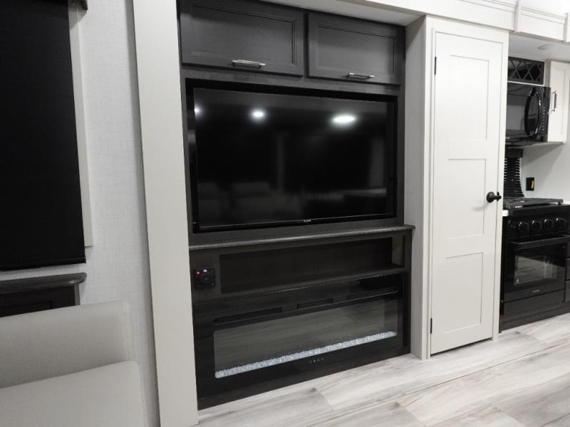 You will feel right at home in this fifth wheel! The chef will love the kitchen island with a butcher block sink cover for extra meal prepping space, and the 16 cu. ft. "Solar Friendly" refrigerator with dent resistant doors is big enough to bring all of your favorite foods to cook. There is a front private bedroom with a king bed slide for a comfortable nights rest and across from it is a dresser with hidden storage and a bench seat, plus you have a front closet with washer and dryer prep if you choose to add those appliances. Freshen up in the full bathroom with the 48" x 30" shower then head to the rear living area to relax on either the XL sofa sleeper or theater seating while you enjoy your morning coffee in front of the fireplace and watch the morning news on the 50" TV.