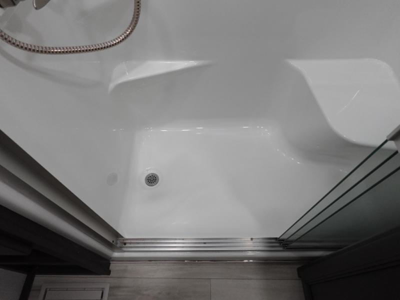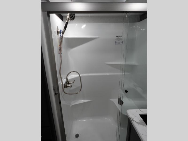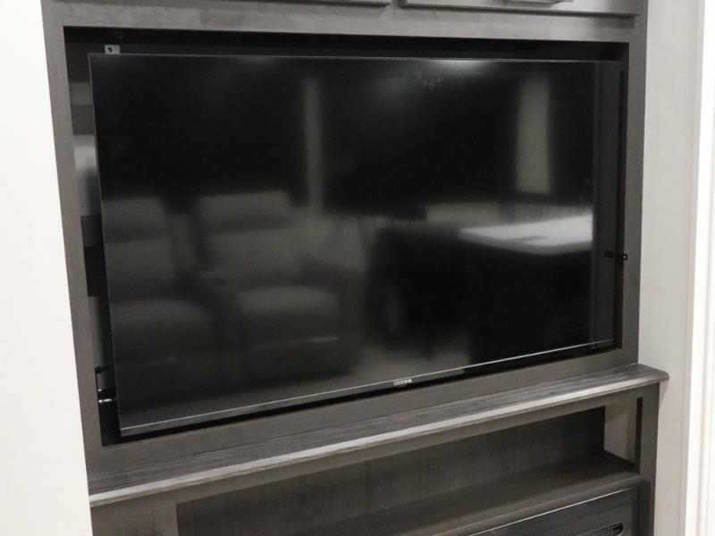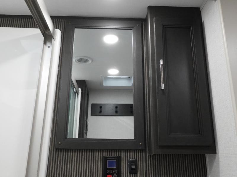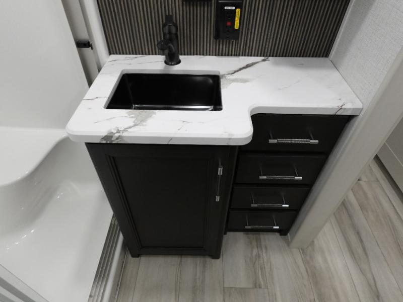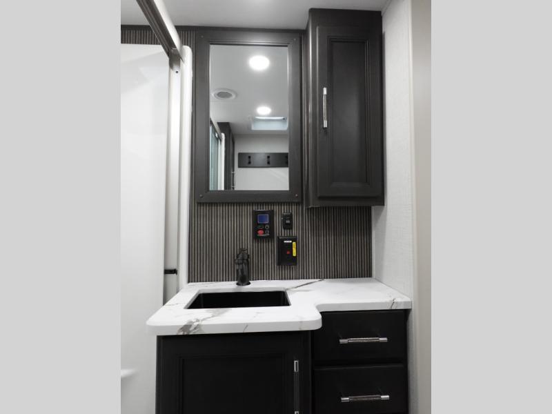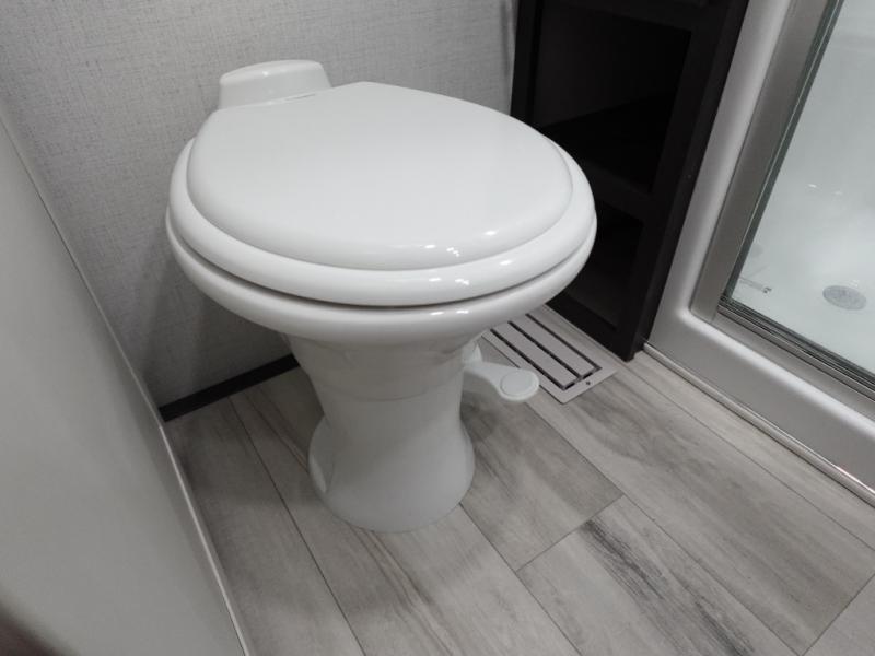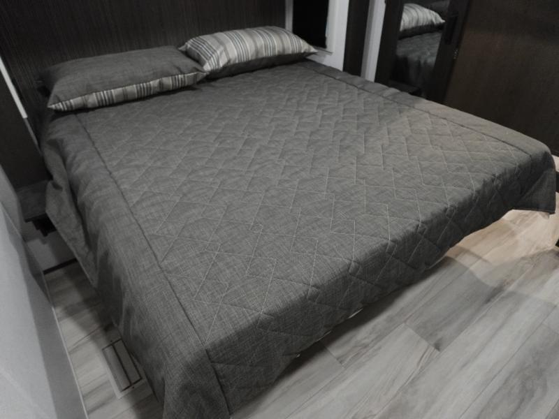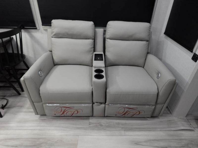 You will feel right at home in this fifth wheel! The chef will love the kitchen island with a butcher block sink cover for extra meal prepping space, and the 16 cu. ft. "Solar Friendly" refrigerator with dent resistant doors is big enough to bring all of your favorite foods to cook. There is a front private bedroom with a king bed slide for a comfortable nights rest and across from it is a dresser with hidden storage and a bench seat, plus you have a front closet with washer and dryer prep if you choose to add those appliances. Freshen up in the full bathroom with the 48" x 30" shower then head to the rear living area to relax on either the XL sofa sleeper or theater seating while you enjoy your morning coffee in front of the fireplace and watch the morning news on the 50" TV.