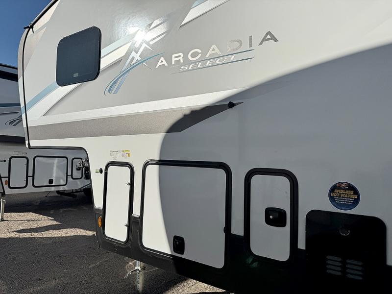 With any Arcadia Select fifth wheel by Keystone you will enjoy easy towability and at-home comforts at an affordable price! The laminated sidewalls with five sided aluminum superstructure will provide a strong foundation so you can enjoy your RV for years to come, plus a one-piece, heated and enclosed polypropylene underbelly means you can camp year around! And an upgraded Roto-Flex hitch pin with will make it easy to tow. Head inside to find tall slides for added space, seamless, pressed countertops, convenient underbed storage, and a large shower with a retractable door and skylight. These fifth wheels also include a Blade Pure A/C system, Girard on-demand tankless water heater, two 30 lb. LP tanks, and more utilities to make your camping experience run smoothly.