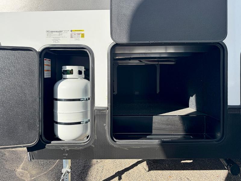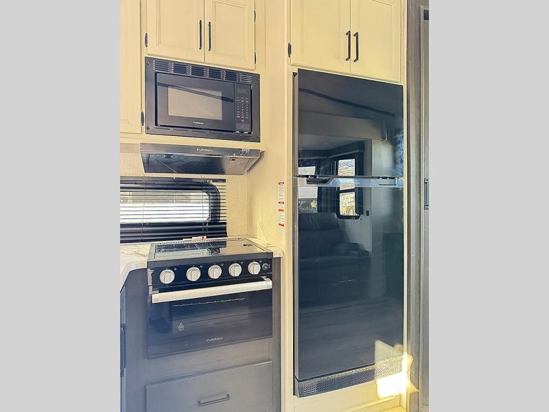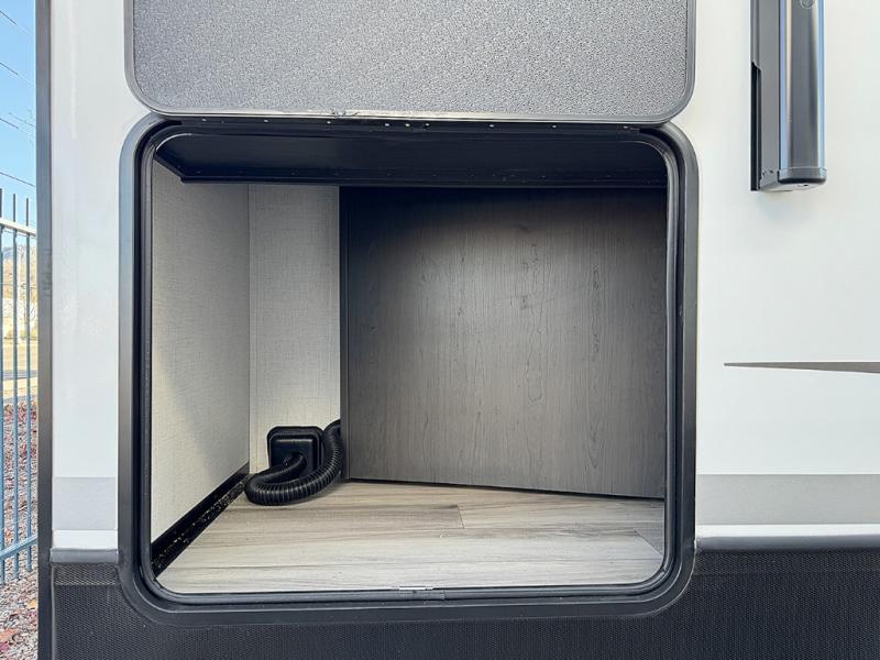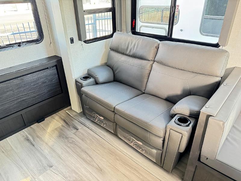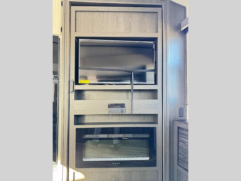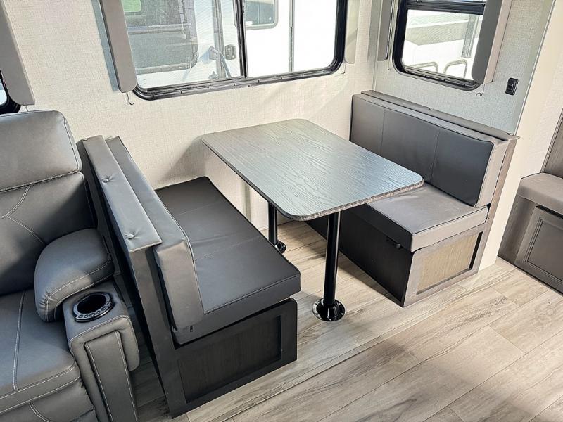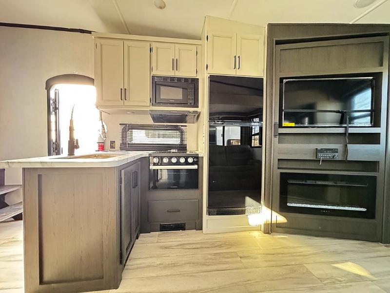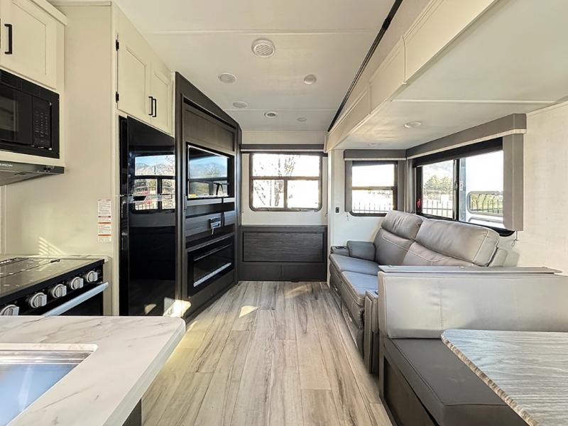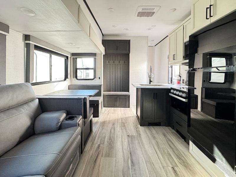 Trips to the lake are made complete in this spacious fifth wheel that can sleep five each night. You'll enjoy your own private bedroom up front that includes a queen bed, a wardrobe, plus bedside wardrobes and nightstands for your things. After you've made dinner on the cooktop, you can dine at the booth dinette. There is additional seating on the tri-fold sofa, and both of these areas can double as sleeping space for guests. If you're wanting a little more comfort, just choose the optional theater seating in place of the sofa. A flip-up desk in the back will let you get some work done if needed, and the hidden walk-in pantry behind the TV/fireplace is a huge convenience!