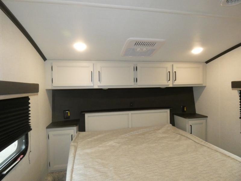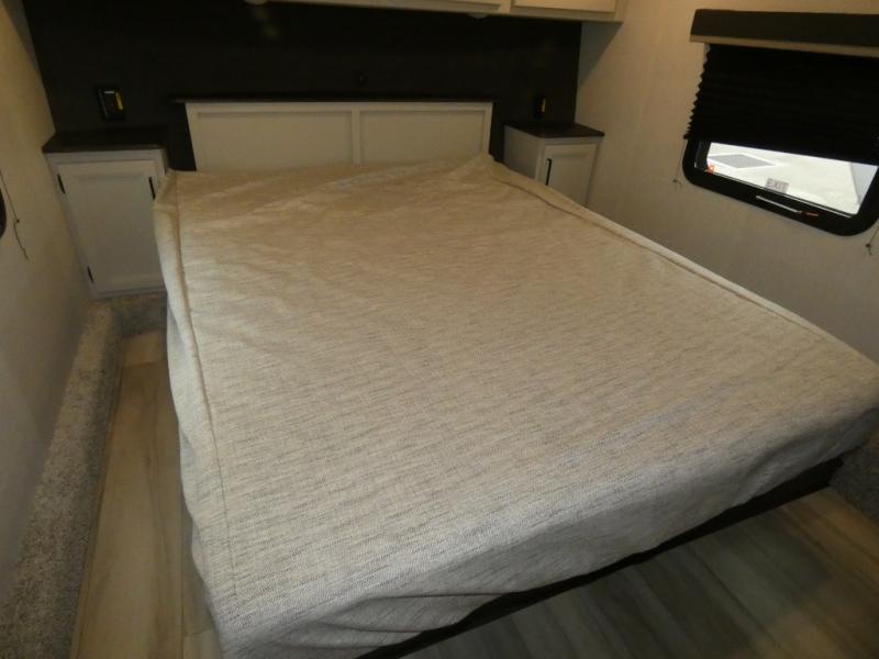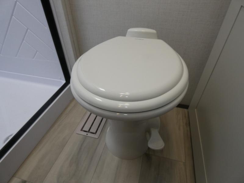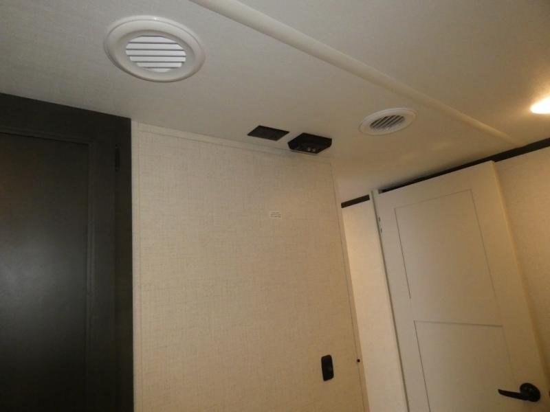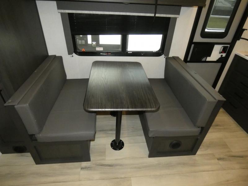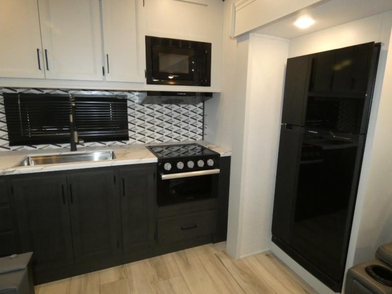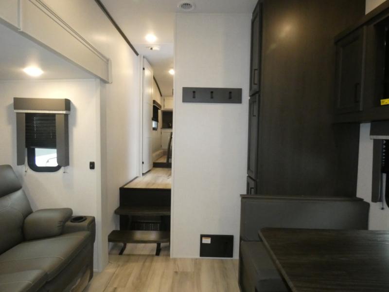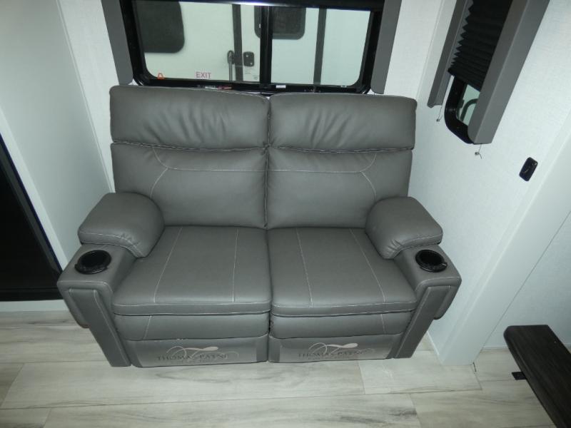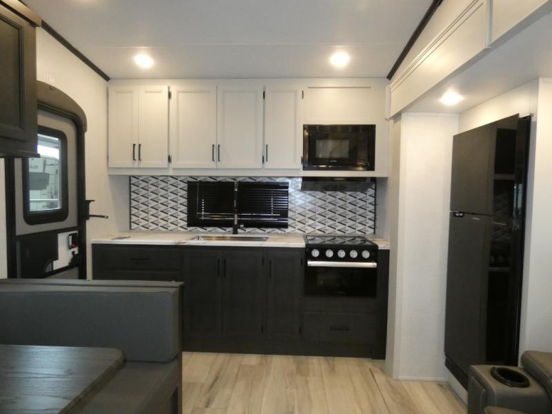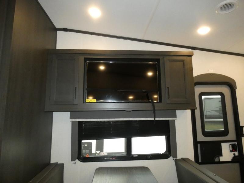 This rear kitchen fifth wheel includes ample counter space to prep meals and feed your crew. There is a theater seat slide for added space and a TV right across the sofa for easy viewing. Once lunch is ready, you can dine at the booth dinette or head outdoors to sit under the 17' electric awning. The full bath lets you clean up each day, and you'll feel right at home having your own private bedroom up front with a queen bed!