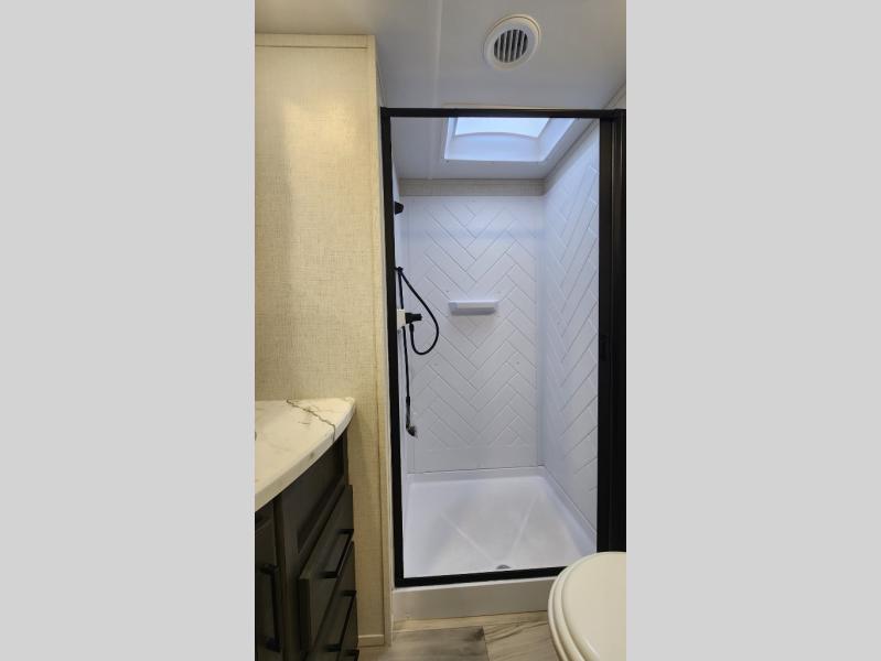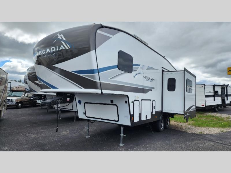 With any Arcadia Select fifth wheel by Keystone you will enjoy easy towability and at-home comforts at an affordable price! The laminated sidewalls with five sided aluminum superstructure will provide a strong foundation so you can enjoy your RV for years to come, plus a one-piece, heated and enclosed polypropylene underbelly means you can camp year around! And an upgraded Roto-Flex hitch pin with will make it easy to tow. Head inside to find tall slides for added space, seamless, pressed countertops, convenient underbed storage, and a large shower with a retractable door and skylight. These fifth wheels also include a Blade Pure A/C system, Girard on-demand tankless water heater, two 30 lb. LP tanks, and more utilities to make your camping experience run smoothly.