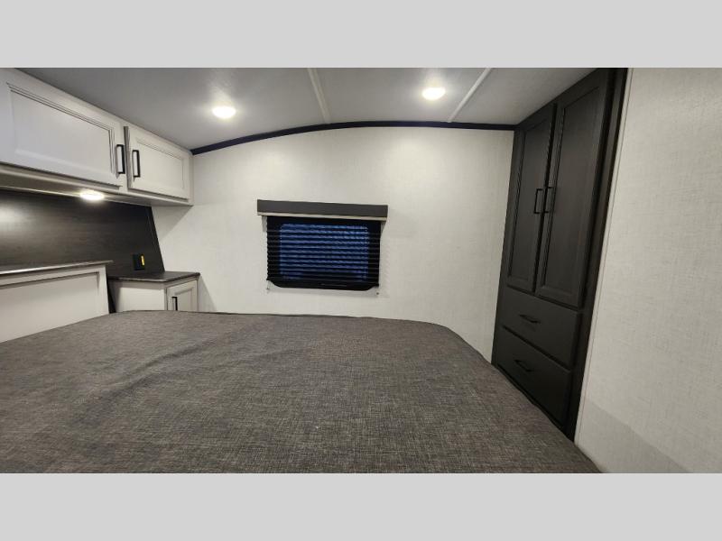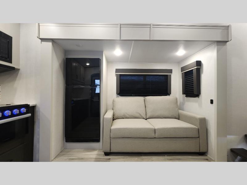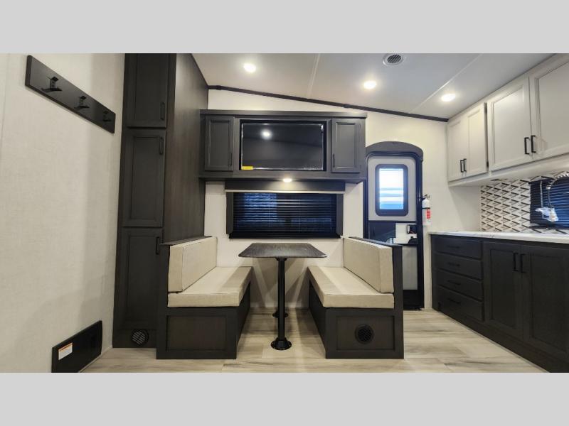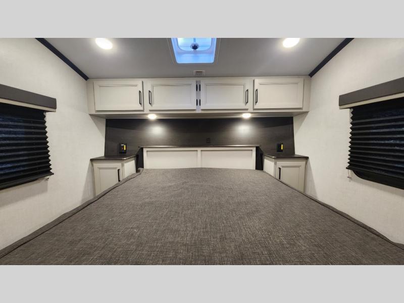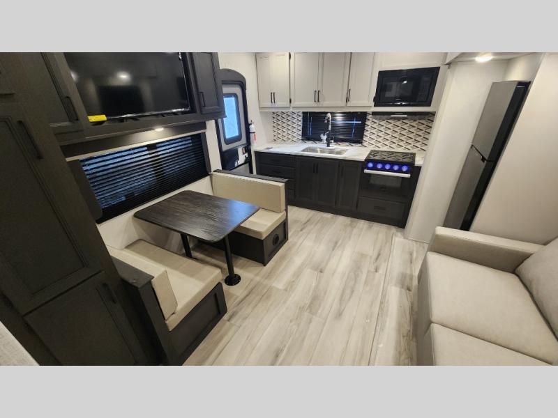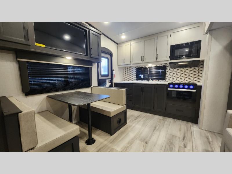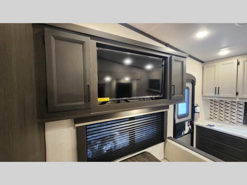 This rear kitchen fifth wheel includes ample counter space to prep meals and feed your crew. There is a tri-fold sleeper sofa slide for added space and a TV right across the sofa for easy viewing, or you can choose the optional theater seating if you don't need the extra sleeping space. Once lunch is ready, you can dine at the booth dinette or head outdoors to sit under the 17' electric awning. The full bath lets you clean up each day, and you'll feel right at home having your own private bedroom up front with a queen bed!