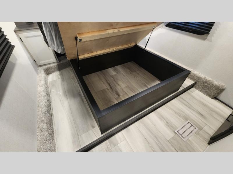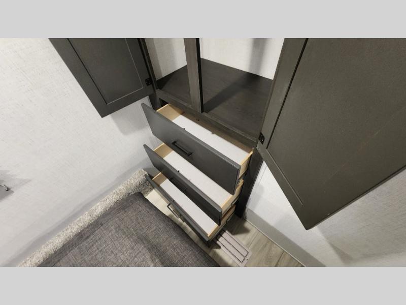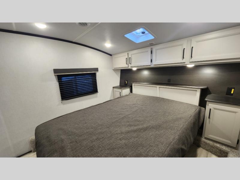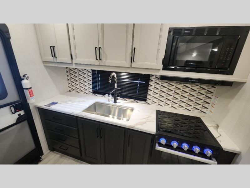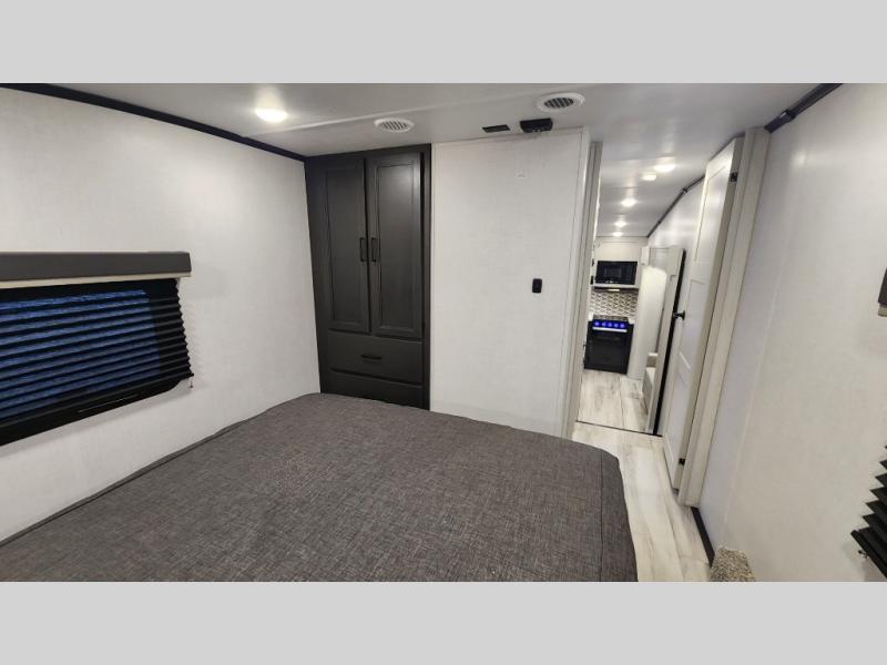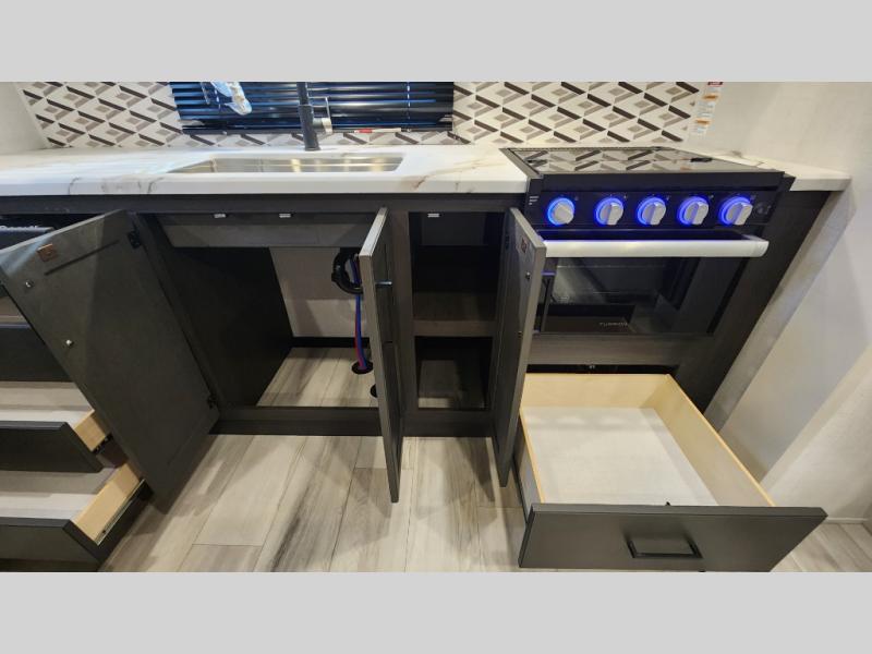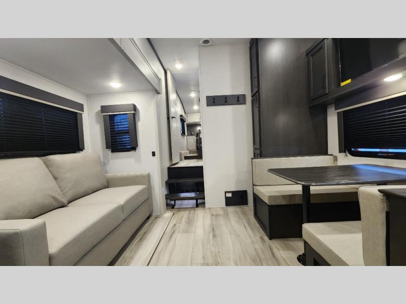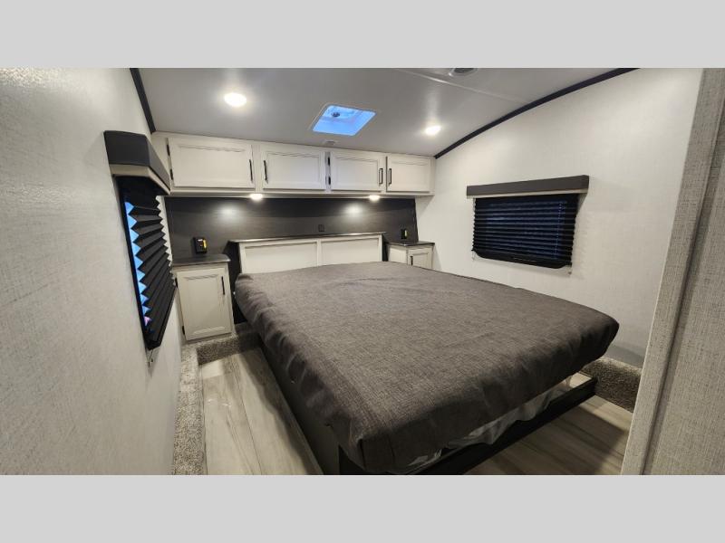 This rear kitchen fifth wheel includes ample counter space to prep meals and feed your crew. There is a tri-fold sleeper sofa slide for added space and a TV right across the sofa for easy viewing, or you can choose the optional theater seating if you don't need the extra sleeping space. Once lunch is ready, you can dine at the booth dinette or head outdoors to sit under the 17' electric awning. The full bath lets you clean up each day, and you'll feel right at home having your own private bedroom up front with a queen bed!