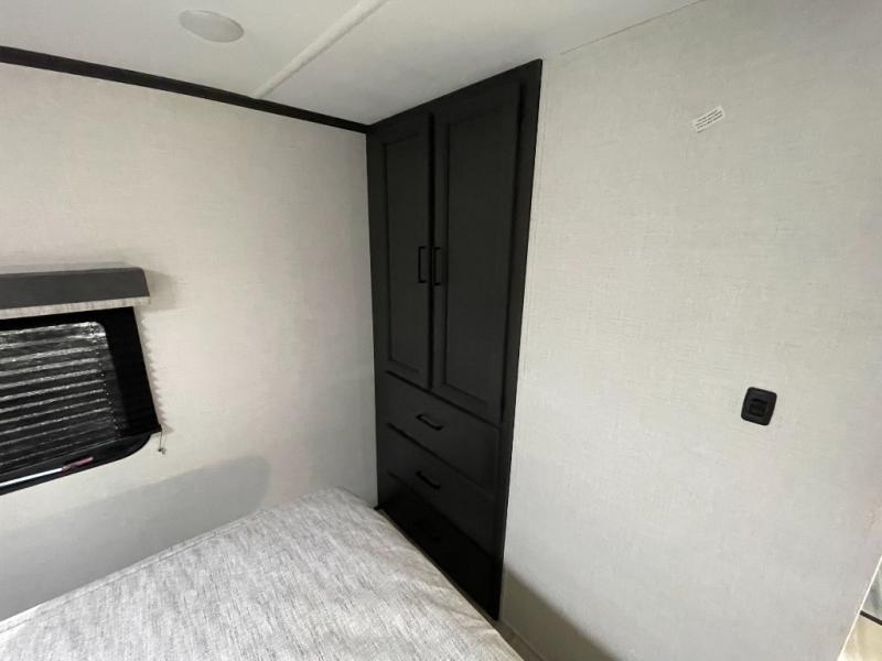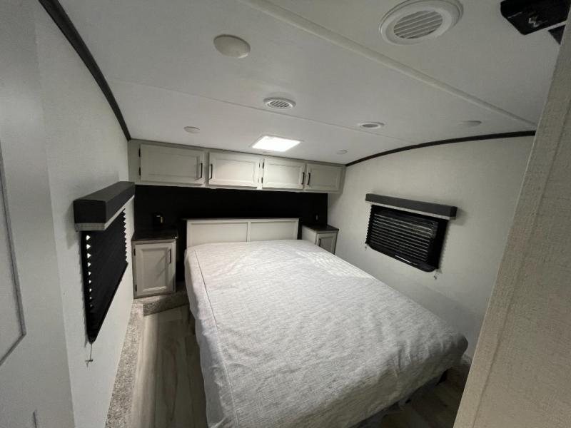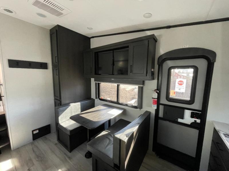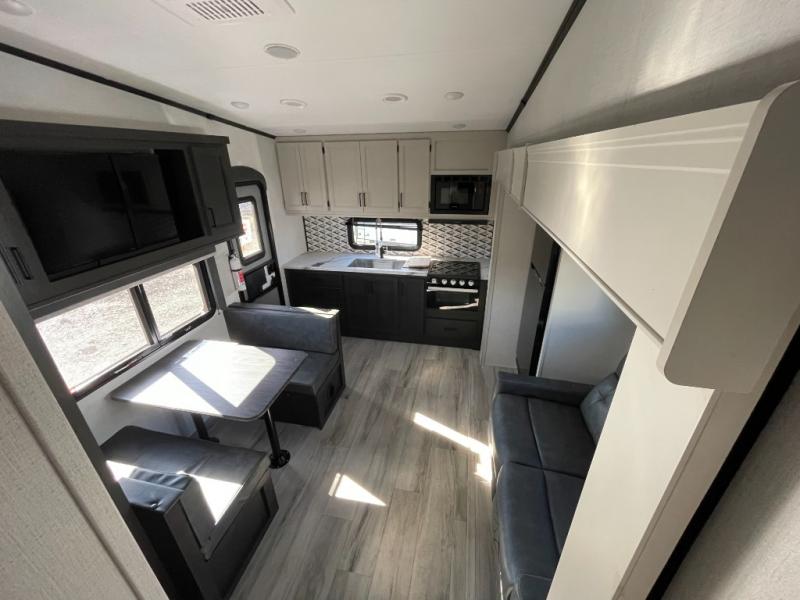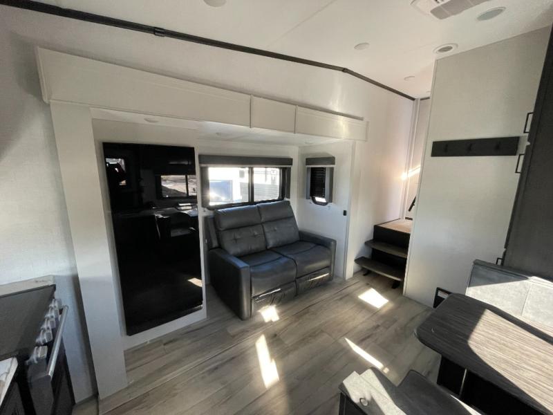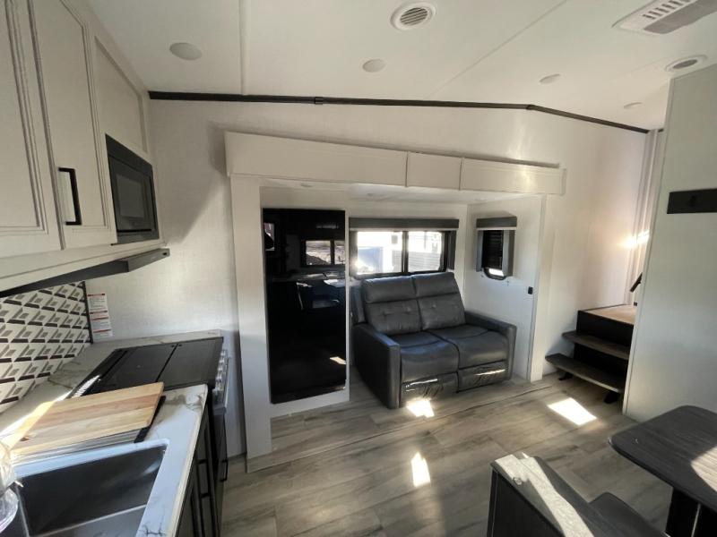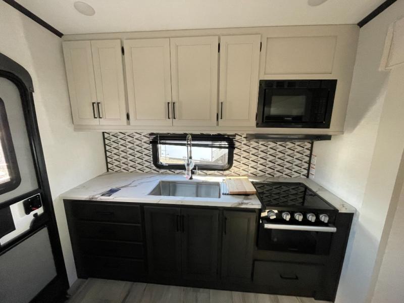 This rear kitchen fifth wheel includes ample counter space to prep meals and feed your crew. There is a tri-fold sleeper sofa slide for added space and a TV right across the sofa for easy viewing, or you can choose the optional theater seating if you don't need the extra sleeping space. Once lunch is ready, you can dine at the booth dinette or head outdoors to sit under the 17' electric awning. The full bath lets you clean up each day, and you'll feel right at home having your own private bedroom up front with a queen bed!
