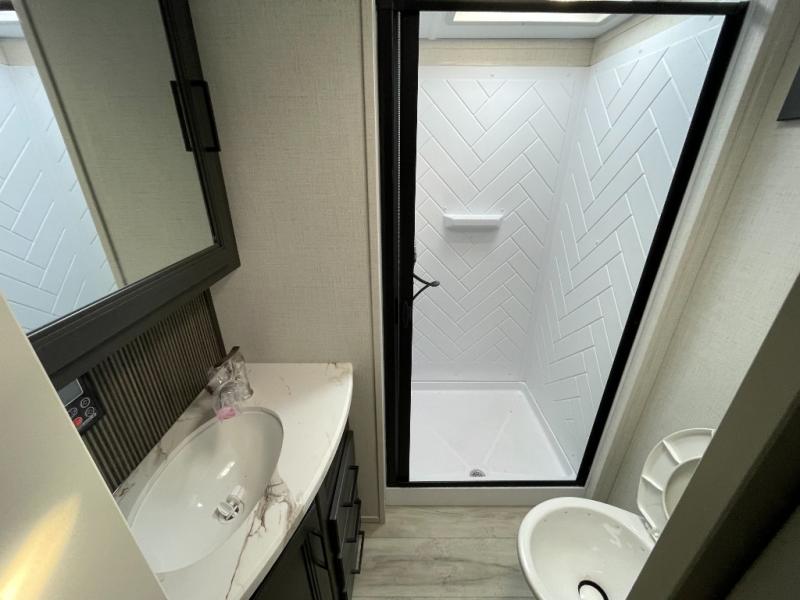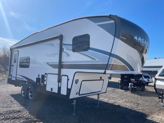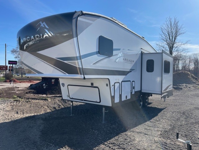 With any Arcadia Select fifth wheel by Keystone you will enjoy easy towability and at-home comforts at an affordable price! The laminated sidewalls with five sided aluminum superstructure will provide a strong foundation so you can enjoy your RV for years to come, plus a one-piece, heated and enclosed polypropylene underbelly means you can camp year around! And an upgraded Roto-Flex hitch pin with will make it easy to tow. Head inside to find tall slides for added space, seamless, pressed countertops, convenient underbed storage, and a large shower with a retractable door and skylight. These fifth wheels also include a Blade Pure A/C system, Girard on-demand tankless water heater, two 30 lb. LP tanks, and more utilities to make your camping experience run smoothly.