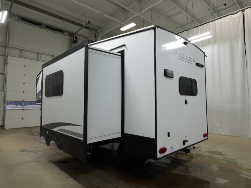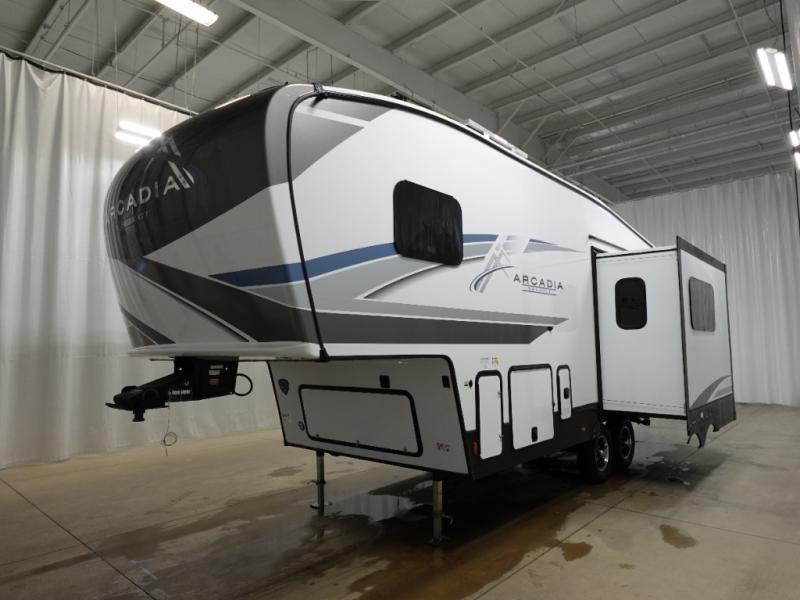 With any Arcadia Select fifth wheel by Keystone you will enjoy easy towability and at-home comforts at an affordable price! The laminated sidewalls with five sided aluminum superstructure will provide a strong foundation so you can enjoy your RV for years to come, plus a one-piece, heated and enclosed polypropylene underbelly means you can camp year around! And an upgraded Roto-Flex hitch pin with will make it easy to tow. Head inside to find tall slides for added space, seamless, pressed countertops, convenient underbed storage, and a large shower with a retractable door and skylight. These fifth wheels also include a Blade Pure A/C system, Girard on-demand tankless water heater, two 30 lb. LP tanks, and more utilities to make your camping experience run smoothly.