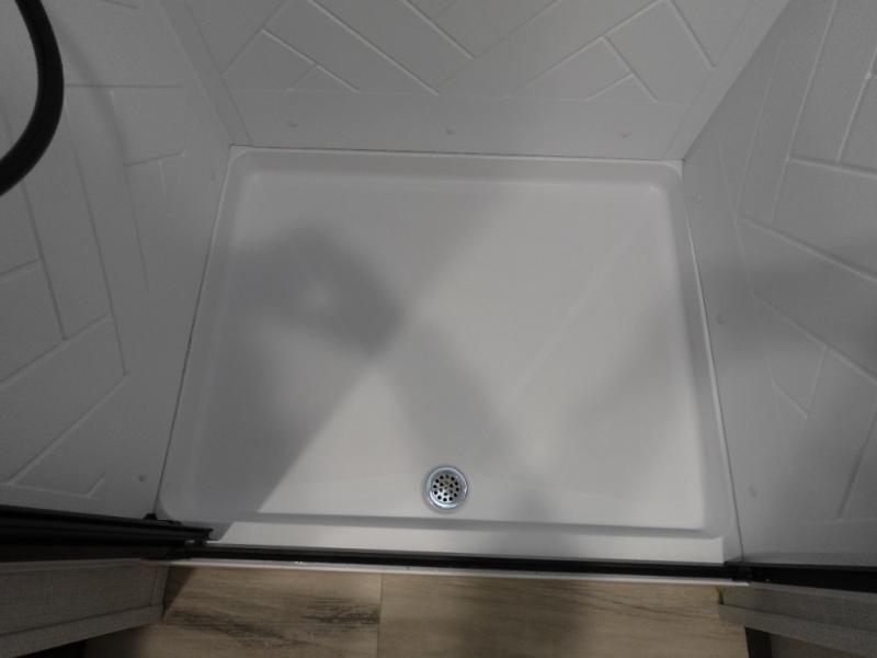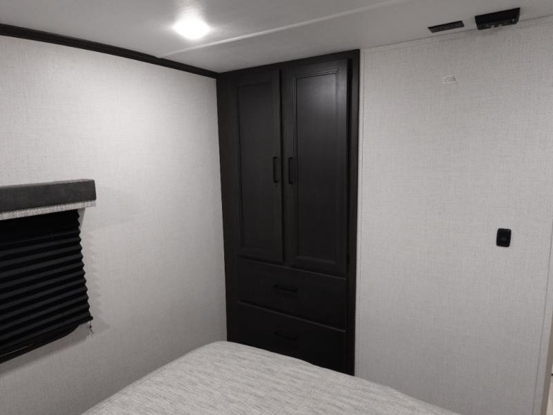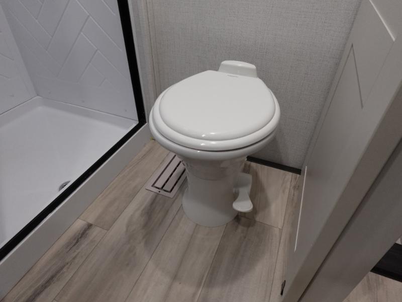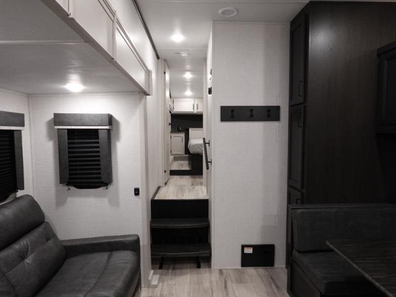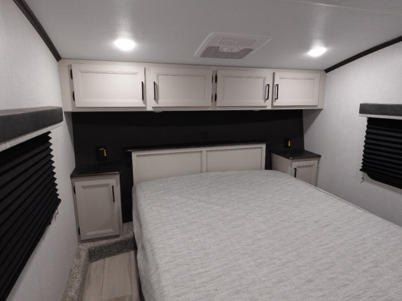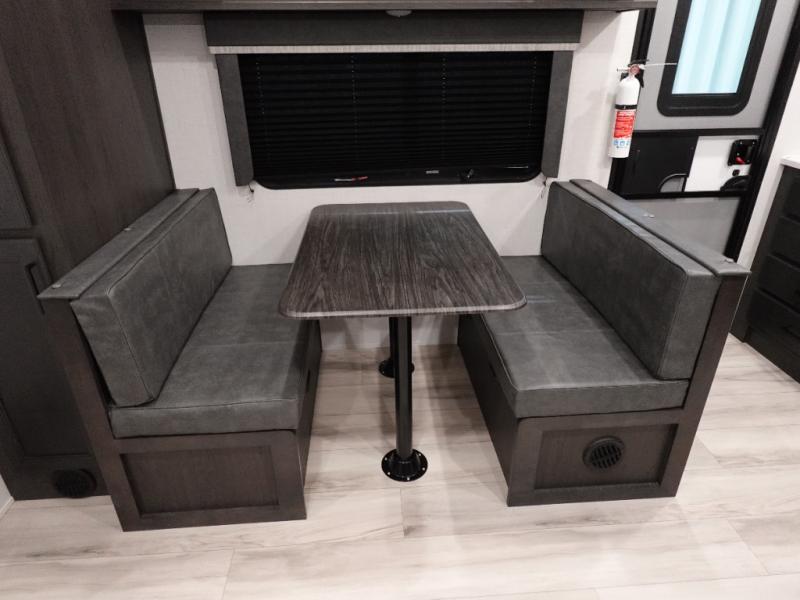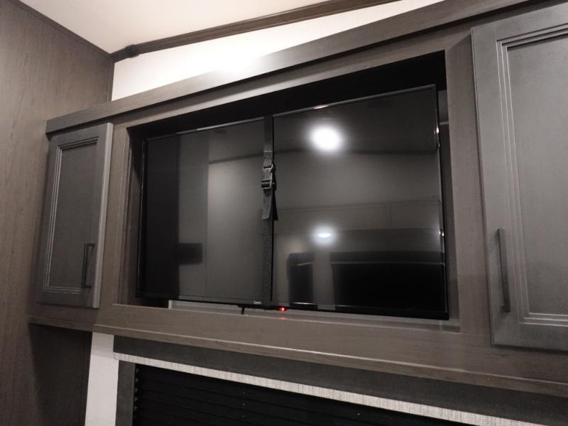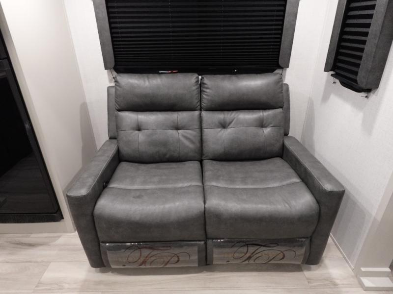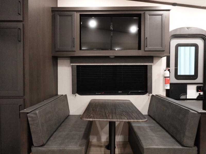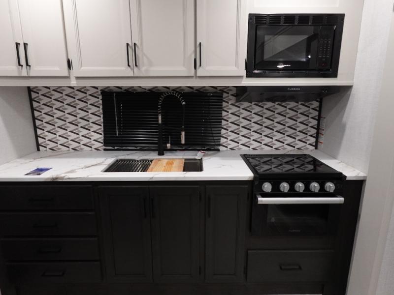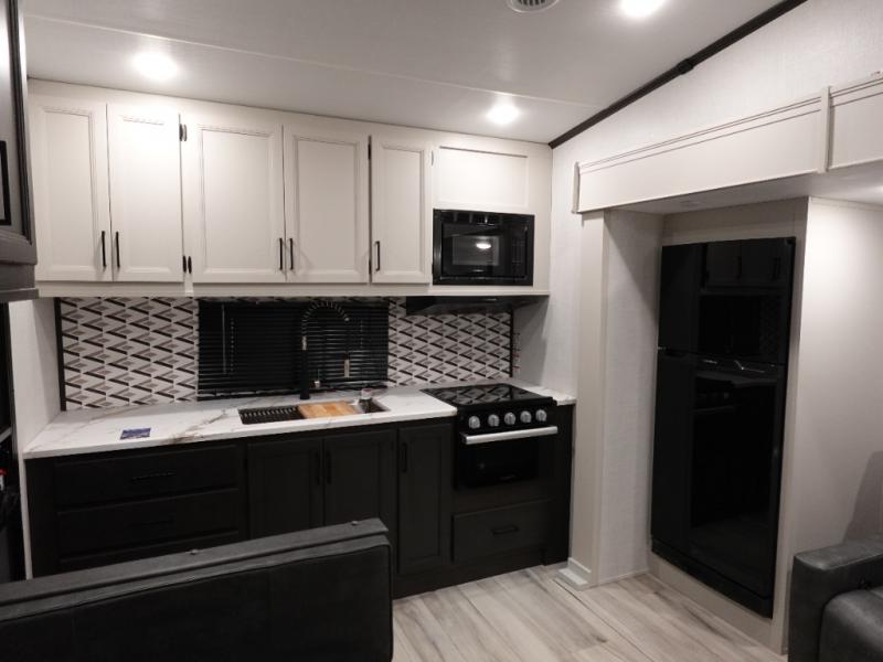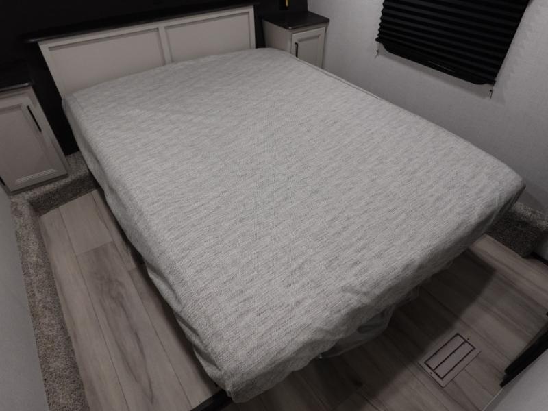 This rear kitchen fifth wheel includes ample counter space to prep meals and feed your crew. There is a tri-fold sleeper sofa slide for added space and a TV right across the sofa for easy viewing, or you can choose the optional theater seating if you don't need the extra sleeping space. Once lunch is ready, you can dine at the booth dinette or head outdoors to sit under the 17' electric awning. The full bath lets you clean up each day, and you'll feel right at home having your own private bedroom up front with a queen bed!